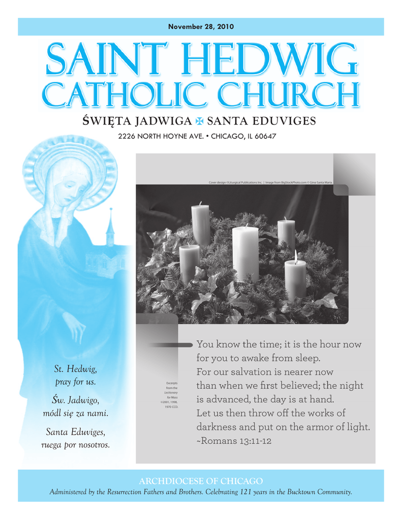 November 28, 2010 ŚWIĘTA JADWIGA SANTA EDUVIGES 2226 NORTH HOYNE AVE. • CHICAGO, IL 60647 St. Hedwig, pray for us. Św. Jadwigo, módl się za nami. Santa Eduviges, ruega por nosotros. ARCHDIOCESE OF CHICAGO Administered by the Resurrection Fathers and Brothers. Celebrating 121 years in the Bucktown Community. 2 NOTES AND EVENTS CHRISTMAS TOY DRIVE Every year the Catholic Charities of Chicago has a toy drive to provide local children with gifts during the Holiday Season. Last year over 8,000 children received unwrapped, new toys to make the Holiday Season special. CATECHISM CLASSES English Classes 9:15 AM - 10: 45 AM and assistance to the 11:00 AM Mass Spanish Classes 11:15 AM - 12:45 PM and assistance to the 1:00 PM Mass This year our Parish would like to participate in this drive to bring joy to disadvantaged children and their families. Here is how you can help: We will be collecting toys through December 13, 2010. You can drop them off at the Parish Office, in the special box in the church or give them to an usher at Mass. The toys must be new, unwrapped and in their original packaging for safety reason. We will donate half of the toys to the Catholic Charities and keep the other half for families in our Parish. We need toys to learn from, play with or cuddle, but no dangerous games or toys that resemble weapons. Please consider donating a toy. Taize Prayer Group Join us Sunday January 2nd for our next Taize Prayer Group! Taize Prayer Group at St. Hedwig invites young adults to meet, pray, sing and talk every first Sunday of the month from 7:00 pm to 8:00 pm. The doors of the church open at 6:30 pm. Please come to experience the power and peace of meditative prayer, to hear interesting talks, to meet new friends and to enjoy the time we spend together. Purgatorial Society December 5, 2010 Purgatorial Society meeting & Christmas celebration at noon in the Parish Rectory. Adult English Classes have started. We meet every Wednesday in the convent 7:00 PM to 8:30 PM. Remember that the Mass in PART of the Class. For more information about Catechism classes, Baptisms, or Adult classes call Ana Flores at the Parish Offices from 11:00 AM - 3:00 PM or call her cell. 773-495-3659 SACRAMENTS RECONCILIATION: Monday-Saturday before Mass; Saturday 4:30 PM or by appointment. ANOINTING OF THE SICK: Please call to receive this sacrament of healing if a family member is ill or preparing for surgery. MARRIAGE: ARE YOU A REGISTERED PARISHIONER? Use of the offertory envelopes each week lets us know that you are an active member of our Parish. This prevents misunderstandings when someone wants to be married, have a child baptized or is asked to become a Godparent. Registration also enables us to provide letters for you for tax purposes. If you are registered and not receiving your envelopes, if any identifying information in your life has changed including, if you have moved or if you would like to become a registered parishioner, please complete registration forms found in the vestibule of the Church. We are asking all of our Parishioners to please reregister, so that we can update our records. Thank you. Please contact the parish office at least 6 months before the planned wedding date. BAPTISM: Please call the Parish Office. Baptism (English): 4th Sunday at 11:00 AM Mass. Preparation Class: 3rd Monday at 7:00 PM in the convent. Godparents must be married by the church or be living as single. PA R I S H I N F O R M AT I O N 3 OUR SYMPATHY PARISH CALENDAR CHOIR PRACTICE: Every Wednesday at 7:30 PM in the Church CORO: Español: Todos los Miercoles en el sotano del convento. We pray for the deceased from our Parish who recently passed away: CHILDREN OF FATIMA: Ist Saturday of the month 4 PM in the Convent Mass at 5:00 P.M. Our prayers are also extended to their family members who grieve the loss of their loved ones. PARISH SOCIETIES DOLMA: Ist Saturday of the month, Novena at 4:00 PM BAPTISM CLASS: Monday, November 15 At 7:00 PM in Convent. CLASES DE BAUTIZO: Español: Noviembre 3, 2010 a las 7:00 PM en el convento. Advent’s Marian Antiphon The Holy Spirit shall descend upon you, O Mary; fear not, you shall have in your womb the Son of God, Alleluia. † Michael H. Bernacki, MD † Sharon M. Marek † Deamonda Smith † Sabina Logisz May the angels welcome them into paradise. May perpetual light shine upon them O Lord, and may their rest in peace. AMEN My Dear Parishioners: Praise Be Jesus Christ!! As we celebrate Thanksgiving, I would like to take this opportunity to express my gratitude to all the blessings that St Hedwig Parish has received since the time I arrived here. Thank you for all your patience and understanding during the time of rebuilding and renovating our church. The restoration of the church was not an easy job. So much time, effort, and sleepless nights were spent by all of you which served and remained to be my inspiration to work harder for our parish. Thank you for your continued financial support in spite of the economic hardship. God is so good that the parish is able to improve and renovate its facilities like the convent, rectory, and church premises. Most of all, thank you for your prayers and your community participations in improving our Spiritual, Pastoral and Religious services in our parish. We have improved our CCD (Confraternity of Christian Doctrine) classes for children and RCIA ( Rite of Christian Initiation of Adults ). We have spiritual services and projects designed for children, young adults and adults in our neighborhood. We now have program in place which are opportunities to meet the many faces of our neighbors and families in our community. St Hedwig Parish is gifted with many parishioners who understand and respect the diversity of this community. As a community of faith, we are called to live the Gospel message. With the help of our Parish Pastoral Council, I am defining my vision for our parish to put up a solid Pastoral Program. I will start this 3-year