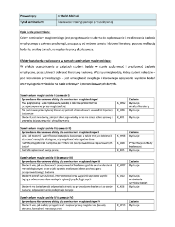 Prowadzący: dr Rafał Albiński Tytuł seminarium: Poznawcze treningi pamięci prospektywnej Opis i cele przedmiotu: Celem seminarium magisterskiego jest przygotowanie studenta do zaplanowanie i zrealizowania badania empirycznego z zakresu psychologii, począwszy od wyboru tematu i doboru literatury, poprzez realizację badania, analizę danych, na napisaniu pracy skończywszy. Efekty kształcenia realizowane w ramach seminarium magisterskiego: W efekcie uczestniczenia w zajęciach student będzie w stanie zaplanować i zrealizować badanie empiryczne, przeszukiwać i dobierać literaturę naukową. Ważną umiejętnością, którą student nabędzie – pod kierunkiem prowadzącego – jest umiejętność zwięzłego i klarownego opisywania wyników badań oraz wyciągania wniosków na bazie zebranych i przeanalizowanych danych. Seminarium magisterskie I (semestr I) Sprawdzane kierunkowe efekty dla seminarium magisterskiego I Ma pogłębioną i uporządkowaną wiedzę z zakresu problematyki przygotowywanej pracy magisterskiej Na podstawie przeczytanej literatury potrafi sformułować i uzasadnić hipotezy badawcze Student jest świadomy, jaki jest stan jego wiedzy oraz ma zdaje sobie sprawę z potrzeby jej poszerzania i aktualizowania K_U06 Zadanie Dyskusje, Analiza literatury Dyskusje K_K01 Dyskusje K_W08 Zadanie Dyskusje K_W02 Seminarium magisterskie II (semestr II) Sprawdzane kierunkowe efekty dla seminarium magisterskiego II Wie, jak tworzyć i weryfikować narzędzia badawcze, a także wie jak dobierać i stosować narzędzia dostępne, aby uzyskiwać wiarygodne dane Potrafi przygotować narzędzia potrzebne do przeprowadzenia zaplanowanych badań Potrafi zaplanować swoją pracę. K_U08 K_K05 Prezentacja metody badawczej Dyskusje K_W07 Zadanie Dyskusje Seminarium magisterskie III (semestr III) Sprawdzane kierunkowe efekty dla seminarium magisterskiego III Student wie, jak zaplanować i przeprowadzić badanie zgodnie ze standardami metodologicznymi oraz w jaki sposób analizować dane pochodzące z przeprowadzonego badania Student potrafi wyszukiwać, interpretować oraz wyjaśnić uzyskane wyniki będące odwzorowaniem realnych sytuacji psychologicznych Student ma świadomość odpowiedzialności za prowadzone badania i za osoby badane, odpowiedzialnie podejmuje decyzje K_U02 K_K08 Dyskusje, omówienie wyników badań Dyskusje K_W13 Zadanie Dyskusje Seminarium magisterskie IV (semestr IV) Sprawdzane kierunkowe efekty dla seminarium magisterskiego IV Student wie, jak należy przygotować i napisać pracę magisterską (zasady etyczne, formalne i merytoryczne) Student potrafi przeanalizować i zinterpretować uzyskane wyniki, przeprowadzić ich dyskusję zgodnie z obowiązującymi go zasadami etyki i względami formalnymi Potrafi napisać pracę magisterską Świadomie stosuje się do zasad etyki zawodowej i w ich świetle rozpatruje napotykane trudności w realizacji projektu K_U07 K_U12 K_K07 Napisanie i złożenie pracy magisterskiej Dyskusje Tematyka i przykładowe pytania badawcze: Seminarium magisterskie poświęcone jest tematyce pamięci prospektywnej, a konkretnie poznawczemu trenowaniu tej formy pamięci w grupach osób w okresie wczesnej (20-25 lat) i późnej (65-75 lat) dorosłości. Realizowane badanie są częścią projektu badawczego otrzymanego z Narodowego Centrum Nauki (NCN, program SONATA), badanie będą realizowane od października 2014 do końca 2015 roku (różne grupy badanych w różnych terminach). Wymagania wobec uczestników seminarium: Proponowane seminarium jest świetnym rozwiązaniem dla ambitnych i pracowitych studentów, którzy chcą wziąć udział w nowatorskich badaniach naukowych, mających zakończyć się publikacjami naukowymi. Badania dostarczą jednocześnie okazję do sprawdzenia się w wymagających warunkach związanych z koordynacją prac z badanymi, prowadzeniem samych treningów, itp. Studenci otrzymają wsparcie w zakresie planowania badań, będą odpowiedzialni za prowadzenie konkretnych grup treningowych (jedna grupa to ok. 1,5 miesiąca badań). Poszukujemy studentów, którzy są zdecydowani szybko i sprawnie zrealizować badania i w terminie oddać pracę magisterską. Planujemy pracę w małym, zgranym zespole, w warunkach wzajemnego wsparcia i pomocy (opiekunowie: dr Rafał Albiński oraz mgr Kamila Makowska). Możliwe jest także nawiązanie dłuższej współpracy badawczej (np. kontynuacja w ramach studiów doktoranckich) dla najlepszych studentów. UWAGA: dodatkowo za udział w programie badawczym oferujemy certyfikat wystawiony przez centrum ICACS, będący dokumentem poświadczającym udział w programie badawczym. Wstępny harmonogram pracy i warunki zaliczenia: Semestr 1. Opracowanie tematyki i zakresu projektu, dokonanie przeglądu literatury. Semestr 2. Napisanie wstępu teoretycznego i części opisujące szczegółowo przebieg badania i używane narzędzia, badanie pilotażowe. Semestr 3. Przeprowadzenie badania, analiza danych. Semestr 4. Sfinalizowanie analizy danych, opisanie wyników badania i dyskusji. „Zamknięcie” pracy. Do zaliczenia poszczególnych semestrów konieczne jest spełnienie opisanych wyżej warunków. Podstawowa literatura do zajęć: Engle, R.W, Sędek, G., von Hecker, U. i McIntosh, D.N. (2006). Ograniczenia poznawcze. Starzenie się i psychopatologia. Warszawa: PWN. Niedźwieńska, A. (2013). Pamięć prospektywna. Warszawa: Sedno Piber-Dąbrowska, K. i Brzezicka-Rotkiewicz, A. (2005). Zawieszony umysł. Pozaosobowościowe dystraktory sprawności intelektualnej. Warszawa: Academica. Salthouse, T. (2006). Major issues in cognitive aging. Oxford: Oxford University Press. Stuart-Hamilton, I. (2006). Psychologia starzenia się. Poznań: Zysk i S-ka. Biogram Promotora: dr Rafał Albiński Adiunkt w Szkole Wyższej Psychologii Społecznej (Interdyscyplinarne Centrum Stosowanych Badań Poznawczych, ICACS) Wykształcenie: mgr (psychologia), 2006, SWPS; doktorat (psychologia), 2011, SWPS Zai