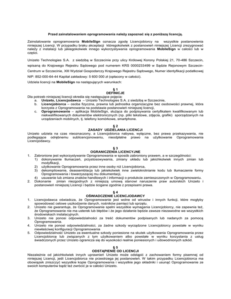 Przed zainstalowaniem oprogramowania należy zapoznać się z poniższą licencją. Zainstalowanie oprogramowania MobileSign oznacza zgodę Licencjobiorcy na wszystkie postanowienia niniejszej Licencji. W przypadku braku akceptacji któregokolwiek z postanowień niniejszej Licencji zrezygnować należy z instalacji lub jakiegokolwiek innego wykorzystywania oprogramowania MobileSign w całości lub w części. Unizeto Technologies S.A. z siedzibą w Szczecinie przy ulicy Królowej Korony Polskiej 21, 70-486 Szczecin, wpisaną do Krajowego Rejestru Sądowego pod numerem KRS 0000233499 w Sądzie Rejonowym SzczecinCentrum w Szczecinie, XIII Wydział Gospodarczy Krajowego Rejestru Sądowego, Numer identyfikacji podatkowej NIP: 852-000-64-44 Kapitał zakładowy: 5 600 000 zł (opłacony w całości). Udziela licencji na MobileSign na następujących warunkach: §1 DEFINICJE Dla potrzeb niniejszej licencji określa się następujące pojęcia: a. Unizeto, Licencjodawca – Unizeto Technologies S.A. z siedzibą w Szczecinie, b. Licencjobiorca – osoba fizyczna, prawna lub jednostka organizacyjne bez osobowości prawnej, która korzysta z Oprogramowania na podstawie postanowień niniejszej licencji, c. Oprogramowanie – aplikacja MobileSign, służąca do podpisywania certyfikatem kwalifikowanym lub niekwalifikowanych dokumentów elektronicznych (np. pliki tekstowe, zdjęcia, grafiki) sporządzanych na urządzeniach mobilnych, tj. telefony komórkowe, smartphone. §2 ZASADY UDZIELANIA LICENCJI Unizeto udziela na czas nieoznaczony, a Licencjobiorca nabywa, wyłączne, bez prawa przekazywania, nie podlegające odrębnemu sublicencjonowaniu, nieodpłatne prawo na użytkowanie Oprogramowania Licencjodawcy. 1. 2. 1. 2. 3. 4. 5. §3 OGRANICZENIA LICENCYJNE Zabronione jest wykorzystywanie Oprogramowania w sposób zabroniony prawem, a w szczególności: 1) dokonywanie tłumaczeń, przystosowywania, zmiany układu lub jakichkolwiek innych zmian lub modyfikacji, 2) użytkowanie Oprogramowania przez inne osoby niż Licencjobiorca, 3) dekompilowanie, deassemblacja lub jakiekolwiek inne zwielokrotnianie kodu lub tłumaczenie formy Oprogramowania i towarzyszącej mu dokumentacji, 4) usuwanie lub zmiana znaków handlowych i informacji o produkcie zamieszczonych w Oprogramowaniu. Dokonanie zmian niezgodnych z niniejszą umową stanowi naruszenie praw autorskich Unizeto i postanowień niniejszej Licencji i będzie ścigane zgodnie z przepisami prawa. §4 OŚWIADCZENIE LICENCJODAWCY Licencjodawca oświadcza, że Oprogramowanie jest wolne od wirusów i innych funkcji, które mogłyby spowodować celowe uszkodzenie danych, nośników pamięci lub sprzętu. Unizeto nie gwarantuje, że Oprogramowanie spełni wszystkie wymagania Licencjobiorcy, nie zapewnia też, że Oprogramowanie nie ma usterek lub błędów i że jego działanie będzie zawsze niezawodne we wszystkich środowiskach instalacyjnych. Unizeto nie ponosi odpowiedzialności za treść dokumentów podpisanych lub nadanych za pomocą Oprogramowania. Unizeto nie ponosi odpowiedzialności, za żadne szkody wyrządzone Licencjobiorcy powstałe w wyniku niewłaściwej konfiguracji Oprogramowania Odpowiedzialność Unizeto za ewentualne szkody poniesione na skutek użytkowania Oprogramowania przez Licencjobiorcę lub związanych z tym użytkowaniem albo powstałe w wyniku korzystania z usług świadczonych przez Unizeto ogranicza się do wysokości realnie poniesionych i udowodnionych szkód. §5 ODSTĄPIENIE OD LICENCJI Niezależnie od jakichkolwiek innych uprawnień Unizeto może odstąpić z zachowaniem formy pisemnej od niniejszej Licencji, jeśli Licencjobiorca nie przestrzega jej postanowień. W takim przypadku Licencjobiorca ma obowiązek zniszczyć wszystkie kopie Oprogramowania i wszystkie jego składniki i usunąć Oprogramowanie ze swoich komputerów bądź też zwrócić je w całości Unizeto. §6 ZASTRZEŻENIE PRAW I WŁASNOŚĆ Unizeto zastrzega sobie wszystkie prawa własnościowe i autorskie, wynikające z obowiązujących przepisów, za wyjątkiem tych, których udzielił Licencjobiorcy w sposób wyraźny na mocy niniejszej Licencji. Oprogramowanie jest chronione prawem autorskim oraz innymi ustawami i umowami o ochronie własności intelektualnej. Prawa własności, prawa autorskie i inne prawa własności intelektualnej do Oprogramowania należą do Unizeto zgodnie z prawem polskim i międzynarodowym. Oprogramowanie jest licencjonowane, a nie sprzedawane. Na mocy niniejszej Licencji nie udziela się Licencjobiorcy żadnych praw do znaków towarowych i usługowych Unizeto. Dopuszczalne jest wykorzystanie nazwy Oprogramowania na stronach internetowych Licencjobiorcy pod warunkiem umieszczenia oznaczenia praw autorskich należących do Unizeto oraz zamieszczenia odnośnika do strony internetowej Unizeto - http://www.unizeto.pl/. 1. 2. 3. §7 POSTANOWIENIA KOŃCOWE W zakresie nie uregulowanym postanowieniami niniejszej Licencji zastosowanie znajdują odpowiednie przepisy kodeksu cywilnego oraz ustawy o prawie autorskim i prawach pokrewnych. Ewentualne spory między stronami będą rozstrzygane polubownie, a jeżeli Strony nie rozstrzygną sporu w terminie do 3 miesięcy od jego powstania, będzie on rozstrzygnięty przez sąd właściwy dla siedziby Unizeto, w trybie i na zasadach określonych przez prawo cywilne i karne. Licencję sporządzono w dwóch jednobrzmiących egzemplarzach, po jednym dla każdej ze Stron.
