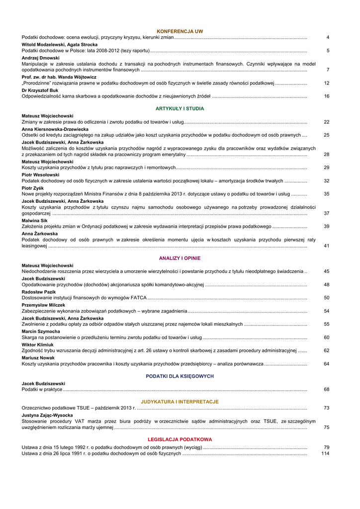 KONFERENCJA UW Podatki dochodowe: ocena ewolucji, przyczyny kryzysu, kierunki zmian ................................................................................................... 4 Witold Modzelewski, Agata Strocka Podatki dochodowe w Polsce: lata 2008-2012 (tezy raportu) ..................................................................................................................... 5 Andrzej Dmowski Manipulacje w zakresie ustalania dochodu z transakcji na pochodnych instrumentach finansowych. Czynniki wpływające na model opodatkowania pochodnych instrumentów finansowych ............................................................................................................................ 7 Prof. zw. dr hab. Wanda Wójtowicz „Prorodzinne” rozwiązania prawne w podatku dochodowym od osób fizycznych w świetle zasady równości podatkowej ........................ 12 Dr Krzysztof Buk Odpowiedzialność karna skarbowa a opodatkowanie dochodów z nieujawnionych źródeł ....................................................................... 16 ARTYKUŁY I STUDIA Mateusz Wojciechowski Zmiany w zakresie prawa do odliczenia i zwrotu podatku od towarów i usług............................................................................................ 22 Anna Kiersnowska-Drzewiecka Odsetki od kredytu zaciągniętego na zakup udziałów jako koszt uzyskania przychodów w podatku dochodowym od osób prawnych .... 25 Jacek Budziszewski, Anna Żarkowska Możliwość zaliczenia do kosztów uzyskania przychodów nagród z wypracowanego zysku dla pracowników oraz wydatków związanych z przekazaniem od tych nagród składek na pracowniczy program emerytalny .......................................................................................... 28 Mateusz Wojciechowski Koszty uzyskania przychodów z tytułu prac naprawczych i remontowych.................................................................................................. 29 Piotr Wesołowski Podatek dochodowy od osób fizycznych w zakresie ustalenia wartości początkowej lokalu – amortyzacja środków trwałych ................. 32 Piotr Zyśk Nowe projekty rozporządzeń Ministra Finansów z dnia 8 października 2013 r. dotyczące ustawy o podatku od towarów i usług ............ 35 Jacek Budziszewski, Anna Żarkowska Koszty uzyskania przychodów z tytułu czynszu najmu samochodu osobowego używanego na potrzeby prowadzonej działalności gospodarczej .............................................................................................................................................................................................. 37 Malwina Sik Założenia projektu zmian w Ordynacji podatkowej w zakresie wydawania interpretacji przepisów prawa podatkowego .......................... 39 Anna Żarkowska Podatek dochodowy od osób prawnych w zakresie określenia momentu ujęcia w kosztach uzyskania przychodu pierwszej raty leasingowej ................................................................................................................................................................................................. 41 ANALIZY I OPINIE Mateusz Wojciechowski Niedochodzenie roszczenia przez wierzyciela a umorzenie wierzytelności i powstanie przychodu z tytułu nieodpłatnego świadczenia .. 45 Jacek Budziszewski Opodatkowanie przychodów (dochodów) akcjonariusza spółki komandytowo-akcyjnej ............................................................................ 48 Radosław Pazik Dostosowanie instytucji finansowych do wymogów FATCA ....................................................................................................................... 50 Przemysław Milczek Zabezpieczenie wykonania zobowiązań podatkowych – wybrane zagadnienia ......................................................................................... 54 Jacek Budziszewski, Anna Żarkowska Zwolnienie z podatku opłaty za odbiór odpadów stałych uiszczanej przez najemców lokali mieszkalnych ............................................... 55 Marcin Szymocha Skarga na postanowienie o przedłużeniu terminu zwrotu podatku od towarów i usług .............................................................................. 60 Wiktor Klimiuk Zgodność trybu wzruszania decyzji administracyjnej z art. 26 ustawy o kontroli skarbowej z zasadami procedury administracyjnej ....... 62 Mariusz Nowak Koszty uzyskania przychodów pracownika i koszty uzyskania przychodów przedsiębiorcy – analiza porównawcza ................................ 64 PODATKI DLA KSIĘGOWYCH Jacek Budziszewski Podatki w praktyce ...................................................................................................................................................................................... 68 JUDYKATURA I INTERPRETACJE Orzecznictwo podatkowe TSUE – październik 2013 r. ............................................................................................................................... 73 Justyna Zając-Wysocka Stosowanie procedury VAT marża przez biura podróży w orzecznictwie sądów administracyjnych oraz TSUE, ze szczególnym uwzględnieniem rozliczania marży ujemnej ................................................................................................................................................ 75 LEGISLACJA PODATKOWA Ustawa z dnia 15 lutego 1992 r. o podatku dochodowym od osób prawnych (wyciąg) .............................................................................. Ustawa z dnia 26 lipca 1991 r. o podatku dochodowym od osób fizycznych ............................................................................................. 79 114