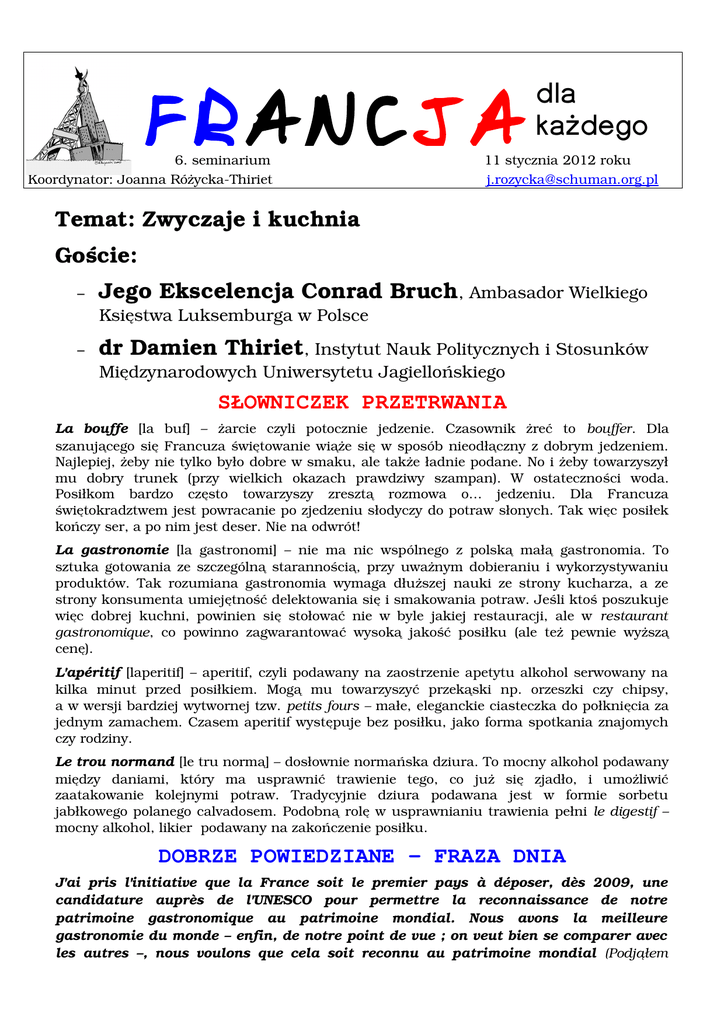 FRANCJA dla każdego 6. seminarium 11 stycznia 2012 roku Koordynator: Joanna RóżyckaThiriet [email protected] Temat: Zwyczaje i kuchnia Goście: – Jego Ekscelencja Conrad Bruch, Ambasador Wielkiego Księstwa Luksemburga w Polsce – dr Damien Thiriet, Instytut Nauk Politycznych i Stosunków Międzynarodowych Uniwersytetu Jagiellońskiego SŁOWNICZEK PRZETRWANIA La bouffe [la buf] – żarcie czyli potocznie jedzenie. Czasownik żreć to bouffer. Dla szanującego się Francuza świętowanie wiąże się w sposób nieodłączny z dobrym jedzeniem. Najlepiej, żeby nie tylko było dobre w smaku, ale także ładnie podane. No i żeby towarzyszył mu dobry trunek (przy wielkich okazach prawdziwy szampan). W ostateczności woda. Posiłkom bardzo często towarzyszy zresztą rozmowa o… jedzeniu. Dla Francuza świętokradztwem jest powracanie po zjedzeniu słodyczy do potraw słonych. Tak więc posiłek kończy ser, a po nim jest deser. Nie na odwrót! La gastronomie [la gastronomi] – nie ma nic wspólnego z polską małą gastronomia. To sztuka gotowania ze szczególną starannością, przy uważnym dobieraniu i wykorzystywaniu produktów. Tak rozumiana gastronomia wymaga dłuższej nauki ze strony kucharza, a ze strony konsumenta umiejętność delektowania się i smakowania potraw. Jeśli ktoś poszukuje więc dobrej kuchni, powinien się stołować nie w byle jakiej restauracji, ale w restaurant gastronomique, co powinno zagwarantować wysoką jakość posiłku (ale też pewnie wyższą cenę). L'apéritif [laperitif] – aperitif, czyli podawany na zaostrzenie apetytu alkohol serwowany na kilka minut przed posiłkiem. Mogą mu towarzyszyć przekąski np. orzeszki czy chipsy, a w wersji bardziej wytwornej tzw. petits fours – małe, eleganckie ciasteczka do połknięcia za jednym zamachem. Czasem aperitif występuje bez posiłku, jako forma spotkania znajomych czy rodziny. Le trou normand [le tru normą] – dosłownie normańska dziura. To mocny alkohol podawany między daniami, który ma usprawnić trawienie tego, co już się zjadło, i umożliwić zaatakowanie kolejnymi potraw. Tradycyjnie dziura podawana jest w formie sorbetu jabłkowego polanego calvadosem. Podobną rolę w usprawnianiu trawienia pełni le digestif – mocny alkohol, likier podawany na zakończenie posiłku. DOBRZE POWIEDZIANE – FRAZA DNIA J'ai pris l'initiative que la France soit le premier pays à déposer, dès 2009, une candidature auprès de l'UNESCO pour permettre la reconnaissance de notre patrimoine gastronomique au patrimoine mondial. Nous avons la meilleure gastronomie du monde – enfin, de notre point de vue ; on veut bien se comparer avec les autres –, nous voulons que cela soit reconnu au patrimoine mondial (Podjąłem inicjatywę, aby Francja była pierwszym krajem, który złoży w 2009 roku kandydaturę, żeby umożliwić uznanie naszego dziedzictwa gastronomicznego jako dziedzictwa światowego. Mamy najlepszą gastronomię na święcie – przynajmniej z naszego punktu widzenia; chcemy się porównywać z innymi – chcemy, żeby zostało to uznane za światowe dziedzictwo. fragment przemówienia prezydenta Nicolasa Sarkozy'ego podczas inauguracji 45. Międzynarodowego Salonu Rolnictwa 23 lutego 2008 roku. W istocie pomysł pojawia się już w 2006 roku i dopiero potem zyskuje poparcie polityków. Początkowo jednak UNESCO nie sprzyja takiej propozycji, stwierdzając, że nie wyróżnia takiej kategorii. A Włosi protestują w obronie własnej kuchni. Ostatecznie w 2010 roku francuska tradycja biesiadna (le repas gastronomique des Français) wpisana została na Listę Niematerialnego Dziedzictwa Ludzkości UNESCO. Została określona jako uroczyste spotkania wokół stołu z okazji ważnych momentów w życiu człowieka i wspólnoty. Uczestnicy takiego posiłku cieszą się dobrym jedzeniem oraz napitkiem, ponieważ dania zostały starannie wybrane i wykonane na podstawie produktów wysokiej jakości, a wina odpowiednio dobrane. Obowiązkowe są co najmniej 4 dania. Ponadto, dla biesiadników to okazja do wspólnego spędzenia czasu. JAK TO SIĘ JE, CZYLI O FRANCUSKICH ZWYCZAJACH La galette des Rois – 6 stycznia Francuzi i Luksemburczycy świętują, zajadając się charakterystycznym wypiekiem na bazie francuskiego ciasta z nadzieniem z masy migdałowej (masło, cukier, tarte migdały), do której wrzuca się małą figurkę albo rodzaj bobu, tzw. la fève. Spożywanie ciasta wiąże się ze specjalną procedurą. Najmłodsza z osób wchodzi pod stół i stamtąd wskazuje, komu dostanie się, który kawałek. Ma to sprawić, by porcja, w której znajduje się fève została rozdysponowana w niebudzący zastrzeżeń sposób. Osoba, która odnajduje figurkę, zostaje królem lub królową wieczoru i otrzymuje koronę (przy zakupie ciasta w sklepie korona z papieru jest dostarczana przez producenta). Zwycięzca wybiera sobie następnie królewskiego partnera. Le guide rouge de Michelin – najbardziej znany, istniejący od 1900 r., francuski przewodnik po restauracjach w czerwonej okładce, sparodiowany w filmie z 1976 r. Skrzydełko czy nóżka (L’Aile ou la cuisse) z Luis de Funès (głównym bohaterem jest wydawca przewodnika kulinarnego Charles Duchemin). Michelin przyznaje za jakość jedzenia od jednej do trzech gwiazdek. Chociaż firma zaprzecza, że zmusza szefów kuchni i restauratorów do wpompowywania w interes pieniędzy i wywiera na nich presję, faktem jest trzy gwiazdki stają się obsesją niektórych z nich, a pogoń za nimi prowadzi również do bankructwa. Picard – nawet porządne francuskie gospodynie bez wstydu sięgają po mrożonki bardzo znanej firmy Picard, które słyną z wysokiej jakości (co za tym idzie nie są najtańsze). W chłodniach tej sieci można znaleźć wszystko: mrożone warzywa, mięso, ryby, gotowe dania obiadowe, desery… I obiad bez wysiłku gotowy. Można nawet zamówić w sieci. Organizatorem seminariów jest Polska Fundacja im. Roberta 