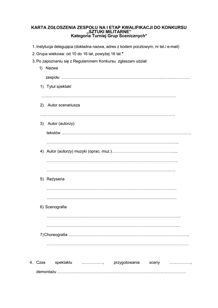KARTA ZGŁOSZENIA ZESPOŁU NA I ETAP KWALIFIKACJI DO KONKURSU „SZTUKI MILITARNE” Kategoria Turniej Grup Scenicznych* 1. Instytucja delegująca (dokładna nazwa, adres z kodem pocztowym, nr tel./ e-mail) 2. Grupa wiekowa: od 10 do 16 lat, powyżej 16 lat * 3. Po zapoznaniu się z Regulaminem Konkursu zgłaszam udział: 1) Nazwa zespołu ………………………………………………………………….………………… 1) Tytuł spektakl .…...……….………………………………………………………………………… 2) Autor scenariusza …..…………………………………………………………………………………… 3) Autor (autorzy) tekstów ……………………………………………………………………………………. ……………………………………………………………………………………... 4) Autor (autorzy) muzyki (oprac. muz.)………………………………………..... …………………………………………………………………………………….. …………………………………………………………………………………… 5) Reżyseria ……………………………………………………………………………………. ……………………………………………………………………………………. 6) Scenografia ………………………………………………………………………………………. ………………………………………………………………………………………. 7) Choreografia ……………………………………………………………………………… ……….…………………………………………………………………………………… 4. Czas spektaklu ………….…, przygotowania sceny ……………., demontażu …………………………………………………………………………………… 1 5. Potrzeby techniczne ………………………………………………………………………… ………………………………………………………………………………………………… 6. Liczba członków zespołu ……………, w tym kobiet ………….., mężczyzn ………………………………………………………………………………………… ……… Imię, nazwisko, tel. kom. instruktora/kierownika zespołu ………………………………………… ……………………………….. ………..………….. ( miejscowość i data) (podpis) *) kartę wypełniać drukowanymi literami, *) podkreślić właściwe *) zależnie od kategorii 2 KARTA ZGŁOSZENIA ZESPOŁU NA I ETAP KWALIFIKACJI DO KONKURSU „SZTUKI MILITARNE” Konkurs „Piosenka Żołnierska” * 1. Imię i nazwisko wykonawcy/nazwa zespołu ……………..……………………………………………………………………………………. 2. Grupa wiekowa: od 10 do 16 lat, powyżej 16 lat * 3. Po zapoznaniu się z Regulaminem Konkursu zgłaszam udział w kategorii: ZESPÓŁ WOKALNY SOLISTA RECITAL* 4. Utwory przygotowane na Konkurs (podać tytuł utworu, imię i nazwisko autora/autorów tekstu muzyki, aranżera*) 1) ….……………… …………………………………………………………………………………………….. 2) ….………………………………………………………………………………………… ……………… 3) …………………………………………………………………………………………… …………………. …………………………………………………………………………………………... 5. Czas trwania prezentacji/spektaklu ………………………………………………………….. 6. Rodzaj akompaniamentu: własny, nagranie, zespół akompaniujący na żywo *); Skład zespołu (imię i nazwisko): 1) ………………………………….................................................. instrument ………………………. 2) …………………………………………………………………… instrument ……………………… 3) …………………………………………………………………… instrument ……………………… 4) …………………………………………………………………… instrument ……………………… 5) …………………………………………………………………… instrument ……………………… 7. Potrzeby techniczne …………………………………………………….……………………………...… ………..…… ………………………………………………………………………………………………….…. ……………………………………………………………………………………………………. 8. Instytucja delegująca (dokładna nazwa, adres z kodem pocztowym, nr tel/ e-mail)*) 3 …………………………………………………………………………………………..………… 9. Imię, nazwisko, tel. kom. instruktora (opiekuna) …………………………………………………………………………………….………………. ……………………………….. ………..………….. ( miejscowość, data) (podpis) *) kartę wypełniać drukowanymi literami, *) podkreślić właściwe *) zależnie od kategorii 4 KARTA ZGŁOSZENIA ZESPOŁU NA I ETAP KWALIFIKACJI DO KONKURSU „SZTUKI MILITARNE” Konkurs „Sztuki Militarne”* 1. Imię i nazwisko wykonawcy/nazwa zespołu …………………..……………………………………………………………………………………. 2. Grupa wiekowa: od 10 do 16 lat, powyżej 16 lat * 3. Po zapoznaniu się z Regulaminem Konkursu zgłaszam udział w 