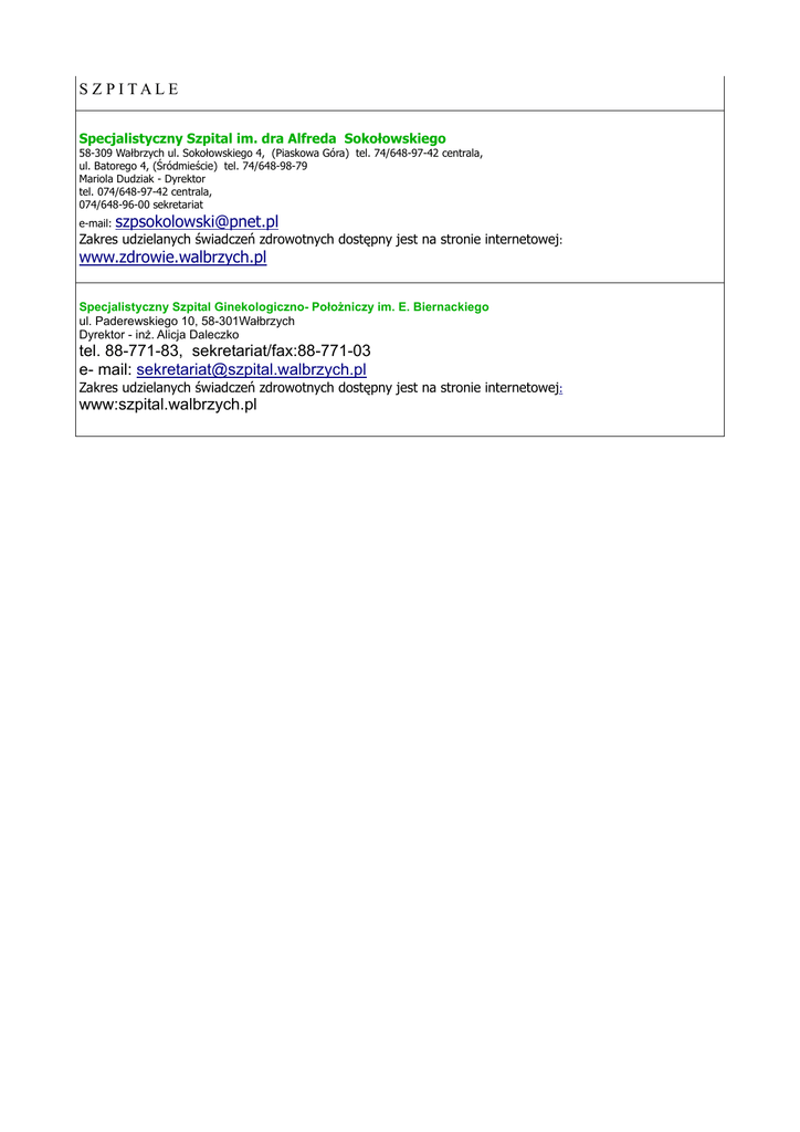 S Z PI TALE Specjalistyczny Szpital im. dra Alfreda Sokołowskiego 58-309 Wałbrzych ul. Sokołowskiego 4, (Piaskowa Góra) tel. 74/648-97-42 centrala, ul. Batorego 4, (Śródmieście) tel. 74/648-98-79 Mariola Dudziak - Dyrektor tel. 074/648-97-42 centrala, 074/648-96-00 sekretariat e-mail: [email protected] Zakres udzielanych świadczeń zdrowotnych dostępny jest na stronie internetowej: www.zdrowie.walbrzych.pl Specjalistyczny Szpital Ginekologiczno- Położniczy im. E. Biernackiego ul. Paderewskiego 10, 58-301Wałbrzych Dyrektor - inż. Alicja Daleczko tel. 88-771-83, sekretariat/fax:88-771-03 e- mail: [email protected] Zakres udzielanych świadczeń zdrowotnych dostępny jest na stronie internetowej: www:szpital.walbrzych.pl