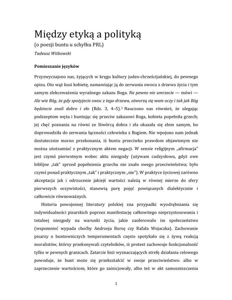 Między etyką a polityką (o poezji buntu u schyłku PRL) Tadeusz Witkowski Pomieszanie języków Przyzwyczajono nas, żyjących w kręgu kultury judeo-‐chrześcijańskiej, do pewnego opisu. Oto wąż kusi kobietę, namawiając ją do zerwania owocu z drzewa życia i tym samym zlekceważenia wyraźnego zakazu Boga. Na pewno nie umrzecie — mówi — Ale wie Bóg, że gdy spożyjecie owoc z tego drzewa, otworzą się wam oczy i tak jak Bóg będziecie znali dobro i zło (Rdz. 3, 4–5). 1 Nauczono nas również, że ulegając podszeptom węża i buntując się przeciw zakazowi Boga, kobieta popełniła grzech; jej chęć poznania na równi ze Stwórcą dobra i zła okazała się złem samym, bo doprowadziła do zerwania łączności człowieka z Bogiem. Nie wpojono nam jednak dostatecznie mocno przekonania, iż buntu przeciwko prawdom objawionym nie można utożsamiać z praktycznym aktem negacji. W sensie religijnym „afirmacja” jest czymś pierwotnym wobec aktu niezgody (używam cudzysłowu, gdyż owe biblijne „tak” sprzed popełnienia grzechu nie znało swego przeciwieństwa; było czymś ponad praktycznym „tak” i praktycznym „nie”). W praktyce życiowej zarówno akceptacja jak i odrzucenie jakiejś wartości należą w równej mierze do sfery pierwszych oczywistości, stanowią parę pojęć powiązanych dialektycznie i całkowicie równoważnych. Historia powojennej literatury polskiej zna przypadki wyodrębniania się indywidualności pisarskich poprzez manifestację całkowitego nieprzystosowania i totalnej niezgody na warunki życia, jakie zaoferowało im społeczeństwo (wspomnieć wypada choćby Andrzeja Bursę czy Rafała Wojaczka). Zachowanie pisarzy o buntowniczych temperamentach często spotykało się z żywą reakcją moralistów, którzy przekonywali czytelników, iż protest zachowuje funkcjonalność tylko w pewnych granicach. Zatarcie linii wyznaczających strefę działania celowego powoduje, że bunt może się przekształcić w swoje przeciwieństwo: albo w zaprzeczenie wartościom, które go zainicjowały, albo też w akt samozniszczenia 1 człowieka zbuntowanego. Cytowano przy tym z reguły słowa Alberta Camusa: Za każdym razem kiedy bunt apoteozuje całkowitą niezgodę na to, co jest, absolutne „nie” zabija — (CZ s. 111).2 Bunt bez kierunku prowadzi [...] logicznie do akceptacji bez wyboru — ostrzegał poetów w Zmianie warty (ZW s. 99) 3 Jan Błoński. W polemicznym ferworze często zapominano jednak, że według Camusa człowiek zbuntowany to również ktoś, kto od pierwszej chwili mówi „tak” (CZ s. 111), co uwidacznia się w fakcie solidarności zbuntowanych. Tak rozumował choćby Jacek Bierezin, gdy pisał: Naszą wspólnotę potwierdza nasz bunt ten co wyrywa nas z osamotnienia gorący węgiel który służy życiu w szlachetnym geście tożsamości losów Traktat (LL s. 41)4 Ci, co przedmiotem krytyki uczynili system zniewolenia, nie mieli jednak możliwości użycia argumentów i dotarcia z nimi do czytelnika. W takiej właśnie sytuacji znalazła się literatura polska w kraju rządzonym przez komunistów. Poniższe uwagi dotyczą stanu świadomości literackiej poetów w okresie dwu ostatnich dekad, podczas których władze komunistyczne utrzymywały kontrolę na środkami przekazu i przymusu. Uniwersalia i konkrety Zbigniewa Herberta często przyporządkowywano pokoleniu „Współczesności”, pomimo iż w prasie literackiej poeta zadebiutował w latach czterdziestych i pomimo iż znacznie więcej łączyło go z Miłoszem i Różewiczem niż z generacją, która rozpoczęła działalność w roku 1956. Ów spóźniony debiut książkowy był w jakimś sensie znakiem nieprzystawalności poezji Herberta do wzorców obowiązujących w okresie stalinizmu. Po latach poeta skromnie przedstawi ów problem jako zagadnienie czysto estetyczne, ale skądinąd wiadomo, że za gotowością do obrony własnej estetyki stoi zawsze system wartości etycznych. W wierszu Potęga smaku Herbert napisze: 2 To wcale nie wymagało wielkiego charakteru nasza odmowa niezgoda i upór mieliśmy odrobinę koniecznej odwagi lecz w gruncie rzeczy była to sprawa smaku [...] Zaiste ich retoryka była aż nazbyt parciana (Marek Tuliusz obracał się w grobie) łańcuchy tautologii parę pojęć jak cepy dialektyka oprawców żadnej dystynkcji w rozumowaniu składnia pozbawiona urody koniunktywu (R s. 75–6)5 Spora liczba poetów sięgnęła po roku 1956 do zasobu retoryki i poetyki minionych wieków, szukając w nich inspiracji i odkrywając treści, które pomagały lepiej zrozumieć sytuację współczesnego człowieka. Jednakże tylko w przypadku niektórych owa strategia objęła refleksje natury politycznej. Herbert jest chyba najbardziej reprezentatywnym przykładem. Kwestie polityczne stanowią w jego wierszach element bardziej kompleksowych zagadnień. Łączą się zazwyczaj z refleksją poznawczą, etyczną, bądź estetyczną. Opisywane sytuacje mają na ogół wartość symboliczną. Czasami stanowią aluzję do wydarzeń współczesnych i aktorów współczesnych scen politycznych, ale też aluzyjność nigdy nie jest jedynym celem poety. Maski, jakie nosili po roku 1956 bohaterowie wierszy Herberta, mogły oczywiście zabezpieczać przed interwencją cenzora, nie była to jednak ich jedyna funkcja. Czyniły one z dzisiejszych spraw problemy wiecznie aktualne. Wiersz Powrót prokonsula (WZ s. 248–49)6, na przykład, przedstawiał scenę z życia dworu cesarskiego ale prowokował myśli o granicach kompromisu politycznego w ogóle. Tren Fortynbrasa (WZ s. 250–51) był monologiem Szekspirowskiego bohatera, który uosabiał cechy wszelkich zwolenników rządów silnej ręki. Obraz Utyki z czasów Katona Młodszego, odmalowany w wierszu Pan Cogito o postawie wyprostowanej (PC s. 75–77) 7 wyraźnie przypominał Polskę z przełomu lat sześćdziesiątych i siedemdziesiątych, ale był zarazem czymś więcej: refleksją o heroizmie