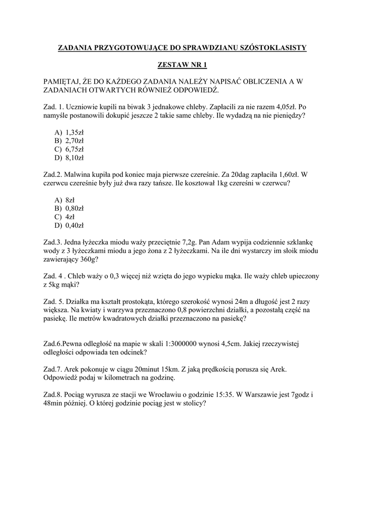 ZADANIA PRZYGOTOWUJĄCE DO SPRAWDZIANU SZÓSTOKLASISTY ZESTAW NR 1 PAMIĘTAJ, ŻE DO KAŻDEGO ZADANIA NALEŻY NAPISAĆ OBLICZENIA A W ZADANIACH OTWARTYCH RÓWNIEŻ ODPOWIEDŹ. Zad. 1. Uczniowie kupili na biwak 3 jednakowe chleby. Zapłacili za nie razem 4,05zł. Po namyśle postanowili dokupić jeszcze 2 takie same chleby. Ile wydadzą na nie pieniędzy? A) B) C) D) 1,35zł 2,70zł 6,75zł 8,10zł Zad.2. Malwina kupiła pod koniec maja pierwsze czereśnie. Za 20dag zapłaciła 1,60zł. W czerwcu czereśnie były już dwa razy tańsze. Ile kosztował 1kg czereśni w czerwcu? A) B) C) D) 8zł 0,80zł 4zł 0,40zł Zad.3. Jedna łyżeczka miodu waży przeciętnie 7,2g. Pan Adam wypija codziennie szklankę wody z 3 łyżeczkami miodu a jego żona z 2 łyżeczkami. Na ile dni wystarczy im słoik miodu zawierający 360g? Zad. 4 . Chleb waży o 0,3 więcej niż wzięta do jego wypieku mąka. Ile waży chleb upieczony z 5kg mąki? Zad. 5. Działka ma kształt prostokąta, którego szerokość wynosi 24m a długość jest 2 razy większa. Na kwiaty i warzywa przeznaczono 0,8 powierzchni działki, a pozostałą część na pasiekę. Ile metrów kwadratowych działki przeznaczono na pasiekę? Zad.6.Pewna odległość na mapie w skali 1:3000000 wynosi 4,5cm. Jakiej rzeczywistej odległości odpowiada ten odcinek? Zad.7. Arek pokonuje w ciągu 20minut 15km. Z jaką prędkością porusza się Arek. Odpowiedź podaj w kilometrach na godzinę. Zad.8. Pociąg wyrusza ze stacji we Wrocławiu o godzinie 15:35. W Warszawie jest 7godz i 48min później. O której godzinie pociąg jest w stolicy?