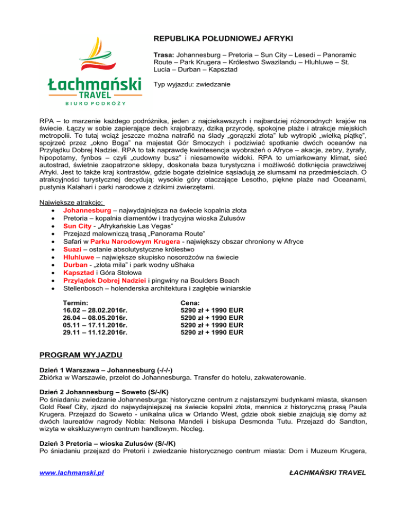 REPUBLIKA POŁUDNIOWEJ AFRYKI Trasa: Johannesburg – Pretoria – Sun City – Lesedi – Panoramic Route – Park Krugera – Królestwo Swazilandu – Hluhluwe – St. Lucia – Durban – Kapsztad Typ wyjazdu: zwiedzanie RPA – to marzenie każdego podróżnika, jeden z najciekawszych i najbardziej różnorodnych krajów na świecie. Łączy w sobie zapierające dech krajobrazy, dziką przyrodę, spokojne plaże i atrakcje miejskich metropolii. To tutaj wciąż jeszcze można natrafić na ślady „gorączki złota” lub wytropić „wielką piątkę”, spojrzeć przez „okno Boga” na majestat Gór Smoczych i podziwiać spotkanie dwóch oceanów na Przylądku Dobrej Nadziei. RPA to tak naprawdę kwintesencja wyobrażeń o Afryce – akacje, zebry, żyrafy, hipopotamy, fynbos – czyli „cudowny busz” i niesamowite widoki. RPA to umiarkowany klimat, sieć autostrad, świetnie zaopatrzone sklepy, doskonała baza turystyczna i możliwość dotknięcia prawdziwej Afryki. Jest to także kraj kontrastów, gdzie bogate dzielnice sąsiadują ze slumsami na przedmieściach. O atrakcyjności turystycznej decydują: wysokie góry otaczające Lesotho, piękne plaże nad Oceanami, pustynia Kalahari i parki narodowe z dzikimi zwierzętami. Największe atrakcje: Johannesburg – najwydajniejsza na świecie kopalnia złota Pretoria – kopalnia diamentów i tradycyjna wioska Zulusów Sun City - „Afrykańskie Las Vegas” Przejazd malowniczą trasą „Panorama Route” Safari w Parku Narodowym Krugera - największy obszar chroniony w Afryce Suazi – ostanie absolutystyczne królestwo Hluhluwe – największe skupisko nosorożców na świecie Durban - „złota mila” i park wodny uShaka Kapsztad i Góra Stołowa Przylądek Dobrej Nadziei i pingwiny na Boulders Beach Stellenbosch – holenderska architektura i zagłębie winiarskie Termin: 16.02 – 28.02.2016r. 26.04 – 08.05.2016r. 05.11 – 17.11.2016r. 29.11 – 11.12.2016r. Cena: 5290 zł + 1990 EUR 5290 zł + 1990 EUR 5290 zł + 1990 EUR 5290 zł + 1990 EUR PROGRAM WYJAZDU Dzień 1 Warszawa – Johannesburg (-/-/-) Zbiórka w Warszawie, przelot do Johannesburga. Transfer do hotelu, zakwaterowanie. Dzień 2 Johannesburg – Soweto (S/-/K) Po śniadaniu zwiedzanie Johannesburga: historyczne centrum z najstarszymi budynkami miasta, skansen Gold Reef City, zjazd do najwydajniejszej na świecie kopalni złota, mennica z historyczną prasą Paula Krugera. Przejazd do Soweto - unikalna ulica w Orlando West, gdzie obok siebie znajdują się domy aż dwóch laureatów nagrody Nobla: Nelsona Mandeli i biskupa Desmonda Tutu. Przejazd do Sandton, wizyta w ekskluzywnym centrum handlowym. Nocleg. Dzień 3 Pretoria – wioska Zulusów (S/-/K) Po śniadaniu przejazd do Pretorii i zwiedzanie historycznego centrum miasta: Dom i Muzeum Krugera, www.lachmanski.pl ŁACHMAŃSKI TRAVEL Budynki Opery i Teatru, Church Square, Pałac Sprawiedliwości, Ratusz oraz Budynki Unii, położone na wzgórzu i otoczone przepięknymi ogrodami. Wizyta w kopalni diamentów. Przejazd do tradycyjnej wioski Zulusów, Basotho, Xhosa i Pedi – Lesedi. Poznanie rytuałów, tradycji i kultury tych plemion. W pierwszej połowie XIX wieku Zulusi utworzyli, pod dowództwem Czaki, silne wodzowskie państwo i dobrze zorganizowane siły zbrojne, zaopatrzone nawet w broń palną. Odrzucili ultimatum brytyjskie o rozwiązanie swej armii i prowadzili przez kilkadziesiąt lat walkę przeciw Burom i Brytyjczykom, wypierającym ich z siedzib ich zamieszkania. Swą determinację Zulusi opłacili dziesiątkami tysięcy ofiar. W 1879 roku zostali podbici przez Brytyjczyków. Stanowią najliczniejszą grupę etniczną w RPA. Kolacja. Powrót do Johannesburga, nocleg. Dzień 4 Sun City – Park Pilanesberg (S/-/K) Po śniadaniu przejazd do prywatnego rezerwatu z lwami. Następnie przejazd przez Hartbeespoort w kierunku Sun City, miejsca rozrywki i hazardu, wybudowanego wśród wzgórz Parku Narodowego Pilanesberg, znanego jako “Afrykańskie Las Vegas”. Zwiedzanie kompleksu, spacer po Lost City. Powrót do Johannesburga. Nocleg. Dzień 5 Panoramic Route – Park Krugera (S/-/K) Po wczesnym śniadaniu wyjazd w kierunku Parku Krugera do malowniczych Gór Smoczych, trasą widokową o nazwie „Panoramic Route”. Przystanek w Pilgrim's Rest, gdzie odkryte były pierwsze złoża złota w RPA. Zatrzymamy się przy tzw. Oknie Boga, które zawdzięcza swoją nazwę wspaniałym widokom na rozciągającą się poniżej równinę. Przystanek przy wodospadach Lisbona i Berlin. Przejazd wzdłuż kanionu rzeki Blyde, podziwianie trzech przedziwnie okrągłych gór - Three Rondavels. Nocleg w lodge w Hazyview. Dzień 6 Park Krugera (S/-/K) Całodniowe safari w poszukiwaniu słynnej „Wielkiej Piątki” w Parku Krugera, który jest największym w Afryce naturalnym rezerwatem zwierząt, o powierzchni przekraczającej 2 mln hektarów. Żyje tu prawie 150 gatunków ssaków i ponad 500 gatunków ptaków. Jest największym rezerwatem narodowym kraju i obfituje w największe na świecie bogactwo gatunków dzikich zwierząt i roślin. Południowy rejon jest częścią pierwotnego Rezerwatu Sabie. Nosorożec biały, likaon i lampart - są ściśle związane z tym regionem. Akacje zapewniają schronienie i pożywienie dla większych roślinożerców – żyraf, słoni, za to Krokodyla Rzeka daje ochłodzenie i wodę. Liczne wypoczynkowe obozowiska zapewniają temu rejonowi największą popularność. Centralny region składa się z rozległych, trawiastych równin, które są przerywane przez bujną roślinność ciągnącą się wzdłuż rzek Olifant i Letaba. Charakterystyczne akacje uwydatniają rozległy krajobraz, a drzewa marula zapewniają pożywienie dla wielu roślinożerców – żyraf, słoni i pawianów. Wzdłuż malowniczych rzek można obserwować niesamowite hipopotamy lub krokodyle, które leniwie leżą na mieliznach. Północny region jest odwiedzany tylko przez najbardziej wytrwałych podr