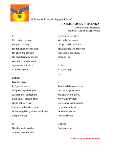 18 Konkurs Piosenki „Wygraj Sukces” NAJMNIEJSZA PIOSENKA słowa: Marek Sochacki muzyka: Robert Wiórkiewicz I. Kto wielki ten ktoś, Kto mały jak mak, kto mały bez szans niż puch lżejszy Nie przejdzie król lew kto ten chce być jak słoń, przez szparę we drzwiach ten chce być jak dąb Prześliźnie się mysz, Na drożdżach by chciał, stonoga i Ja do gwiazd sięgać wnet A ja na to w śmiech, Refren: a ja mówię nie Być jak szept .... Refren: Być jak szept, III. być jak świerszcz Tak, zrodził mnie kwiat, Niby nic, a jednak jest tak świat ujrzał mnie Kwiatu pył i zapach lip Maleństwo stu barw, Lata smak i słońca błysk Motyla pstry cień Nitką babiego lata By cieszyć wasz wzrok, Srebrem w błękicie lśnić by snuła się baśń Dolecieć gdzie glob ma swój kres Dla dzieci na sen I zapaść w sen i do raju bram II. Refren: Niech mówią co chcą, Być jak szept że moc zmienia świat .... www.wygrajsukces.com.pl