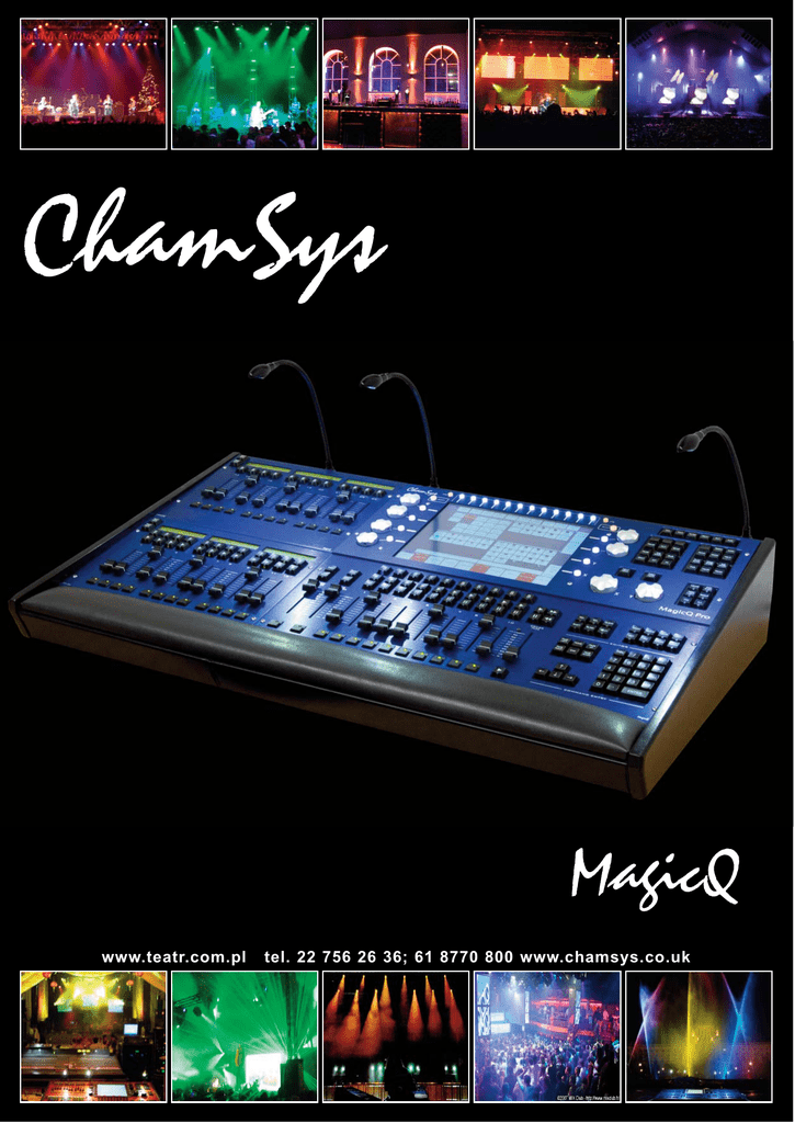 ChamSys MagicQ www.teatr.com.pl tel. 22 756 26 36; 61 8770 800 www.chamsys.co.uk ~intuicyjność~wydajność~praca sieciowa~wsparcie techniczne~personalizacja~elastyczność~niezawodność~ Praca „Live” MagicQ jest jedną z najbardziej elastycznych i funkcjonalnych konsolet do pracy „Live”. Prędkości chase-ów i efektów (FX), rozmiar, przesunięcie oraz wszystkie inne parametry mogą być zmieniane w czasie rzeczywistym poprzez użycie dedyko-wanych przycisków lub kół enkoderów. Suwaki można konfigurować na wiele sposobów: w trybie HTP, w trybie LTP, kontrola prędkości i/lub rozmiaru efektu (FX), jako Master: dla intensywności grupy urządzeń, grupa Masters dla rozmiaru i/lub prędkości efektów. Palety mogą być wywoływane z zadanym czasem ustawianym suwakiem („master busking”) lub wybraną wartością z klawiatury numerycznej. Czas może być również rozłożony na wszystkie urządzenia za pomocą specjalnej funkcji FAN. Makra i definiowane przez użytkownika okna pozwalają na dostosowanie układu konsolety stosownie do jego potrzeb i osobistych preferencji. MagicQ Media Serwer MagicQ idealnie nadaje się do kontrolowania media serwerów. Przez rozbudowane opcje w Cue oraz duży ekran dotykowy, osiem oddzielnych kół enkodera zapewnia szybki i łatwy dostęp do dużej liczby parametrów media serwera. System potrafi obsłużyć do 50 różnych media serwerów jednocześnie. MagicQ zapisuje i przechowuje podgląd miniatur plików dla każdego serwera niezależnie. MagicQ obsługuje media serwery w specjalnym oknie „Windows Media”, ułatwiając kontrolę i dostęp do parametrów media serwerów. W widoku „Windows Media' można wybrać serwer multimediów, warstwę, atrybuty i treści medialne. Dodatkowo użytkownik ma możliwość podglądu zawartości wybranej warstwy media serwerów. Okno „Live Preview” pokazuje wyjście z media serwera w czasie rzeczywistym – tak aby można było zobaczyć jaki obraz generuje serwer. Jest to szczególnie przydatne w sytuacjach przy pracy z wieloma media serwerami lub gdy media serwery są odległe od stanowiska sterowania. MagicQ w teatrze MagicQ jest doskonałym rozwiązaniem dla teatrów, instytucji kulturalnych, grup tanecznych, szkół organizujących własne przedstawienia, szczególnie w sytuacjach częstych zmian miejsca występu. MagicQ posiada kompleksowy tryb „theatre tracking” oraz opcje „Move When Dark”, osobny, niezależny suwak cross-fader, master czasu. możliwość zapisania indywidualnych czasów przejść (fade) i opoźnień (delay) na każdy parametr każdego z urządzeń. Tryb w MagicQ „theatre tracking” umożliwia zapisywanie kolejnego Cue jako modyfikacji z poprzedniego Cue, ułatwiając tym samym programowanie dużej ilości urządzeń oświetleniowych. Klawiatura numeryczna umożlwia szybki wybór urządzeń, intensywności oraz czasów poszczególnych parametrów. Lampy mogą być adresowane i przeadresowywane w dowolnym momencie. Opcja „Move When Dark” pozwala w całym Cue Stack (kolejce kilku Cue) skonfigurować pamięci tak, że ruchome urządzenia zmienią swoją pozycję, kolor, gobo itp., tylko gdy są wyciemnione. Unikamy w ten sposób niepożądanych zmian w urządzeniach pomiędzy kolejnymi scenami. Konfiguracja suwaków jako „Group Master” („Intensity Master”) pozwala na kontrolowanie ogólnego poziomu intensywności całej wybranej grupy urządzeń. MagicQ obsługuje grupowanie lamp według przypisanego koloru (LEE, ROSCO, MIX) lub nazwy urządzeń, co znacznie ułatwia pracę przy dużych projektach. Ponadto można skonfigurować plan 2D w celu wyświetlenia jak są rozmieszczone urządzenia oraz ich aktualnego poziomu intensywności lub koloru. Korzystając z ekranu dotykowego, plan ten może być używany do wyboru lamp i określenia ich intensywności. MagicQ Cons MQ100 Expert MQ100 Pro MQ MagicQ Pixel Mapping MagicQ posiada potężne narzędzie jakim jest Pixel Mapping. Ten wbudowany media serwer może kontrolować do 3072 pikseli RGB, zorganizowanych w 20 różnych matryc o różnych kształtach. Pojedynczym pikselem matrycy mogą być punkty LED, ruchome głowy lub poszczególne kanały (np. dimmer). Opcje takie jak: odtwarzanie efektów na kolorach, zdefiniowanych przez użytkownika bitmapach, przewijanie tekstu na wielu różnych warstwach – to wszystko zawiera wbudowany media serwer, który zawsze jest w zasięgu ręki. Niezależne wykorzystanie przez MagicQ dużej liczby głowic, urządzeń LED zapewnia, że projektanci oświetlenia mają dostęp do jak najlepszego wykorzystania urządzeń w postaci siatki/tablicy i nie są w żaden sposób ograniczani przez konsoletę. W MagicQ można wygenerować kompletną „tęczę” na wszystkich urządzeniach LED z natychmiastową kontrolą efektu, poprzez przyciski i enkodery, podczas odtwarzania na żywo. Swobodna konfiguracja w MagicQ dużej liczby głowic, urządzeń LED, w dowolne struktury matryc, pozwala realizatorowi na maksymalne wykorzystanie urządzeń. MagicQ PC Solutions Ethernet Twin DMX PC Mini Wing Remote Playback Extra Wing ~intuicyjność~wydajność~praca sieciowa~wsparcie techniczne~personalizacja~elastyczność~niezawodność~ ~intuicyjność~wydajność~praca sieciowa~wsparcie techniczne~personalizacja~elastyczność~niezawodność~ sole Solutions Q200 P ro MQ300 Pro Sieć MagicQ udostępnia pełen zakres konfiguracji połączeń sieciowych, pozwalając w ten sposób łączyć ze sobą wiele konsolet i systemów MagicQ PC. Touring MagicQ jest najpopularniejszą konsoletą „touringową”. Elastyczna konfiguracja pozwala szybko zmienić show uwzględniając miejsce i dostępne urządzenia. Sekcje z „Playback” są niezależne od siebie, każda posiada własne przyciski Page Up / Page Down. Pozwalając tym samym na niezależne odtwarzanie pamięci z rożnych stron dla rożnych sekcji „Playback”. MagicQ zawiera funkcję „Head Morphing”, za pomocą której można 