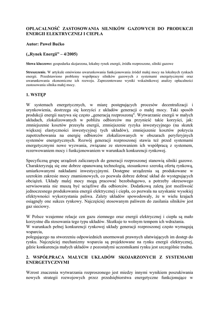 OPŁACALNOŚĆ ZASTOSOWANIA SILNIKÓW GAZOWYCH DO PRODUKCJI ENERGII ELEKTRYCZNEJ I CIEPŁA Autor: Paweł Bućko („Rynek Energii” – 4/2005) Słowa kluczowe: gospodarka skojarzona, lokalny rynek energii, źródła rozproszone, silniki gazowe Streszczenie. W artykule omówiono uwarunkowania funkcjonowania źródeł małej mocy na lokalnych rynkach energii. Przedstawiono problemy współpracy silników gazowych z systemami energetycznymi oraz uwarunkowania ekonomiczne ich rozwoju. Zaprezentowano wyniki wskaźnikowej analizy opłacalności zastosowania silnika małej mocy. 1. WSTĘP W systemach energetycznych, w miarę postępujących procesów decentralizacji i urynkowienia, dostrzega się korzyści z układów generacji o małej mocy. Taki sposób produkcji energii nazywa się często „generacją rozproszoną". Wytwarzanie energii w małych układach, zlokalizowanych w pobliżu odbiorców ma przynieść takie korzyści, jak: zmniejszenie kosztów przesyłu energii, zmniejszenie ryzyka inwestycyjnego (na skutek większej elastyczności inwestycyjnej tych układów), zmniejszenie kosztów pokrycia zapotrzebowania na energię odbiorców zlokalizowanych w obszarach peryferyjnych systemów energetycznych. Rozwój generacji rozproszonej stawia też przed systemami energetycznymi nowe wyzwania, związane ze sterowaniem ich współpracą z systemem, rezerwowaniem mocy i funkcjonowaniem w warunkach konkurencji rynkowej. Specyficzną grupę urządzeń zaliczanych do generacji rozproszonej stanowią silniki gazowe. Charakteryzują się one dobrze opanowaną technologią, stosunkowo szeroką ofertą rynkową, umiarkowanymi nakładami inwestycyjnymi. Dostępne urządzenia są produkowane w szerokim zakresie mocy znamionowych, co pozwala dobrze dobrać układ do występujących obciążeń. Układy malej mocy mogą pracować bezobsługowo, a potrzeby okresowego serwisowania nie muszą być uciążliwe dla odbiorców. Dodatkową zaletą jest możliwość jednoczesnego produkowania energii elektrycznej i ciepła, co pozwala na uzyskanie wysokiej efektywności wykorzystania paliwa. Zalety układów spowodowały, że w wielu krajach osiągnęły one sukces rynkowy. Najczęściej stosowanym paliwem do zasilania silników jest gaz sieciowy. W Polsce wzajemne relacje cen gazu ziemnego oraz energii elektrycznej i ciepła są mało korzystne dla stosowania tego typu układów. Skutkuje to wolnym tempem ich wdrażania. W warunkach pełnej konkurencji rynkowej układy generacji rozproszonej często wymagają wsparcia, polegającego na stworzeniu odpowiednich unormowań prawnych ułatwiających im dostęp do rynku. Najczęściej mechanizmy wsparcia są projektowane na rynku energii elektrycznej, gdzie konkurencja małych układów z pozostałymi uczestnikami rynku jest szczególnie trudna. 2. WSPÓŁPRACA MAŁYCH UKŁADÓW SKOJARZONYCH Z SYSTEMAMI ENERGETYCZNYMI Wzrost znaczenia wytwarzania rozproszonego jest miedzy innymi wynikiem poszukiwania nowych strategii rozwojowych przez przedsiębiorstwa energetyczne funkcjonujące w otoczeniu rynkowym. Dla tradycyjnych przedsiębiorstw zajmujących się sieciową dostawą energii (elektroenergetyka, lokalne systemy ciepłownicze, sieci gazowe) wytwarzanie rozproszone często zmienia warunki funkcjonowania systemów, stawiając nowe wymagania techniczne i ekonomiczne. System elektroenergetyczny W niewielu przypadkach małe, rozproszone układy wytwarzania skojarzonego stają się jedynym źródłem pokrycia potrzeb energetycznych odbiorcy. W większości zastosowań wymagane jest uzupełnienie dla pokrycia zapotrzebowań szczytowych. W sposób istotny dotyczy to energii elektrycznej, w przypadku dostawy której proces pokrywania zapotrzebowania charakteryzuje się znacznie większą dynamiką, niż w przypadku energii cieplnej. Bardzo ograniczone możliwości gromadzenia energii elektrycznej u odbiorcy powodują konieczność uzupełniania i rezerwowania zasilania w ten nośnik, a w przypadku chwilowych nadwyżek produkcji nad zapotrzebowaniem, konieczne jest oddawanie energii elektrycznej do sieci. Przyłącze dla odbiorców wykorzystujących u siebie mały układ skojarzony jest najczęściej zwymiarowane na pokrycie pełnego zapotrzebowania na moc elektryczną (czyli spełnia podobne wymagania jak w przypadku, gdyby u odbiorcy silnika nie było) a często dodatkowe wymagania wynikają z faktu możliwości oddawania energii elektrycznej do sieci oraz uwarunkowań wynikających z konieczności dotrzymania parametrów jakościowych dostawy energii i ewentualnych wymagań koordynacji zabezpieczeń. Z punktu widzenia systemu elektroenergetycznego rozproszona generacja nie jest więc postrzegana jako alternatywa dla sieciowej dostawy nośnika. Podstawowym problemem staje się zapewnienie właściwych standardów współpracy tych źródeł z systemem. Dostrzegane są przy tym korzyści polegające głównie na zmniejszeniu obciążeń i strat energii w sieciach przesyłowych. System ciepłowniczy Dla sieciowej dostawy ciepła układy generacji rozproszonej stanowią najczęściej alternatywę dla rozwoju tradycyjnych, rozległych systemów ciepłowniczych zasilanych przez duże źródła scentralizowane. W przypadku instancji silników gazowych rola przesyłowej (magistralnej) sieci ciepłowniczej jest przejmowana przez sieć gazową a uzupełnienie potrzeb odbiorców w zakresie zapotrzebowania na ciepło jest realizowane przez zastosowanie układów wielomodułowych lub zainstalowanie uzupełniających kotłów gazowych. Silniki gazowe są jednocześnie źródłami znacznie mniej uciążliwymi dla środowiska niż ciepłownie węglowe. Często stają się możliwym wariantem modernizacji istniejących lokalnych kotłowni węglowych. Przedsiębiorstwa ciepłownicze próbując utrzymać rynek klienta są aktywnie zainteresowane budową i udziałem w przedsięwzięciach multienergetycznych -- widząc w tych rozwiązaniach nowe szansę rozwojowe. Coraz częściej postrzeg