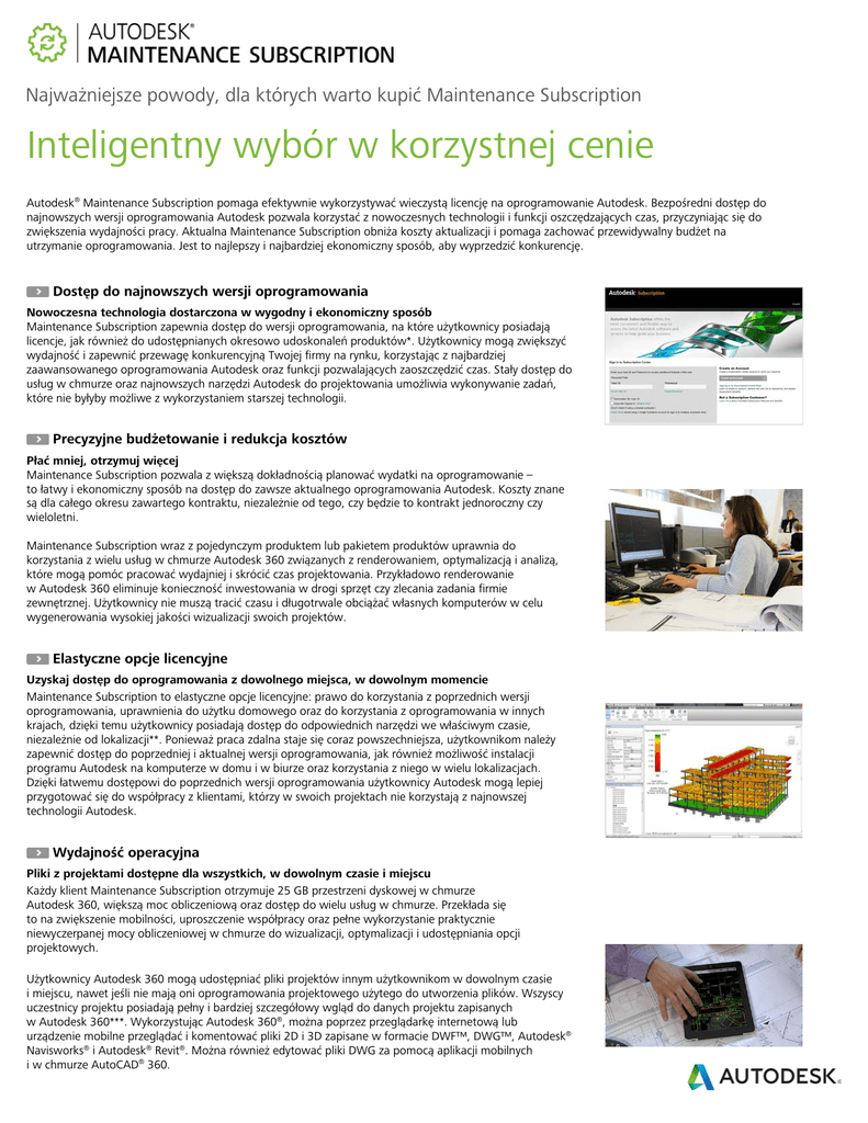 Najważniejsze powody, dla których warto kupić Maintenance Subscription Inteligentny wybór w korzystnej cenie Autodesk® Maintenance Subscription pomaga efektywnie wykorzystywać wieczystą licencję na oprogramowanie Autodesk. Bezpośredni dostęp do najnowszych wersji oprogramowania Autodesk pozwala korzystać z nowoczesnych technologii i funkcji oszczędzających czas, przyczyniając się do zwiększenia wydajności pracy. Aktualna Maintenance Subscription obniża koszty aktualizacji i pomaga zachować przewidywalny budżet na utrzymanie oprogramowania. Jest to najlepszy i najbardziej ekonomiczny sposób, aby wyprzedzić konkurencję. Dostęp do najnowszych wersji oprogramowania Nowoczesna technologia dostarczona w wygodny i ekonomiczny sposób Maintenance Subscription zapewnia dostęp do wersji oprogramowania, na które użytkownicy posiadają licencje, jak również do udostępnianych okresowo udoskonaleń produktów*. Użytkownicy mogą zwiększyć wydajność i zapewnić przewagę konkurencyjną Twojej firmy na rynku, korzystając z najbardziej zaawansowanego oprogramowania Autodesk oraz funkcji pozwalających zaoszczędzić czas. Stały dostęp do usług w chmurze oraz najnowszych narzędzi Autodesk do projektowania umożliwia wykonywanie zadań, które nie byłyby możliwe z wykorzystaniem starszej technologii. Precyzyjne budżetowanie i redukcja kosztów Płać mniej, otrzymuj więcej Maintenance Subscription pozwala z większą dokładnością planować wydatki na oprogramowanie – to łatwy i ekonomiczny sposób na dostęp do zawsze aktualnego oprogramowania Autodesk. Koszty znane są dla całego okresu zawartego kontraktu, niezależnie od tego, czy będzie to kontrakt jednoroczny czy wieloletni. Maintenance Subscription wraz z pojedynczym produktem lub pakietem produktów uprawnia do korzystania z wielu usług w chmurze Autodesk 360 związanych z renderowaniem, optymalizacją i analizą, które mogą pomóc pracować wydajniej i skrócić czas projektowania. Przykładowo renderowanie w Autodesk 360 eliminuje konieczność inwestowania w drogi sprzęt czy zlecania zadania firmie zewnętrznej. Użytkownicy nie muszą tracić czasu i długotrwale obciążać własnych komputerów w celu wygenerowania wysokiej jakości wizualizacji swoich projektów. Elastyczne opcje licencyjne Uzyskaj dostęp do oprogramowania z dowolnego miejsca, w dowolnym momencie Maintenance Subscription to elastyczne opcje licencyjne: prawo do korzystania z poprzednich wersji oprogramowania, uprawnienia do użytku domowego oraz do korzystania z oprogramowania w innych krajach, dzięki temu użytkownicy posiadają dostęp do odpowiednich narzędzi we właściwym czasie, niezależnie od lokalizacji**. Ponieważ praca zdalna staje się coraz powszechniejsza, użytkownikom należy zapewnić dostęp do poprzedniej i aktualnej wersji oprogramowania, jak również możliwość instalacji programu Autodesk na komputerze w domu i w biurze oraz korzystania z niego w wielu lokalizacjach. Dzięki łatwemu dostępowi do poprzednich wersji oprogramowania użytkownicy Autodesk mogą lepiej przygotować się do współpracy z klientami, którzy w swoich projektach nie korzystają z najnowszej technologii Autodesk. Wydajność operacyjna Pliki z projektami dostępne dla wszystkich, w dowolnym czasie i miejscu Każdy klient Maintenance Subscription otrzymuje 25 GB przestrzeni dyskowej w chmurze Autodesk 360, większą moc obliczeniową oraz dostęp do wielu usług w chmurze. Przekłada się to na zwiększenie mobilności, uproszczenie współpracy oraz pełne wykorzystanie praktycznie niewyczerpanej mocy obliczeniowej w chmurze do wizualizacji, optymalizacji i udostępniania opcji projektowych. Użytkownicy Autodesk 360 mogą udostępniać pliki projektów innym użytkownikom w dowolnym czasie i miejscu, nawet jeśli nie mają oni oprogramowania projektowego użytego do utworzenia plików. Wszyscy uczestnicy projektu posiadają pełny i bardziej szczegółowy wgląd do danych projektu zapisanych w Autodesk 360***. Wykorzystując Autodesk 360®, można poprzez przeglądarkę internetową lub urządzenie mobilne przeglądać i komentować pliki 2D i 3D zapisane w formacie DWF™, DWG™, Autodesk® Navisworks® i Autodesk® Revit®. Można również edytować pliki DWG za pomocą aplikacji mobilnych i w chmurze AutoCAD® 360. Najważniejsze powody, dla których warto zakupić Maintenance Subscription Narzędzia administracyjne Kontrola i łatwe zarządzanie licencjami oraz stanowiskami Centrum Subskrypcyjne Autodesk zapewnia narzędzia administracyjne, które pomagają w zarządzaniu Maintenance Subscription. Narzędzia do raportowania i zarządzania dla kierowników ds. umów i koordynatorów ds. oprogramowania obejmują: • Raport szczegółowy– monitorowanie licencji oprogramowania i stanowisk oraz zarządzanie nimi • Funkcje i narzędzia dot. użytkowników – zarządzanie dostępem użytkowników do usług dostępnych z Maintenance Subscription • Raport wykorzystania Autodesk 360 – monitorowanie jednostek chmury wykorzystanych w ramach usług w chmurze Autodesk 360 • Raport dot. odnowień – informacje dotyczące umów wygasających w ciągu najbliższych 90 dni Pomoc techniczna dla użytkowników Uzyskaj wgląd w zgłoszenia problemów do działu pomocy Program Maintenance Subscription zapewnia dostęp do podstawowej pomocy technicznej, w ramach której użytkownicy mogą kontaktować się ze specjalistami wsparcia technicznego i uzyskać pomoc w instalacji, konfiguracji, rozwiązywaniu problemów i w innych kwestiach, co przekłada się na skrócenie czasu przestoju i zwiększenie wydajności. (Istnieje również możliwość uzyskania płatnego dostępu do zaawansowanych opcji pomocy). Poza tym użytkownicy mogą korzystać z pomocy online obejmującej bazę wiedzy z dokumentami pomocy, samouczkami, filmami szkoleniowymi oraz obszernym archiwum rozwiązań technicznych Autodesk i forum dyskusyjnym. Dz