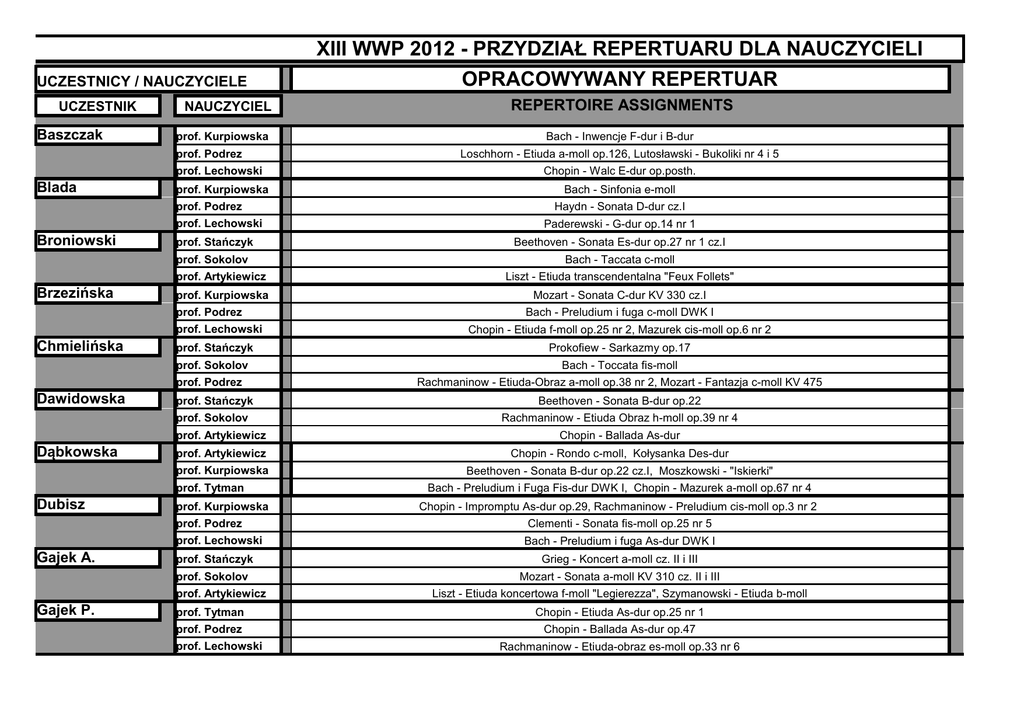 UCZESTNICY / NAUCZYCIELE UCZESTNIK Baszczak NAUCZYCIEL prof. Kurpiowska prof. Podrez Blada Bach - Sinfonia e-moll prof. Stańczyk Mozart - Sonata C-dur KV 330 cz.I Prokofiew - Sarkazmy op.17 prof. Sokolov Bach - Toccata fis-moll prof. Podrez Rachmaninow - Etiuda-Obraz a-moll op.38 nr 2, Mozart - Fantazja c-moll KV 475 prof. Stańczyk Beethoven - Sonata B-dur op.22 prof. Sokolov Rachmaninow - Etiuda Obraz h-moll op.39 nr 4 Chopin - Ballada As-dur prof. Artykiewicz Chopin - Rondo c-moll, Kołysanka Des-dur prof. Kurpiowska Beethoven - Sonata B-dur op.22 cz.I, Moszkowski - "Iskierki" prof. Kurpiowska prof. Podrez prof. Lechowski prof. Stańczyk prof. Sokolov prof. Artykiewicz Gajek P. Bach - Preludium i fuga c-moll DWK I Chopin - Etiuda f-moll op.25 nr 2, Mazurek cis-moll op.6 nr 2 prof. Stańczyk prof. Tytman Gajek A. Bach - Taccata c-moll prof. Kurpiowska prof. Artykiewicz Dubisz Beethoven - Sonata Es-dur op.27 nr 1 cz.I Liszt - Etiuda transcendentalna "Feux Follets" prof. Lechowski Dąbkowska Haydn - Sonata D-dur cz.I Paderewski - G-dur op.14 nr 1 prof. Artykiewicz prof. Podrez Dawidowska Loschhorn - Etiuda a-moll op.126, Lutosławski - Bukoliki nr 4 i 5 prof. Kurpiowska prof. Sokolov Chmielińska Bach - Inwencje F-dur i B-dur Chopin - Walc E-dur op.posth. prof. Lechowski Brzezińska REPERTOIRE ASSIGNMENTS prof. Lechowski prof. Podrez Broniowski X XIII WWP WWP 2009 2012 - PRZYDZIAŁ - PRZYDZIAŁ REPERTUARU REPERTUARU DODLA NAUCZYCIELI NAUCZYCIELI OPRACOWYWANY REPERTUAR prof. Tytman prof. Podrez prof. Lechowski Bach - Preludium i Fuga Fis-dur DWK I, Chopin - Mazurek a-moll op.67 nr 4 Chopin - Impromptu As-dur op.29, Rachmaninow - Preludium cis-moll op.3 nr 2 Clementi - Sonata fis-moll op.25 nr 5 Bach - Preludium i fuga As-dur DWK I Grieg - Koncert a-moll cz. II i III Mozart - Sonata a-moll KV 310 cz. II i III Liszt - Etiuda koncertowa f-moll "Legierezza", Szymanowski - Etiuda b-moll Chopin - Etiuda As-dur op.25 nr 1 Chopin - Ballada As-dur op.47 Rachmaninow - Etiuda-obraz es-moll op.33 nr 6 Giermakowski prof. Stańczyk Chopin - Fantazja f-moll prof. Sokolov Liszt - Fantazja na temat B-A-C-H, Rachmaninow - Preludium B-dur op.23 prof. Kurpiowska Han Aisha prof. Stańczyk Chopin - Fantazja-Impromptu, Bach - Fantazja i Fuga a-moll prof. Sokolov Granados - Allegro de Concert prof. Artykiewicz He Kethy prof. Kurpiowska prof. Podrez prof. Lechowski He Michelle Hwang Jonwei prof. Kurpiowska Jarzyńska Rachmaninow - Preludium gis-moll op.32 nr 12 Chopin - Ballade No.3 prof. Sokolov Beethoven - Sonata C-dur op.53 Waldstein cz I Chopin - Ballada As-dur, Koncert e-moll cz.I, Mazurki op.63 nr 3 i nr 4 prof. Sokolov Rachmaninow - II Koncert cz.I, Chopin - Etiuda e-moll op. 25 nr 5 Chopin - Barcarolle Op.60, Polonez cis-moll Op.26 prof. Stańczyk Chopin - Polonez-Fantazja Op.61 prof. Sokolov Schumann - Koncert a-moll cz.III prof. Artykiewicz Schumann - Koncert a-moll cz. I prof. Tytman prof. Podrez prof. Kurpiowska Bach - VI Suita francuska E-dur: Sarabanda, Gavotte, Polonaise Bach - VI Suita francuska E-dur: Allemande, Courante Bach - VI Suita francuska E-dur: Menuet, Bourree, Gigue Mozart - Sonata C-dur KV 545 cz.II i III Bach - Adagio i Presto z Koncertu obojowego d-moll Marcella Daquin - Kukułka, Albeniz - Malaguena prof. Artykiewicz Beethoven - Rondo G-dur op.129, Chopin - Ballada F-dur prof. Kurpiowska Brahms - Rapsodia g-moll, Chopin - Etiuda F-dur op.15 nr 3 prof. Tytman prof. Kurpiowska prof. Tytman Kopeć Liszt - Mazeppa prof. Stańczyk prof. Podrez Kondraciuk Beethoven - Sonata G-dr op.14 nr 2 cz.I prof. Stańczyk prof. Tytman Kołakowski Bach - Sinfonia h-moll, Liszt - Etiuda d-moll op.1 nr 4 prof. Lechowski prof. Lechowski Jóźwiak Mozart - Sonata B-dur KV 570 cz.I Chopin - Mazurek F-dur op.68 nr 3, Liszt - Etiuda C-dur op.1 nr 1 Rachmaninow - Etiuda-obraz g-moll op.33 nr 7 prof. Artykiewicz Jagła Chopin - Etiuda op.10 nr 12, Pierne - Etuida koncertowa prof. Podrez prof. Artykiewicz Issaeva Beethoven - Sonata c-moll op. 13 cz. II i III Chopin - Nokturn Fis-dur op. 15 nr 2, Chopin - Etiuda c-moll op.25 nr 12 Chopin - Etiuda f-moll op.25 nr 2, Liszt - Etiuda a-moll op.1 nr 2 Haydn - Sonata F-dur Hob.XVI/23 prof. Lechowski Bach - Preludium i fuga d-moll DWK II, Chopin - Nokturn H-dur op.32 nr 1 prof. Kurpiowska Chopin - Nokturn H-dur op.32 nr 1 prof. Tytman prof. Lechowski Clementi - Sonata fis-moll op.25 nr 5 cz.I Chopin - Etiuda f-moll op.25 nr 2, Copland - Scherzo humorystyczne "Kot i mysz" Korczak prof. Kurpiowska prof. Tytman prof. Lechowski Kostun prof. Kurpiowska prof. Tytman prof. Lechowski Krystecka Kuta Loranc Chopin - Polonez B-dur op.71, Moszkowski - Etiuda "Jesienią" prof. Tytman Bach - Preludium i Fuga a-moll DWK II prof. Tytman Kuhlau - Sonata A-dur cz.II Rondo. Allegro scherzando prof. Podrez Bach - Sinfonia h-moll prof. Lechowski Chopin - 3 Eccosaises prof. Stańczyk Liszt - "Totentanz" prof. Sokolov Brahms - 2 Intermezzi z op.119 nr 1 i 2 Schubert - Impromptu As-dur op.142 nr 1 prof. Sokolov Czajkowski - Pora roku "Czerwiec" prof. Sokolov Chopin - Ballada g-moll Czajkowski - "Dumka" prof. Kurpiowska Schuman - II Sonata Moszkowski - Etiuda E-dur op.72 nr 1 Beethoven - Sonata c-moll op.10 nr 1 cz.I Moszkowski - Etiuda C-dur op.72 nr 5 prof. Stańczyk Chopin - Sonata b-moll cz. II prof. Sokolov Brahms - Wariacje nt. Paganiniego - zeszyt I prof. Artykiewicz prof. Stańczyk Chopin - Sonata b-moll cz.I Beethoven - Sonata d-moll op. 31 nr 2 prof. Tytman Bach - Suita angielska g-moll prof. Podrez Liszt - Etiuda "La Campanella", Chopin - Etiuda C-dur op.10 nr 1 prof. Tytman Heller - 2 Etiudy op.46: C-dur, c-moll prof. Podrez prof. Lechowski Pietrzak A. Chopin - Mazurki op.17 nr 1-3 Chopin - Dwa Nokturny op.62 prof. Lechowski Pieszczek Mozart - Kwartet fortepianowy g-moll cz.I prof. Sokolov prof. Podrez Pazdur Mozart - Fantazja c-moll KV 475 prof. Stańczyk prof. Artykiewicz Nowak Schubert - Sonata B-dur cz.I i II prof. Stańczyk prof. Podrez Nguyen H.A. Chopin/Liszt - Życzenie Be