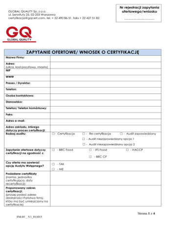 GLOBAL QUALITY Sp. z o.o. ul. Serwituty 25, 02-233 Warszawa [email protected], tel. + 22 490 86 51, faks + 22 427 51 82 Nr rejestracji zapytania ofertowego/wniosku .................................. ZAPYTANIE OFERTOWE/ WNIOSEK O CERTYFIKACJĘ Nazwa Firmy: Adres: (ulica, kod pocztowy, miasto) NIP WWW Prezes / Dyrektor: Telefon: Osoba kontaktowa: Stanowisko: Telefon/ Telefon komórkowy: Faks: Adres e-mail: Adres zakładu, którego dotyczy proces certyfikacji: Rodzaj auditu: ☐- Certyfikacja ☐ - Re-certyfikacja ☐ - Audit zapowiedziany ☐ - Audit niezapowiedziany opcja 1 ☐ - Audit niezapowiedziany opcja 2 Zapytanie ofertowe dotyczy certyfikacji na zgodność z: ☐ - BRC Food ☐ - IFS Food ☐ - HACCP ☐ - BRC CP Czy oferta ma zawierać opcję Audytu Wstępnego? ☐ - TAK ☐ - NIE Posiadane certyfikaty (norma, jednostka certyfikująca, daty recertyfikacji): Proponowany zakres certyfikacji: (proszę podać zakres działalności Państwa firmy, który ma być umieszczony na certyfikacie) Strona 1 z 4 FM-05 _ V1_011015 GLOBAL QUALITY Sp. z o.o. ul. Serwituty 25, 02-233 Warszawa [email protected], tel. + 22 490 86 51, faks + 22 427 51 82 Nr rejestracji zapytania ofertowego/wniosku .................................. Certyfikacja standardów BRC/IFS Wielkość zakładu: (Należy uwzględnić powierzchnię magazynową. Powierzchnię proszę podać w m2) Całkowita liczba pracowników: Liczba planów HACCP W przypadku BRC należy podać liczbę pracowników na głównej zmianie uwzględniając pracowników sezonowych w przeliczeniu na pełne etaty. W przypadku IFS należy podać całkowitą liczbę pracowników uwzględniając pełen etat, pół etatu, pracowników produkcyjnych, administracyjnych oraz sezonowych Kategorie oraz zakresy technologiczne IFS Proszę zaznaczyć kategorię produktową oraz zakres technologiczny zgodny z Państwa działalnością 1. Czerwone i białe mięso, produkty drobiowe i mięsne 3. Jaja i produkty jajeczne 5. Owoce i warzywa ☐ ☐ ☐ 2. Ryby i produkty rybne ☐ 4. Produkty mleczne ☐ 6. Produkty zbożowe, płatki zbożowe, przemysłowe wyroby piekarnicze i cukiernicze, słodycze, przekąski ☐ 7. Produkty wieloskładnikowe ☐ 8. Napoje ☐ 9. Oleje i tłuszcze ☐ 10. Produkty sypkie, inne składniki i dodatki ☐ 11. Żywność dla zwierząt ☐ P1. Sterylizacja ☐ P2. Termiczna pasteryzacja. UHT/sceptyczne napełnianie, gorące napełnianie. Inne techniki pasteryzacyjne, np. pasteryzacja pod wysokim ciśnieniem, mikrofale ☐ P3. Napromieniowanie żywności ☐ P4. Utrwalanie : solenie, marynowanie, słodzenie, zakwaszanie/kwaszenie, peklowanie, wędzenie itp. Fermentacja, zakwaszanie P5. Parowanie/odwadnianie, filtracja próżniowa, liofilizacja, mikrofiltracja (rozmiar oczek mniejszy niż 10 µ ) ☐ ☐ P6. Zamrażanie (przynajmniej -18°C / 0°F) włączając przechowywanie. Szybkie zamrażanie, chłodzenie, procesy schładzania i przechowywania chłodniczego. ☐ Strona 2 z 4 FM-05 _ V1_011015 GLOBAL QUALITY Sp. z o.o. ul. Serwituty 25, 02-233 Warszawa [email protected], tel. + 22 490 86 51, faks + 22 427 51 82 P7. Antymikrobiologiczne zanurzanie/natryskiwanie, fumigacja P9. Procesy w celu zapobieżenia zanieczyszczaniu mikrobiologicznemu, poprzez wysoką kontrolę higieny i/lub specyficzną infrastrukturę podczas obsługi, zabiegu i/lub przetwarzania, np. technologia czystego pomieszczenia, „biała sala”, kontrolowana temperatura pomieszczenia pracy w celu zapewnienia bezpieczeństwa żywności, dezynfekcja po czyszczeniu, pozytywne układy ciśnienia powietrza (jak filtracja poniżej 10µ, dezynfekcja po czyszczeniu) ☐ Nr rejestracji zapytania ofertowego/wniosku .................................. P8. Pakowanie MAP, pakowanie w próżni ☐ P10. Szczegółowe techniki separacji: np. Filtracja na zasadzie odwróconej osmozy, użycia węgla aktywnego ☐ P11. Gotowanie, pieczenie, butelkowanie, napełnianie lepkimi produktami, warzenie, fermentacja (np. wino), suszenie, smażenie, pieczenie, ekstrudowanie, ubijanie ☐ P13. Destylacja, oczyszczanie, parowanie, studzenie, uwodorowanie, mielenie ☐ ☐ P12. Powlekanie, panierowanie, ubijanie, cięcie, krojenie, krojenie w kostkę, ćwiartowanie, mieszanie, faszerowanie, ubój, sortowanie, manipulowanie., pakowanie. Przechowywanie w kontrolowanych warunkach (atmosfera) z wyjątkiem temperatury Kategorie BRC Proszę zaznaczyć właściwą kategorię zgodną z Państwa działalnością ☐ 1. Surowe czerwone mięso 2. Drób surowy ☐ ☐ 3. Produkty przygotowywane z surowizny (mięsne, rybne i wegetariańskie) ☐ 4. Produkty i przetwory z ryb surowych ☐ 5. Owoce, warzywa i orzechy ☐ 6. Owoce, warzywa i orzechy przetworzone ☐ 7. Nabiał, jaja w stanie płynnym ☐ ☐ 9. Produkty z mięsa surowego i ryb surowych: suszone, zasalane, marynowane, wędzone lub fermentowane ☐ 8. Produkty mięsne/rybne po obróbce termicznej 10. Dania i kanapki gotowe; desery gotowe do spożycia 11. Produkty mocno/słabo kwaśne w konserwach/opakowaniach szklanych ☐ 12. Napoje ☐ 13. Napoje alkoholowe i produkty fermentowane/warzone ☐ 14. Pieczywo ☐ 15. Żywność suszona i składniki ☐ 16. Słodycze ☐ ☐ Strona 3 z 4 FM-05 _ V1_011015 Nr rejestracji zapytania ofertowego/wniosku GLOBAL QUALITY Sp. z o.o. ul. Serwituty 25, 02-233 Warszawa [email protected], tel. + 22 490 86 51, faks + 22 427 51 82 17. Płatki śniadaniowe i przekąski ☐ .................................. 18. Oleje i tłuszcze ☐ W przypadku auditu BRC/IFS, klienci zmieniający jednostkę proszeni są o przesłanie : BRC -ostatni raport oraz certyfikat IFS - ostatni raport, certyfikat oraz action plan Adnotacje JC: Kompetentny personel Przegląd: Auditor: Decyzja dotycząca akceptacji lub odrzucenia wniosku o certyfikację ☐ - Akceptacja ☐ - Odrzucenie* Weryfikacja oraz decyzja: Przeglądu dokonał/dokonali (data i podpis): *-proszę podać uzasadnienie odrzucenia Strona 4 z 4 FM-05 _ V1_011015