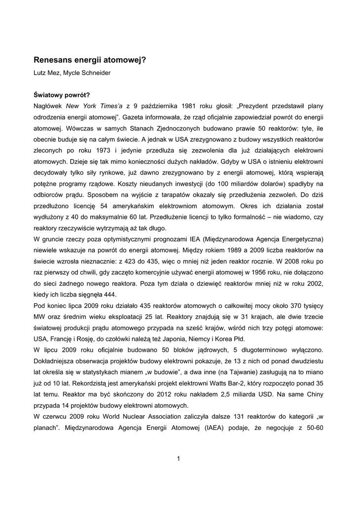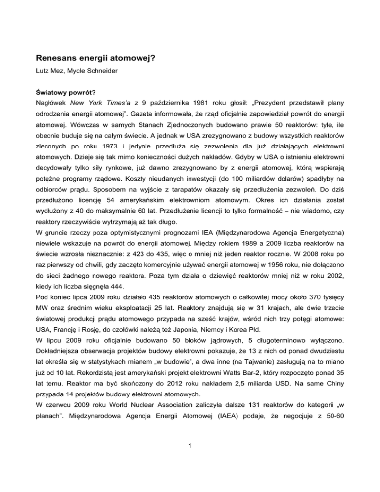 Renesans energii atomowej? Lutz Mez, Mycle Schneider Światowy powrót? Nagłówek New York Times’a z 9 października 1981 roku głosił: „Prezydent przedstawił plany odrodzenia energii atomowej”. Gazeta informowała, że rząd oficjalnie zapowiedział powrót do energii atomowej. Wówczas w samych Stanach Zjednoczonych budowano prawie 50 reaktorów: tyle, ile obecnie buduje się na całym świecie. A jednak w USA zrezygnowano z budowy wszystkich reaktorów zleconych po roku 1973 i jedynie przedłuża się zezwolenia dla już działających elektrowni atomowych. Dzieje się tak mimo konieczności dużych nakładów. Gdyby w USA o istnieniu elektrowni decydowały tylko siły rynkowe, już dawno zrezygnowano by z energii atomowej, którą wspierają potężne programy rządowe. Koszty nieudanych inwestycji (do 100 miliardów dolarów) spadłyby na odbiorców prądu. Sposobem na wyjście z tarapatów okazały się przedłużenia zezwoleń. Do dziś przedłużono licencję 54 amerykańskim elektrowniom atomowym. Okres ich działania został wydłużony z 40 do maksymalnie 60 lat. Przedłużenie licencji to tylko formalność – nie wiadomo, czy reaktory rzeczywiście wytrzymają aż tak długo. W gruncie rzeczy poza optymistycznymi prognozami IEA (Międzynarodowa Agencja Energetyczna) niewiele wskazuje na powrót do energii atomowej. Między rokiem 1989 a 2009 liczba reaktorów na świecie wzrosła nieznacznie: z 423 do 435, więc o mniej niż jeden reaktor rocznie. W 2008 roku po raz pierwszy od chwili, gdy zaczęto komercyjnie używać energii atomowej w 1956 roku, nie dołączono do sieci żadnego nowego reaktora. Poza tym działa o dziewięć reaktorów mniej niż w roku 2002, kiedy ich liczba sięgnęła 444. Pod koniec lipca 2009 roku działało 435 reaktorów atomowych o całkowitej mocy około 370 tysięcy MW oraz średnim wieku eksploatacji 25 lat. Reaktory znajdują się w 31 krajach, ale dwie trzecie światowej produkcji prądu atomowego przypada na sześć krajów, wśród nich trzy potęgi atomowe: USA, Francję i Rosję, do czołówki należą też Japonia, Niemcy i Korea Płd. W lipcu 2009 roku oficjalnie budowano 50 bloków jądrowych, 5 długoterminowo wyłączono. Dokładniejsza obserwacja projektów budowy elektrowni pokazuje, że 13 z nich od ponad dwudziestu lat określa się w statystykach mianem „w budowie”, a dwa inne (na Tajwanie) zasługują na to miano już od 10 lat. Rekordzistą jest amerykański projekt elektrowni Watts Bar-2, który rozpoczęto ponad 35 lat temu. Reaktor ma być skończony do 2012 roku nakładem 2,5 miliarda USD. Na same Chiny przypada 14 projektów budowy elektrowni atomowych. W czerwcu 2009 roku World Nuclear Association zaliczyła dalsze 131 reaktorów do kategorii „w planach”. Międzynarodowa Agencja Energii Atomowej (IAEA) podaje, że negocjuje z 50-60 1 państwami budowę elektrowni atomowych1. Realny rozwój technologii jądrowej pokazuje jednak, że reaktory „w planach” wcale nie zmieniają się w kategorię „w budowie”. Ogromna większość państw radzi sobie bez energii atomowej. Elektrowni atomowych nie posiada 161 z 192 członków ONZ. Większość potencjalnych debiutantów w tej dziedzinie nie ma odpowiednio wykwalifikowanej kadry, instytucji nadzoru atomowego, minimum prawnych regulacji ani niezbędnej sieci energetycznej, aby rozwijać energetykę atomową. Dla przykładu żaden z krajów północnoafrykańskich, które francuski prezydent zasypywał ofertami atomowymi, nie dysponuje więcej niż 6,5 tysiąca MW mocy zainstalowanej. IAEO zakłada, że moc bloku reaktora jądrowego nie może przekraczać 10% całej mocy zainstalowanej w danym kraju w źródłach wytwarzających energię elektryczną. Większości „zainteresowanych” krajów wiele brakuje do spełnienia tego warunku. W krajach, w których sieć energetyczna odpowiada tym wymaganiom, wprowadzenie energii atomowej napotyka na inne bariery: pasywne albo krytyczne rządy (Australia, Norwegia, Malezja, Tajlandia), sprzeciw opinii publicznej (Włochy, Turcja), międzynarodowe zastrzeżenia odnośnie rozprzestrzeniania broni jądrowej (Egipt, Izrael), problemy ekonomiczne (Polska), niewłaściwe warunki naturalne, jak wulkany i trzęsienia ziemi (Indonezja) oraz brak niezbędnej infrastruktury (Wenezuela). Wiele krajów musiałoby pokonać kilka przeszkód naraz2. W świetle tych faktów mówienie o światowym renesansie energii atomowej jest bardzo odważne, zwłaszcza że długie okresy planowania i budowy pociągają za sobą wysokie koszty, których nie sfinansuje żaden bank na świecie, chyba że ryzyko finansowe przejmie państwo. Poza tym zamknięcie 127 reaktorów ze średnim wiekiem eksploatacji 22 lata wskazuje na zupełnie inny kierunek zmian. Tylko w 2006 roku zamknięto w sumie osiem reaktorów, wszystkie w Europie. Uruchomiono przy tym tylko dwa oraz zaczęto budowę sześciu. Do 2015 roku w sumie 95 reaktorów osiągnie zatwierdzony okres eksploatacji 40 lat, a do 2025 dalsze 192 zostanie odłączonych od sieci. Gdyby uruchomić wszystkie znajdujące się aktualnie w budowie reaktory, trzeba byłoby zaplanować i zbudować do 2015 jeszcze 45. Aby wyrównać zmniejszenie mocy spowodowane wyłączeniem reaktorów, trzeba by wprowadzić do sieci w sumie do 2025 roku 240 dodatkowych reaktorów o łącznej mocy ponad 200 tysięcy MW. Ponieważ leadtime – czas między zaplanowaniem budowy lub decyzją o budowie a komercyjnym uruchomieniem elektrowni atomowej – wynosi ponad 10 lat, utrzymanie dostępnej dziś mocy oraz liczby działających elektrowni atomowych wydaje się niemożliwe. 1 Simonitsch, Pierre (2009): Comeback der Atomenergie. IAEA-Konferenz von 65 Staaten in Peking, in: Frankfurter Rundschau, 20.4.2009. 2 Schneider, Mycle et al. (2009): Welt Statusbericht Atomindustrie 2009, im Auftrag des Bundesministeriums für Umwelt, Naturschutz und Reaktorsicherheit, August 2009, http://www.nrc.gov/reading-rm/doc-collections/new