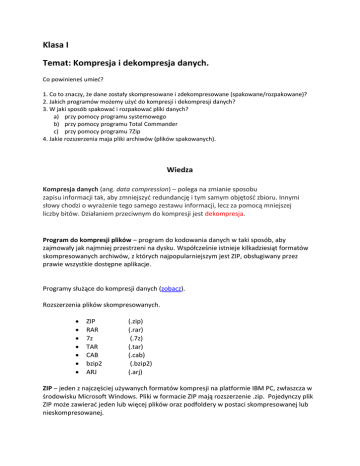 Klasa I Temat: Kompresja i dekompresja danych. Co powinieneś umied? 1. Co to znaczy, że dane zostały skompresowane i zdekompresowane (spakowane/rozpakowane)? 2. Jakich programów możemy użyd do kompresji i dekompresji danych? 3. W jaki sposób spakowad i rozpakowad pliki danych? a) przy pomocy programu systemowego b) przy pomocy programu Total Commander c) przy pomocy programu 7Zip 4. Jakie rozszerzenia maja pliki archiwów (plików spakowanych). Wiedza Kompresja danych (ang. data compression) – polega na zmianie sposobu zapisu informacji tak, aby zmniejszyd redundancję i tym samym objętośd zbioru. Innymi słowy chodzi o wyrażenie tego samego zestawu informacji, lecz za pomocą mniejszej liczby bitów. Działaniem przeciwnym do kompresji jest dekompresja. Program do kompresji plików – program do kodowania danych w taki sposób, aby zajmowały jak najmniej przestrzeni na dysku. Współcześnie istnieje kilkadziesiąt formatów skompresowanych archiwów, z których najpopularniejszym jest ZIP, obsługiwany przez prawie wszystkie dostępne aplikacje. Programy służące do kompresji danych (zobacz). Rozszerzenia plików skompresowanych. ZIP RAR 7z TAR CAB bzip2 ARJ (.zip) (.rar) (.7z) (.tar) (.cab) (.bzip2) (.arj) ZIP – jeden z najczęściej używanych formatów kompresji na platformie IBM PC, zwłaszcza w środowisku Microsoft Windows. Pliki w formacie ZIP mają rozszerzenie .zip. Pojedynczy plik ZIP może zawierad jeden lub więcej plików oraz podfoldery w postaci skompresowanej lub nieskompresowanej. RAR - format kompresji danych, stworzony przez Rosjanina Jewgienija Roszała. RAR posiada wolniejszy rodzaj kompresji niż ZIP, ale w większości przypadków skuteczniejszy. Pliki w formacie RAR mają rozszerzenie .rar lub od .r00 do .r99. 7z jest formatem kompresji danych o otwartej architekturze. Format ten stawia nacisk na wysoki stopieo kompresji i silne szyfrowanie (AES-256). 7z dzięki swojej architekturze ma możliwośd używania dowolnej metody kompresji. Maksymalna wielkośd archiwum jest określona na poziomie 16 000 000 000 GB. TAR (nazwa pochodzi od angielskiego Tape ARchiver - ARchiwizator Taśm) to uniksowy program do umieszczania grupy plików w jednym zbiorczym pliku. Cabinet (CAB) - format archiwizacji danych, pierwotnie wykorzystywany w systemie operacyjnym Microsoft Windows. Umożliwia kompresję danych oraz elektroniczne podpisanie archiwum. ARJ jest jednym z formatów kompresji danych oraz programem do kompresji i dekompresji tego typu plików. Został stworzony przez Roberta K. Junga. Wersja 1.0 powstała w lutym 1991 roku. Nazwa wywodzi się od ang. archived by Robert Jung (skompresowane przez Roberta Junga). Ćwiczenia W programie Word 2003 utwórz dokument tekstowy i zapisz w nim: a) temat lekcji b) co to jest kompresja i dekompresja (krótko i swoimi słowami) c) wymieo pięd programów służących do kompresji danych i podaj rozszerzenia plików jakie tworzą te programy. Program Rozszerzenie d) pobierz z SERWERA archiwum "paczka1" i odpowiedz na pytania: ile jest w tym archiwum plików? jakie pliki znajdują się w archiwum (podaj typ pliku) e) pobierz z Internetu pięd zdjęd na dowolny temat, utwórz archiwum o nazwie "paczka2" i wyślij to archiwum na SERWER.