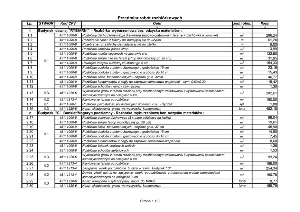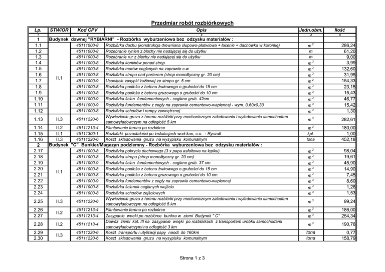 Przedmiar robót rozbiórkowych Lp. STWiOR 1 1 1.1 1.2 1.3 1.4 1.5 1.6 1.7 1.8 1.9 1.10 1.11 1.12 1.13 1.14 1.15 1.16 2 2.17 2.18 2.19 2.20 2.21 2.22 2.23 2.24 2.25 Kod CPV Opis Jedn.obm. 2 3 4 Ilo 5 Budynek dawnej "RYBIARNI" - Rozbórka wyburzeniowa bez odzysku materia ów : II.1 45111000-8 45111000-8 45111000-8 45111000-8 45111000-8 45111000-8 45111000-9 45111000-8 45111000-8 45111000-9 45111000-9 45111000-8 II.3 45111220-6 Rozbiórka dachu (konstrukcja drewniana s upowo-p atwiowa + acenie + dachówka w koronk ) Rozebranie rynien z blachy nie nadaj cej si do u ytku Rozebranie rur z blachy nie nadaj cej si do u ytku Rozbiórka kominów ponad strop Rozbiórka murów ceglanych na zaprawie c-w Rozbiórka stropu nad parterem (strop monolityczny gr. 20 cm) Usuni cie zasypki lowej ze stropu gr. 5 cm Rozbiórka pod a z betonu wirowego o grubo ci do 15 cm Rozbiórka pod a z betonu gruzowego o grubo ci do 10 cm Rozbiórka cian fundamentowych - ceglane grub. 42cm Rozbiórka fundamentów z ceg y na zaprawie cementowo-wapiennej - wym. 0,60x0,30 Rozbiórka schodów i rampy zewn trznej Wywiezienie gruzu z terenu rozbiórki przy mechanicznym za adowaniu i wy adowaniu samochodem samowy adowczym na odleg 5 km Plantowanie terenu po rozbiórce Rozbiórki pozosta ci po instalacjach wod-kan, c.o. - Rycza t Koszt sk adowania gruzu na wysypisku komunalnym 45111213-4 II.2 45111300-1 II.1 45111220-6 II.3 Budynek "C" Bunkier/Magazyn podziemny - Rozbórka wyburzeniowa bez odzysku materia ów : II.1 45111000-8 45111000-8 45111000-9 45111000-8 45111000-8 45111000-9 45111000-8 45111000-8 II.3 45111220-6 2.26 2.27 II.2 45111213-4 45111213-4 2.28 II.2 45111213-4 2.29 2.30 II.3 45111220-6 45111220-6 Rozbiórka pokrycia dachowego (3 x papa asfaltowa na lepiku) Rozbiórka stropu (strop monolityczny gr. 20 cm) Rozbiórka cian fundamentowych - ceglane grub. 37 cm Rozbiórka pod a z betonu wirowego o grubo ci do 15 cm Rozbiórka pod a z betonu gruzowego o grubo ci do 10 cm Rozbiórka fundamentów z ceg y na zaprawie cementowo-wapiennej Rozbiórka cianek ceglanych wej cia Rozbiórka schodów zej ciowych Wywiezienie gruzu z terenu rozbiórki przy mechanicznym za adowaniu i wy adowaniu samochodem samowy adowczym na odleg 5 km Plantowanie terenu po rozbiórce Zasypanie wneki po rozbiórce bunkra w ziemi Budynek " C" Dowóz ziemi kat. III na zasypanie wn ki po rozbiórkach z transportem urobku samochodami samowy adowczymi na odleg 3 km Koszt transportu i utylizacji papy naodl. do 160km Koszt sk adowania gruzu na wysypisku komunalnym Strona 1 z 3 2 m 3 m 3 m 2 m 3 m 3 m 3 m 3 m 3 m 286,24 61,20 9,00 3,99 132,60 31,95 154,33 23,15 15,43 46,77 15,42 1,30 m3 282,61 2 180,00 1,00 452,18 m 3 m 3 m 3 m 3 m 3 m 3 m 3 m 2 98,04 19,61 45,90 14,90 7,45 8,60 1,26 1,53 m3 99,24 2 m 3 m 186,00 254,34 m3 190,76 tona tona 0,77 158,79 m m m 3 m kpl. tona Przedmiar robót rozbiórkowych Lp. STWiOR 1 3 3.31 3.32 3.33 3.34 3.35 3.36 3.37 3.38 3.39 3.40 3.41 3.42 4.58 4.59 4.60 Opis Jedn.obm. 2 3 4 Ilo 5 Budynek "A" - Rozbórka wyburzeniowa bez odzysku materia ów : II.1 45111000-8 45111000-8 45111000-8 45111000-8 45111000-8 45111000-8 45111000-8 45111000-8 45111000-9 II.3 45111220-6 II.2 3.43 3.44 3.45 3.46 4 4.47 4.48 4.49 4.50 4.51 4.52 4.53 4.54 4.55 4.56 4.57 Kod CPV 45111213-4 45111213-4 45111213-4 II.1 II.3 45111300-1 45111220-6 45111220-6 Rozbiórka pokrycia dachowego (3 x papa asfaltowa na lepiku) Rozebranie rynien z blachy nie nadaj cej si do u ytku Rozebranie rur z blachy nie nadaj cej si do u ytku Rozbiórka obróbek blacharskich Rozbiórka stropów DZ-3 Rozbiórka murów ceglanych na zaprawie c-w Rozbiórka pod a z betonu wirowego o grubo ci do 15 cm Rozbiórka pod a z betonu gruzowego o grubo ci do 10 cm Rozbiórka fundamentów z ceg y na zaprawie cementowo-wapiennej Wywiezienie gruzu z terenu rozbiórki przy mechanicznym za adowaniu i wy adowaniu samochodem samowy adowczym na odleg 5 km Plantowanie terenu po rozbiórce Zasypywanie wykopów po rozbiórkach Dowóz ziemi kat. III na zasypanie wykopów po rozbiórkach z transportem urobku samochodami samowy adowczymi na odleg 3 km Rozbiórki pozosta ci po instalacjach wod-kan, c.o. - Rycza t Koszt transportu i utylizacji papy naodl. do 160km Koszt sk adowania gruzu na wysypisku komunalnym 2 m 3 m 3 m 3 m 3 m 3 m 155,93 18,90 5,00 21,12 49,90 42,71 19,97 7,99 14,04 m3 134,60 2 m 3 m 184,08 55,22 m3 55,22 m m m 2 kpl. tona tona 1,00 1,22 158,79 Budynek "B" - Rozbórka wyburzeniowa bez odzysku materia ów : II.1 45111000-8 45111000-8 45111000-8 45111000-8 45111000-8 45111000-8 45111000-8 45111000-8 45111000-8 45111000-8 45111000-9 II.3 45111220-6 II.2 45111213-4 45111213-4 Rozbiórka pokrycia dachowego (3 x papa asfaltowa na lepiku) Rozebranie rynien z blachy nie nadaj cej si do u ytku Rozebranie rur z blachy nie nadaj cej si do u ytku Rozbiórka obróbek blacharskich Rozbiórka stropu z dyli elbet. grub. 8cm + wylewka 5cm na belkach elbetowych Rozbiórka lepego pu apu z p yt pojedynczych Suprema na ruszcie drewnianym Rozbiórka murów ceglanych na zaprawie c-w Rozbiórka pod a z betonu wirowego o grubo ci do 20 cm Rozbiórka pod a z betonu gruzowego o grubo ci do 5 cm Rozbiórka schodów zewn trznych Rozbiórka cian fundamentowych i fundamentów z ceg y gr. 25 cm Wywiezienie gruzu z terenu rozbiórki przy mechanicznym za adowaniu i wy adowaniu samochodem samowy adowczym na odleg 5 km Plantowanie terenu po rozbiórce Zasypywanie wykopów po rozbiórkach Strona 2 z 3 2 m 3 m 2 m 3 m m3 3 m 3 m 3 m 227,76 45,10 5,00 29,04 29,61 186,71 59,12 37,34 14,94 1,45 26,15 m3 176,08 2 278,91 120,88 m m m 2 m 3 m Przedmiar robót rozbiórkowych Lp. 1 STWiOR II.2 4.61 4.62 4.63 4.64 5 5.65 Kod CPV Opis Jedn.obm. 2 3 4 45111213-4 II.1 II.3 45111300-1 45111220-6 45111220-6 Dowóz ziemi kat. III na zasypanie wn ki po rozbiórkach z transportem urobku samochodami samowy adowczymi na odleg 3 km Rozbiórki pozosta ci po instalacjach wod-kan, c.o. - Rycza t Koszt transportu i utylizacji papy naodl. do 160km Kosz