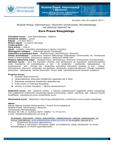 Wrocław, dnia 30 kwietnia 2013 r. Wydział Prawa, Administracji i Ekonomii Uniwersytetu Wrocławskiego ma zaszczyt zaprosić na Kurs Prawa Rosyjskiego Charakter kursu – kurs dokształcający, odpłatny Dziedzina wiedzy – prawo Edycja – 1-6 lipca 2013 r. Status edycji – w trakcie rekrutacji Liczba godzin – 46 Cena kursu – 1350 zł Język - wykłady i warsztaty prowadzone w języku rosyjskim Wymagania wstępne - znajomość języka rosyjskiego Jednostka prowadząca kurs – Wydział Prawa, Administracji i Ekonomii Osoby prowadzące – pracownicy naukowi Bałtyckiego Federalnego Uniwersytetu im. Immanuela Kanta w Kaliningradzie, pracownicy naukowi i doktoranci WPAE UWr. Miejsce odbywania zajęć - Wydział Prawa, Administracji i Ekonomii Uniwersytetu Wrocławskiego Adresaci kursu – kurs ma charakter otwarty, jest adresowany do wszystkich zainteresowanych osób, niezależnie od wykształcenia, w tym - do studentów i praktyków. Specjalizacja ta przeznaczona jest również dla studentów wszystkich kierunków studiów, w tym - prawa, administracji, ekonomii, politologii, europeistyki, stosunków międzynarodowych, filologii rosyjskiej, praktyków - adwokatów, radców prawnych i innych osób zainteresowanych prawem rosyjskim. Program kursu: 1. Rosyjski język prawniczy 2. Ustawodawstwo dotyczące działalności gospodarczej w Rosji 3. Regulacja podatkowa działalności gospodarczej 4. Prawo pracy w Federacji Rosyjskiej 5. Umowy w prawie rosyjskim i obrocie ekonomicznym Zadaniem kursu jest zdobycie wiedzy z zakresu podstawowych zagadnień prawa rosyjskiego oraz pogłębienie znajomości rosyjskiego języka prawniczego. Celem szkolenia jest nabycie nowych kwalifikacji zawodowych przez uczestników kursu. Ukończenie kursu - Absolwenci otrzymują zaświadczenie o ukończeniu kursu prawa rosyjskiego. Adres: Sekcja Obsługi Studiów Doktoranckich i Innych Form Kształcenia Wydział Prawa, Administracji i Ekonomii Uniwersytetu Wrocławskiego, Wrocław 50-138, ul. Kuźnicza 46/47, telefon: 71 37-52-371, e-mail: [email protected] Wymagane dokumenty (wzory dokumentów zgłoszeniowych zostaną zamieszczone na stronie internetowej: www.podyplomowe.prawo.uni.wroc.pl na początku czerwca br.): • Wypełniony formularz zgłoszeniowy, • Umowa o warunkach wnoszenia opłaty za świadczone usługi edukacyjne na kursie dokształcającym (w dwóch egzemplarzach).