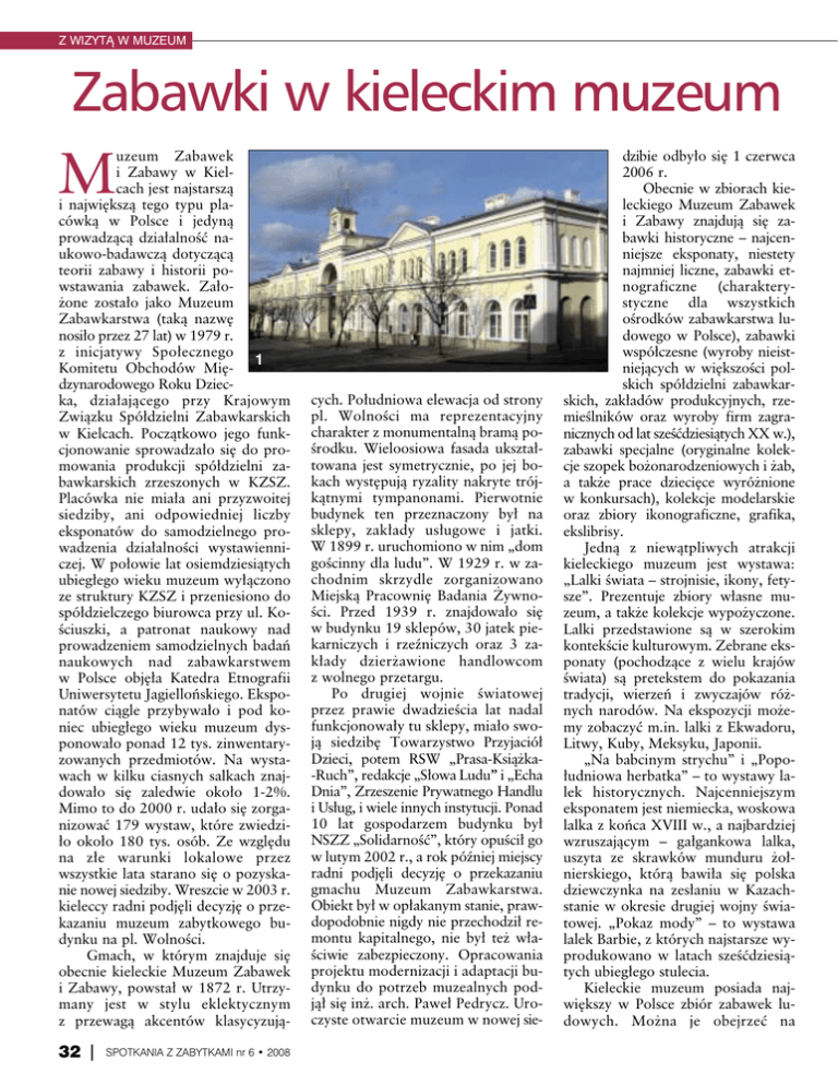 Z WIZYTĄ W MUZEUM Zabawki w kieleckim muzeum uzeum Zabawek i Zabawy w Kielcach jest najstarszą i największą tego typu placówką w Polsce i jedyną prowadzącą działalność naukowo-badawczą dotyczącą teorii zabawy i historii powstawania zabawek. Założone zostało jako Muzeum Zabawkarstwa (taką nazwę nosiło przez 27 lat) w 1979 r. z inicjatywy Społecznego 1 Komitetu Obchodów Międzynarodowego Roku Dziecka, działającego przy Krajowym Związku Spółdzielni Zabawkarskich w Kielcach. Początkowo jego funkcjonowanie sprowadzało się do promowania produkcji spółdzielni zabawkarskich zrzeszonych w KZSZ. Placówka nie miała ani przyzwoitej siedziby, ani odpowiedniej liczby eksponatów do samodzielnego prowadzenia działalności wystawienniczej. W połowie lat osiemdziesiątych ubiegłego wieku muzeum wyłączono ze struktury KZSZ i przeniesiono do spółdzielczego biurowca przy ul. Kościuszki, a patronat naukowy nad prowadzeniem samodzielnych badań naukowych nad zabawkarstwem w Polsce objęła Katedra Etnografii Uniwersytetu Jagiellońskiego. Eksponatów ciągle przybywało i pod koniec ubiegłego wieku muzeum dysponowało ponad 12 tys. zinwentaryzowanych przedmiotów. Na wystawach w kilku ciasnych salkach znajdowało się zaledwie około 1-2%. Mimo to do 2000 r. udało się zorganizować 179 wystaw, które zwiedziło około 180 tys. osób. Ze względu na złe warunki lokalowe przez wszystkie lata starano się o pozyskanie nowej siedziby. Wreszcie w 2003 r. kieleccy radni podjęli decyzję o przekazaniu muzeum zabytkowego budynku na pl. Wolności. Gmach, w którym znajduje się obecnie kieleckie Muzeum Zabawek i Zabawy, powstał w 1872 r. Utrzymany jest w stylu eklektycznym z przewagą akcentów klasycyzują- M 32 SPOTKANIA Z ZABYTKAMI nr 6 • 2008 cych. Południowa elewacja od strony pl. Wolności ma reprezentacyjny charakter z monumentalną bramą pośrodku. Wieloosiowa fasada ukształtowana jest symetrycznie, po jej bokach występują ryzality nakryte trójkątnymi tympanonami. Pierwotnie budynek ten przeznaczony był na sklepy, zakłady usługowe i jatki. W 1899 r. uruchomiono w nim „dom gościnny dla ludu”. W 1929 r. w zachodnim skrzydle zorganizowano Miejską Pracownię Badania Żywności. Przed 1939 r. znajdowało się w budynku 19 sklepów, 30 jatek piekarniczych i rzeźniczych oraz 3 zakłady dzierżawione handlowcom z wolnego przetargu. Po drugiej wojnie światowej przez prawie dwadzieścia lat nadal funkcjonowały tu sklepy, miało swoją siedzibę Towarzystwo Przyjaciół Dzieci, potem RSW „Prasa-Książka-Ruch”, redakcje „Słowa Ludu” i „Echa Dnia”, Zrzeszenie Prywatnego Handlu i Usług, i wiele innych instytucji. Ponad 10 lat gospodarzem budynku był NSZZ „Solidarność”, który opuścił go w lutym 2002 r., a rok później miejscy radni podjęli decyzję o przekazaniu gmachu Muzeum Zabawkarstwa. Obiekt był w opłakanym stanie, prawdopodobnie nigdy nie przechodził remontu kapitalnego, nie był też właściwie zabezpieczony. Opracowania projektu modernizacji i adaptacji budynku do potrzeb muzealnych podjął się inż. arch. Paweł Pedrycz. Uroczyste otwarcie muzeum w nowej sie- dzibie odbyło się 1 czerwca 2006 r. Obecnie w zbiorach kieleckiego Muzeum Zabawek i Zabawy znajdują się zabawki historyczne – najcenniejsze eksponaty, niestety najmniej liczne, zabawki etnograficzne (charakterystyczne dla wszystkich ośrodków zabawkarstwa ludowego w Polsce), zabawki współczesne (wyroby nieistniejących w większości polskich spółdzielni zabawkarskich, zakładów produkcyjnych, rzemieślników oraz wyroby firm zagranicznych od lat sześćdziesiątych XX w.), zabawki specjalne (oryginalne kolekcje szopek bożonarodzeniowych i żab, a także prace dziecięce wyróżnione w konkursach), kolekcje modelarskie oraz zbiory ikonograficzne, grafika, ekslibrisy. Jedną z niewątpliwych atrakcji kieleckiego muzeum jest wystawa: „Lalki świata – strojnisie, ikony, fetysze”. Prezentuje zbiory własne muzeum, a także kolekcje wypożyczone. Lalki przedstawione są w szerokim kontekście kulturowym. Zebrane eksponaty (pochodzące z wielu krajów świata) są pretekstem do pokazania tradycji, wierzeń i zwyczajów różnych narodów. Na ekspozycji możemy zobaczyć m.in. lalki z Ekwadoru, Litwy, Kuby, Meksyku, Japonii. „Na babcinym strychu” i „Popołudniowa herbatka” – to wystawy lalek historycznych. Najcenniejszym eksponatem jest niemiecka, woskowa lalka z końca XVIII w., a najbardziej wzruszającym – gałgankowa lalka, uszyta ze skrawków munduru żołnierskiego, którą bawiła się polska dziewczynka na zesłaniu w Kazachstanie w okresie drugiej wojny światowej. „Pokaz mody” – to wystawa lalek Barbie, z których najstarsze wyprodukowano w latach sześćdziesiątych ubiegłego stulecia. Kieleckie muzeum posiada największy w Polsce zbiór zabawek ludowych. Można je obejrzeć na Z WIZYTĄ W MUZEUM 3 2 4 1. Gmach Muzeum Zabawek i Zabawy w Kielcach 2.3.4. Obiekty w zbiorach muzeum kieleckiego: lalka biskwitowa z przełomu XIX i XX w. (2), lalka-ocieplacz na czajnik, Moskwa, 1985 r. (3), żaglowiec – eksponat z wystawy „Morskie opowieści” (4) 5. Warsztaty muzealne na dziedzińcu, 2007 r. (zdjęcia: 2,3,5 – Monika Cybulska, 4 – Sergiusz Pawłowski) 5 dwóch wystawach etnograficznych: „Świętokrzyski stragan”, na którym prezentowane są zabawki wykonane przez twórców ludowych Stanisława Ciszka, Mariana Brzezińskiego, Andrzeja Kozłowskiego i Tadeusza Żaka oraz garncarzy z Ośrodka Tradycji Garncarskich w Chałupkach, i „Kolorowe traktorzyki z grabu, lipy i osiki”, prezentujące zabawki ludowe z różnych regionów kraju. „Jak wieść niesie, pojawiły się misie w lesie” – to wystawa misiów pluszowych, a najstarszy miś Stoiffa pochodzi z 1926 r. Ekspozycja pod hasłem „Wesoła Gromada” prezentuje zabawki wyprodukowane przez kielecką spółdzielnię „Gromada” w latach osiemdziesiąty