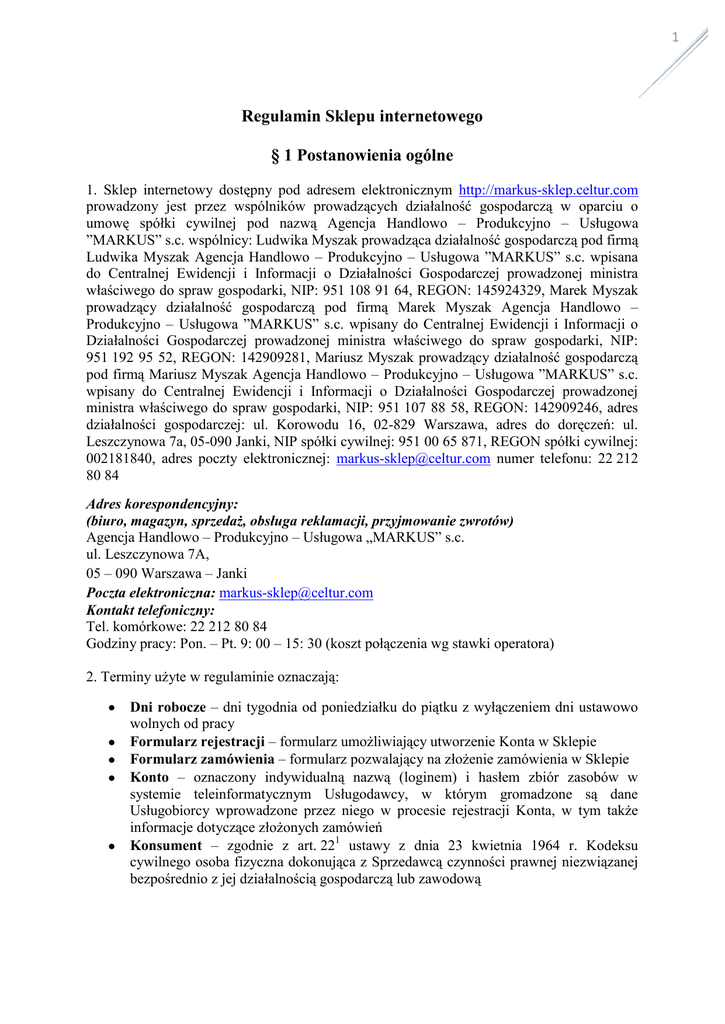 1 Regulamin Sklepu internetowego § 1 Postanowienia ogólne 1. Sklep internetowy dostępny pod adresem elektronicznym http://markus-sklep.celtur.com prowadzony jest przez wspólników prowadzących działalność gospodarczą w oparciu o umowę spółki cywilnej pod nazwą Agencja Handlowo – Produkcyjno – Usługowa ”MARKUS” s.c. wspólnicy: Ludwika Myszak prowadząca działalność gospodarczą pod firmą Ludwika Myszak Agencja Handlowo – Produkcyjno – Usługowa ”MARKUS” s.c. wpisana do Centralnej Ewidencji i Informacji o Działalności Gospodarczej prowadzonej ministra właściwego do spraw gospodarki, NIP: 951 108 91 64, REGON: 145924329, Marek Myszak prowadzący działalność gospodarczą pod firmą Marek Myszak Agencja Handlowo – Produkcyjno – Usługowa ”MARKUS” s.c. wpisany do Centralnej Ewidencji i Informacji o Działalności Gospodarczej prowadzonej ministra właściwego do spraw gospodarki, NIP: 951 192 95 52, REGON: 142909281, Mariusz Myszak prowadzący działalność gospodarczą pod firmą Mariusz Myszak Agencja Handlowo – Produkcyjno – Usługowa ”MARKUS” s.c. wpisany do Centralnej Ewidencji i Informacji o Działalności Gospodarczej prowadzonej ministra właściwego do spraw gospodarki, NIP: 951 107 88 58, REGON: 142909246, adres działalności gospodarczej: ul. Korowodu 16, 02-829 Warszawa, adres do doręczeń: ul. Leszczynowa 7a, 05-090 Janki, NIP spółki cywilnej: 951 00 65 871, REGON spółki cywilnej: 002181840, adres poczty elektronicznej: [email protected] numer telefonu: 22 212 80 84 Adres korespondencyjny: (biuro, magazyn, sprzedaż, obsługa reklamacji, przyjmowanie zwrotów) Agencja Handlowo – Produkcyjno – Usługowa „MARKUS” s.c. ul. Leszczynowa 7A, 05 – 090 Warszawa – Janki Poczta elektroniczna: [email protected] Kontakt telefoniczny: Tel. komórkowe: 22 212 80 84 Godziny pracy: Pon. – Pt. 9: 00 – 15: 30 (koszt połączenia wg stawki operatora) 2. Terminy użyte w regulaminie oznaczają: Dni robocze – dni tygodnia od poniedziałku do piątku z wyłączeniem dni ustawowo wolnych od pracy Formularz rejestracji – formularz umożliwiający utworzenie Konta w Sklepie Formularz zamówienia – formularz pozwalający na złożenie zamówienia w Sklepie Konto – oznaczony indywidualną nazwą (loginem) i hasłem zbiór zasobów w systemie teleinformatycznym Usługodawcy, w którym gromadzone są dane Usługobiorcy wprowadzone przez niego w procesie rejestracji Konta, w tym także informacje dotyczące złożonych zamówień Konsument – zgodnie z art. 221 ustawy z dnia 23 kwietnia 1964 r. Kodeksu cywilnego osoba fizyczna dokonująca z Sprzedawcą czynności prawnej niezwiązanej bezpośrednio z jej działalnością gospodarczą lub zawodową 2 Klient/Usługobiorca – osoba fizyczna, osoba prawna lub jednostka organizacyjna nieposiadająca osobowości prawnej, która korzysta z usług świadczonych drogą elektroniczną przez Usługodawcę lub, z którą może być zawarta umowa sprzedaży Sklep internetowy – sklep internetowy dostępny pod adresem elektronicznym http://markus-sklep.celtur.com Sprzedawca/Usługodawca – Agencja Handlowo – Produkcyjno – Usługowa ”MARKUS” s.c. prowadzona przez wspólników: Ludwika Myszak prowadząca działalność gospodarczą pod firmą Agencja Handlowo – Produkcyjno – Usługowa ”MARKUS” s.c. wpisana do Centralnej Ewidencji i Informacji o Działalności Gospodarczej prowadzonej ministra właściwego do spraw gospodarki, NIP: 951 108 91 64, REGON: 145924329, Marek Myszak prowadzący działalność gospodarczą pod firmą Agencja Handlowo – Produkcyjno – Usługowa ”MARKUS” s.c. wpisany do Centralnej Ewidencji i Informacji o Działalności Gospodarczej prowadzonej ministra właściwego do spraw gospodarki, NIP: 951 192 95 52, REGON: 142909281, Mariusz Myszak prowadzący działalność gospodarczą pod firmą Agencja Handlowo – Produkcyjno – Usługowa ”MARKUS” s.c. wpisany do Centralnej Ewidencji i Informacji o Działalności Gospodarczej prowadzonej ministra właściwego do spraw gospodarki, NIP: 951 107 88 58, REGON: 142909246, adres działalności gospodarczej: ul. Korowodu 16, 02-829 Warszawa, adres do doręczeń: ul. Leszczynowa 7A, 05-090 Janki, NIP spółki cywilnej: 951 00 65 871, REGON spółki cywilnej: 002181840, adres poczty elektronicznej: [email protected] numer telefonu: 22 212 80 84 3. Usługodawca świadczy usługi drogą elektroniczną zgodnie z zasadami i warunkami określonymi w niniejszym regulaminie. Regulamin jest udostępniony nieodpłatnie za pośrednictwem strony Sklepu internetowego, w formie umożliwiającej jego pozyskanie, odtworzenie i utrwalenie regulaminu za pomocą systemu teleinformatycznego, którym posługuje się Usługobiorca. Pobranie regulaminu w formacie PDF wymaga posiadania oprogramowania obsługującego pliki PDF – program można pobrać ze strony internetowej http://get.adobe.com/pl/reader 4. Usługodawca świadczy za pośrednictwem Sklepu internetowego następujące usługi: rejestracja Konta, złożenie zamówienia za pośrednictwem Formularza zamówienia, usługi dodatkowe: „Newsletter”, „Dodaj komentarz”, „Zapytaj o szczegóły”, „Dodaj do przechowalni”, „Przypomnij hasło”, „Konsultant Offline”, „Podgląd zamówienia”. 5. W sprawach nieuregulowanych niniejszym regulaminem zastosowanie znajdą przepisy powszechnie obowiązującego prawa polskiego, w szczególności ustawy z dnia 18 lipca 2002 r. o świadczeniu usług drogą elektroniczną (Dz.U. 2002 nr 144 poz. 1204), ustawy z dnia 30 maja 2014 r. o prawach konsumenta (Dz.U. 2014 r. poz. 827 ze zm.), ustawy z dnia 23 kwietnia 1964 r. Kodeks cywilny (Dz.U. nr 16, poz. 93 z późn. zm.), ustawy z dnia 29 sierpnia 1997 r. o ochronie danych osobowych (Dz.U. 1997 nr 131, poz. 883 z późn. zm.) oraz inne właściwe przepisy. § 2 Warunki świadczenia usług drogą elektroniczną 1. Świadczenie usług drogą elektroniczną odb