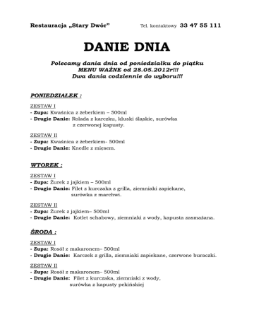 Restauracja „Stary Dwór” Tel. kontaktowy 33 47 55 111 DANIE DNIA Polecamy dania dnia od poniedziałku do piątku MENU WAŻNE od 28.05.2012r!!! Dwa dania codziennie do wyboru!!! PONIEDZIAŁEK : ZESTAW I - Zupa: Kwaśnica z żeberkiem – 500ml - Drugie Danie: Rolada z karczku, kluski śląskie, surówka z czerwonej kapusty. ZESTAW II - Zupa: Kwaśnica z żeberkiem- 500ml - Drugie Danie: Knedle z mięsem. WTOREK : ZESTAW I - Zupa: Żurek z jajkiem – 500ml - Drugie Danie: Filet z kurczaka z grilla, ziemniaki zapiekane, surówka z marchwi. ZESTAW II - Zupa: Żurek z jajkiem– 500ml - Drugie Danie: Kotlet schabowy, ziemniaki z wody, kapusta zasmażana. ŚRODA : ZESTAW I - Zupa: Rosół z makaronem– 500ml - Drugie Danie: Karczek z grilla, ziemniaki zapiekane, czerwone buraczki. ZESTAW II - Zupa: Rosół z makaronem– 500ml - Drugie Danie: Filet z kurczaka, ziemniaki z wody, surówka z kapusty pekińskiej Restauracja „Stary Dwór” Tel. kontaktowy 33 47 55 111 CZWARTEK : ZESTAW I - Zupa: Pomidorowa z ryżem – 500ml - Drugie Danie: Kordon z ogórkiem i szynką, puree ziemniaczane, surówka z czerwonej kapusty. ZESTAW II - Zupa: Pomidorowa z ryżem– 500ml - Drugie Danie: Pieczeń z sosem, ziemniaki zapiekane, surówka z białej kapusty. PIĄTEK : ZESTAW I - Zupa: Barszcz czerwony z pierogami– 500ml - Drugie Danie: Pstrąg, frytki, surówka z białej kapusty. ZESTAW II - Zupa: Barszcz czerwony z pierogami– 500ml - Drugie Danie: Dorsz, ziemniaki , kapusta kiszona. CENA ZESTAWU: 18zł DOWÓZ W GODZINACH 10.00 – 16.00!!! NA TERENIE ŻYWCA – GRATIS ! ! ! PRZY ZAMÓWIENIU 10 PORCJI – 10% RABATU ! ! ! DLA KLIENTÓW SPOŻYWAJĄCYCH POSIŁKI W RESTAURACJI 5% RABATU ! ! ! Restauracja „Stary Dwór” Ul. Ks. Pr. St. Słonki 22B 34-300 Żywiec Tel. kontaktowy 33 47 55 111 SAŁATKI: - Z TUŃCZYKIEM - Z ŁOSOSIEM - Z KURCZAKIEM - Z POLĘDWICĄ CENA - 13zł/porcja PIEROGI: - Z MIĘSEM Z KAPUSTĄ RUSKIE MIX CENA – 12zł/ porcja (12szt.) MROŻONKI: - PIEROGI – 7zł/10szt. - USZKA Z MIĘSEM – 5zł/10szt. ZAPRASZAMY !!! RESTAURACJA CZYNNA CODZIENNIE OD GODZ. 9.00 DO GODZ. 21.00
