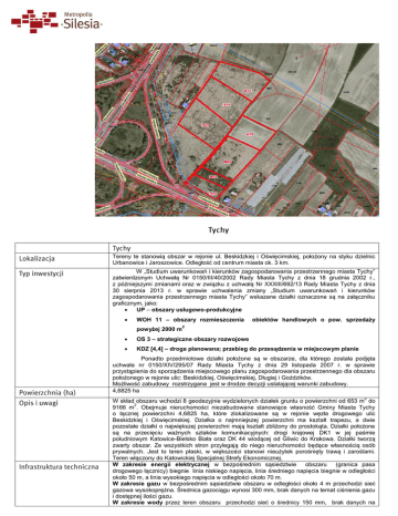Tereny te stanowią obszar w rejonie ul. Beskidzkiej i Oświęcimskiej, położony na styku dzielnic Urbanowice i Jaroszowice. Odległość od centrum miasta ok. 3 km. W „Studium uwarunkowań i kierunków zagospodarowania przestrzennego miasta Tychy” zatwierdzonym Uchwałą Nr 0150/III/40/2002 Rady Miasta Tychy z dnia 18 grudnia 2002 r., z późniejszymi zmianami oraz w związku z uchwałą Nr XXXIII/692/13 Rady Miasta Tychy z dnia 30 sierpnia 2013 r. w sprawie uchwalenia zmiany „Studium uwarunkowań i kierunków zagospodarowania przestrzennego miasta Tychy” wskazane działki oznaczone są na załączniku graficznym, jako: UP – obszary usługowo-produkcyjne WOH 11 – obszary rozmieszczenia powyżej 2000 m obiektów handlowych o pow. sprzedaży 2 OS 3 – strategiczne obszary rozwojowe KDZ [4,4] – droga planowana; przebieg do przesądzenia w miejscowym planie Ponadto przedmiotowe działki położone są w obszarze, dla którego została podjęta uchwała nr 0150/XIV/295/07 Rady Miasta Tychy z dnia 29 listopada 2007 r. w sprawie przystąpienia do sporządzenia miejscowego planu zagospodarowania przestrzennego dla obszaru położonego w rejonie ulic: Beskidzkiej, Oświęcimskiej, Długiej i Goździków. Możliwość zabudowy rozstrzygana jest w drodze decyzji ustalającej warunki zabudowy. 4,6825 ha 2 W skład obszaru wchodzi 8 geodezyjnie wydzielonych działek gruntu o powierzchni od 653 m do 2 9166 m . Obejmuje nieruchomości niezabudowane stanowiące własność Gminy Miasta Tychy o łącznej powierzchni 4,6825 ha, które zlokalizowane są w rejonie węzła drogowego ulic Beskidzkiej i Oświęcimskiej. Działka o najmniejszej powierzchni ma kształt trapezu, a dwie pozostałe działki o największej powierzchni mają kształt zbliżony do prostokąta. Działki położone są na przecięciu ważnych szlaków komunikacyjnych: drogi krajowej DK1 w jej paśmie południowym Katowice-Bielsko Biała oraz DK 44 wiodącej od Gliwic do Krakowa. Działki tworzą zwarty obszar. Ze wszystkich stron przylegają do niego nieruchomości będące własnością osób prywatnych. Jest to teren płaski, w większości stanowi nieużytek porośnięty trawą i zaroślami. Teren włączony do Katowickiej Specjalnej Strefy Ekonomicznej. W zakresie energii elektrycznej w bezpośrednim sąsiedztwie obszaru (granica pasa drogowego łącznicy) biegnie linia niskiego napięcia, linia średniego napięcia biegnie w odległości około 50 m, a linia wysokiego napięcia w odległości około 70 m. W zakresie gazu w bezpośrednim sąsiedztwie obszaru w odległości około 4 m przechodzi sieć gazowa wysokoprężna. Średnica gazociągu wynosi 300 mm, brak danych na temat ciśnienia gazu i dostępnej ilości gazu. W zakresie wody przez teren obszaru przechodzi sieć o średnicy 150 mm, brak danych na temat ciśnienia wody i dostępnej ilości wody. Przez obszar przechodzi wodociąg przesyłowy Ø 1600. W bezpośrednim sąsiedztwie obszaru przechodzi wodociąg przesyłowy Ø 1400 (Czaniec). Odległość kanalizacji sanitarnej od granicy obszaru wynosi dla sieci o średnicy Ø 200 około 30 m w linii prostej , wzdłuż ul. Oświęcimskiej, dla sieci o średnicy Ø 250 około 290 m w linii prostej , w ciągu ul. Goździków, a dla sieci o średnicy Ø 1000 około 405 m w linii prostej. Brak danych na temat ograniczenia zrzutu ścieków ilościowego i jakościowego. Odległość kanalizacji deszczowej od granicy obszaru wynosi w linii prostej około 25 m dla średnicy kolektora deszczowego wynoszącego Ø 300 (wzdłuż ul. Oświęcimskiej), około 290 m dla średnicy kolektora deszczowego wynoszącego Ø 315, (w ciągu ul. Goździków) i około 150 m dla średnicy kolektora deszczowego wynoszącego Ø 600 ( w ciągu ul. Beskidzkiej ). Wzdłuż ul. Oświęcimskiej w bezpośrednim sąsiedztwie obszaru przechodzi sieć kanalizacji deszczowej o średnicy kolektora deszczowego wynoszącego Ø 400. Całość wód deszczowych przewidzianych do odprowadzenia powinna odpowiadać warunkom określonym w Rozporządzeniu Ministra Środowiska z 24 lipca 2006 r. w sprawie warunków, jakie należy spełnić przy wprowadzaniu ścieków do wód lub do ziemi oraz w sprawie substancji szczególnie szkodliwych dla środowiska wodnego (Dz.U. z 2006 r. Nr 137 poz. 984 z późn. zm.). Proponuje się odprowadzenie wód deszczowych do rowu przebiegającego w obrębie działek nr 198/9, 1043/8, 1049/8, 1042/8, 1050/8, 1053/8, 202/12, 147/13, 148/13, 751/14, 614/16, 744/15, 745/15. Odprowadzenie wód deszczowych do ww. odbiornika możliwe będzie pod warunkiem jego wydzielenia, uregulowania stanu prawnego gruntów pod ciekiem oraz przeprowadzenia modernizacji w celu jego dostosowania do odbioru wód z projektowanej zabudowy oraz terenu.Na wykonanie urządzeń wodnych i odprowadzenie wód opadowych z terenu planowanej inwestycji zgodnie z art. 122 ust.1 pkt 1, 3 ustawy z dnia 18 lipca 2001 r. Prawo wodne (Dz.U. z 2001, Nr 115, poz. 1229 z późn. zm.) należy uzyskać pozwolenie wodnoprawne. Przebudowa urządzeń wodnych zgodnie z art. 9 ust. 2 pkt 2 ustawy z dnia 18 lipca 2001 r. Prawo wodne (Dz.U. z 2001, Nr 115, poz. 1229 z późn. zm.), wymaga uzyskania pozwolenia wodnoprawnego. Na terenie obszaru i w bezpośrednim jego sąsiedztwie nie ma oczyszczalni ścieków, a najbliższa oczyszczalnia znajduje się w Tychach-Urbanowicach. Przyłącze sieci telekomunikacyjnej przechodzi w bezpośrednim sąsiedztwie obszaru w odległości około 13 m. W zakresie liczby dostępnych linii analogowych i linii ISDN brak danych. Nieruchomości te położone są na terenie atrakcyjnym pod względem swobody komunikacyjnej tj. posiadają dostęp do autostrady A4- węzeł Mysłowice- Brzęczkowice (z S1) – około 16,4 km, węzeł Katowice-Murckowska (z DK 86) – około 14,5 km, dróg krajowych DK1 i DK44 oraz bocznicy kolejowej – około 5,8 km. Odległość od ul. Beskidzkiej wynosi odpowiednio: około 130 m w linii prostej, bez możliwości zjazdu w st