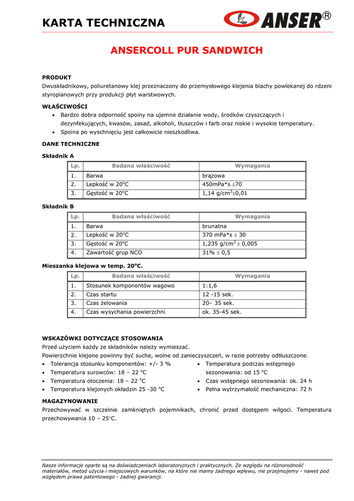 KARTA TECHNICZNA ANSERCOLL PUR SANDWICH PRODUKT Dwuskładnikowy, poliuretanowy klej przeznaczony do przemysłowego klejenia blachy powlekanej do rdzeni styropianowych przy produkcji płyt warstwowych. WŁAŚCIWOŚCI • Bardzo dobra odporność spoiny na ujemne działanie wody, środków czyszczących i dezynfekujących, kwasów, zasad, alkoholi, tłuszczów i farb oraz niskie i wysokie temperatury. • Spoina po wyschnięciu jest całkowicie nieszkodliwa. DANE TECHNICZNE Składnik A Lp. 1. 2. 3. Badana właściwość Wymagania Barwa brązowa o 450mPa*s ±70 o 1,14 g/cm3±0,01 Lepkość w 20 C Gęstość w 20 C Składnik B Lp. 1. 2. Badana właściwość Wymagania Barwa brunatna o 370 mPa*s ± 30 o Lepkość w 20 C 3. Gęstość w 20 C 1,235 g/cm3 ± 0,005 4. Zawartość grup NCO 31% ± 0,5 Mieszanka klejowa w temp. 20oC. Lp. Badana właściwość Wymagania 1. Stosunek komponentów wagowo 1:1,6 2. Czas startu 12 -15 sek. 3. Czas żelowania 20– 35 sek. 4. Czas wysychania powierzchni ok. 35-45 sek. WSKAZÓWKI DOTYCZĄCE STOSOWANIA Przed użyciem każdy ze składników należy wymieszać. Powierzchnie klejone powinny być suche, wolne od zanieczyszczeń, w razie potrzeby odtłuszczone. • • • • Tolerancja stosunku komponentów: +/- 3 % • o Temperatura podczas wstępnego sezonowania: od 15 oC Temperatura surowców: 18 – 22 C o Temperatura otoczenia: 18 – 22 C o Temperatura klejonych okładzin 25 -30 C • Czas wstępnego sezonowania: ok. 24 h • Pełna wytrzymałość mechaniczna: 72 h MAGAZYNOWANIE Przechowywać w szczelnie zamkniętych pojemnikach, chronić przed dostępem wilgoci. Temperatura przechowywania 10 – 25°C. Nasze informacje oparte są na doświadczeniach laboratoryjnych i praktycznych. Ze względu na różnorodność materiałów, metod użycia i miejscowych warunków, na które nie mamy żadnego wpływu, nie przejmujemy - nawet pod względem prawa patentowego - żadnej gwarancji.