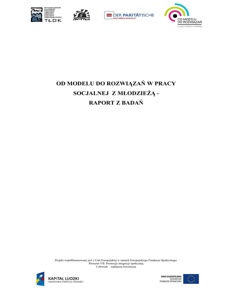 OD MODELU DO ROZWIĄZAŃ W PRACY SOCJALNEJ Z MŁODZIEŻĄ RAPORT Z BADAŃ Projekt współfinansowany jest z Unii Europejskiej w ramach Europejskiego Funduszu Społecznego. Priorytet VII. Promocja integracji społecznej Człowiek – najlepsza inwestycja SPIS TREŚCI ................................................................................................................ WPROWADZENIE ...................................................................................................... I. OPIS METODOLOGII BADAWCZEJ ................................................................... 1.1 Cel badania .................................................................................................................. 1.2 Narzędzia badawcze ……............................................................................................. 1.3 Kryteria doboru uczestników badań i ich charakterystyka .......................................... II. Diagnoza środowiska młodzieży usamodzielniającej się w wieku 16-25 lat z województwa kujawsko-pomorskiego .……………………………………………........ 2.1. Sytuacja społeczna młodzieży usamodzielniającej się .................................................. 2.2. Aktywność społeczna i edukacyjna młodzieży usamodzielniającej się ……………… 2.3. Priorytety życiowe usamodzielniającej się młodzieży w bliższej perspektywie czasowej……………………………………………………………………………………. 2.4. Aktywność zawodowa młodzieży usamodzielniającej się……………………………. 2.5. Bariery utrudniające proces usamodzielniania młodzieży w wieku 16-25 lat ………... 2.6. Zakres działalności placówek opiekuńczo-wychowawczych, instytucji publicznych, organizacji pozarządowych na rzecz procesu usamodzielniania młodzieży wykluczonej społecznie ………………………………………………………………………………….. 2.7. Możliwości i perspektywy rozwoju zawodowego młodzieży usamodzielniającej się… PODSUMOWANIE ............................................................................................................ WNIOSKI……………………………………………......................................................... ANEKSY .............................................................................................................................. Projekt współfinansowany jest z Unii Europejskiej w ramach Europejskiego Funduszu Społecznego. Priorytet VII. Promocja integracji społecznej Człowiek – najlepsza inwestycja WPROWADZENIE Niniejszy raport przedstawia wyniki badań przeprowadzonych w pierwszym etapie projektu „Od modelu do rozwiązań w pracy socjalnej z młodzieżą” realizowanego w ramach Programu Operacyjnego Kapitał Ludzki, Priorytet VII Promocja integracji społecznej. Projekt współfinansowany jest ze środków Unii Europejskiej w ramach Europejskiego Funduszu Społecznego. Głównym zadaniem projektu jest opracowanie, wdrożenie i upowszechnienie modelu wczesnej interwencji socjalnej, w celu przeciwdziałania wykluczeniu społecznemu młodzieży w wieku 16-25 lat z terenu województwa kujawskopomorskiego. Wypracowana koncepcja ma przyczynić się do wzrostu aktywności społeczno-zawodowej młodzieży zagrożonej wykluczeniem społecznym oraz popularyzować jej zatrudnienie w oparciu o wypracowany model. Praca nad Modelem Wczesnej Interwencji Socjalnej obejmuje dwa etapy. Pierwszy z nich - przedmiot niniejszego raportu - służy rozpoznaniu problemów i określeniu potrzeb Odbiorców i Użytkowników. Drugi etap służy wypracowaniu narzędzia i instrumentów niezbędnych w pracy z młodzieżą zagrożoną wykluczeniem społecznym w oparciu o wyniki badań jakościowych. Produkt finalny - metoda pracy z młodzieżą zagrożoną wykluczeniem społecznym wraz ze wsparciem finansowym dla 10 osób - rozpowszechniona zostanie w formie warsztatów, seminariów, doradztwa wśród Użytkowników i Odbiorców Modelu Wczesnej Interwencji Socjalnej. 1. Opis metodologii badawczej Metodologia badań została opracowana w oparciu o główne założenia projektu „Od modelu do rozwiązań w pracy socjalnej z młodzieżą”, czyli opracowanie, wdrożenie i upowszechnienie modelu wczesnej interwencji socjalnej, w celu przeciwdziałania wykluczeniu społecznemu młodzieży w wieku 16-25 lat z terenu województwa kujawskopomorskiego. Badanie zaprojektowane zostało zgodnie z wyznaczonym celem, który stanowi zdiagnozowanie środowiska poprzez rozpoznanie problematyki i określenie Projekt współfinansowany jest z Unii Europejskiej w ramach Europejskiego Funduszu Społecznego. Priorytet VII. Promocja integracji społecznej Człowiek – najlepsza inwestycja potrzeb odbiorców i użytkowników projektu. Celowi przyporządkowano główne obszary badawcze i odpowiadające im szczegółowe pytania badawcze. Projekt badania zakładał badanie pilotażowe oraz badanie właściwe. Na potrzeby badań wykorzystano metody ilościowe i jakościowe. Wybór metod i technik badawczych dokonany został w oparciu o założenia projektu i specyfikę problemów badanej grupy zdiagnozowane we wstępnej fazie projektu. 1.1. Cel badania Celem badania jest rozpoznanie problemów i określenie potrzeb odbiorców (młodzieży zagrożonej wykluczeniem społecznym, w tym: osób niepełnosprawnych, bezrobotnych, objętych opieką zastępczą, z zaniedbanych środowisk czy placówek opiekuńczo-wychowawczych, a także z problemami edukacyjnymi, społecznymi, wychowawczymi) i użytkowników projektu (przedstawicieli sektora integracji społecznej, organizacji pozarządowych, urzędów pracy, instytucji szkolących, nauczycieli szkół i placówek pracujących i przygotowujących się do pracy z młodzieżą zagrożoną wykluczeniem społecznym). Pogłębioną analizę problemu przeprowadzono przede wszystkim z uwagi na: ogranicz