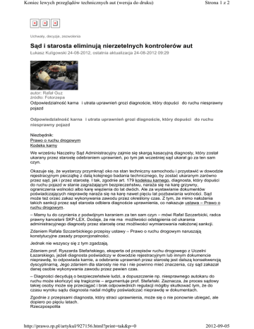 Koniec lewych przeglądów technicznych aut (wersja do druku) Strona 1 z 2 Uchwały, decyzje, zezwolenia Sąd i starosta eliminują nierzetelnych kontrolerów aut Łukasz Kuligowski 24-08-2012, ostatnia aktualizacja 24-08-2012 09:29 autor: Rafał Guz źródło: Fotorzepa Odpowiedzialność karna i utrata uprawnień grozi diagnoście, który dopuści do ruchu niesprawny pojazd Odpowiedzialność karna i utrata uprawnień grozi diagnoście, który dopuści do ruchu niesprawny pojazd Niezbędnik: Prawo o ruchu drogowym Kodeks karny We wrześniu Naczelny Sąd Administracyjny zajmie się skargą kasacyjną diagnosty, który został ukarany przez starostę odebraniem uprawnień, po tym jak wcześniej sąd ukarał go za ten sam czyn. Okazuje się, że wystarczy przymknąć oko na stan techniczny samochodu i przystawić w dowodzie rejestracyjnym pieczątkę z datą kolejnego badania technicznego, by zostać ukaranym zarówno przez sąd, jak i przez starostę. I tak, zgodnie art. 179 kodeksu karnego, diagnosta, który dopuści do ruchu pojazd w stanie zagrażającym bezpieczeństwu, naraża się na karę grzywny, ograniczenia wolności albo karę więzienia do lat dwóch. Ale za wystawianie dokumentów poświadczających nieprawdę naraża się na karę nawet pięciu lat pozbawiania wolności. Sąd może też orzec zakaz wykonywania zawodu przez określony czas. Z tym, że mimo nałożenia takich sankcji przez sąd starosta odbiera diagnoście uprawnienia, co nakazuje ustawa – Prawo o ruchu drogowym. – Mamy tu do czynienia z podwójnym karaniem za ten sam czyn – mówi Rafał Szczerbicki, radca prawny kancelarii SKP-LEX. Dodaje, że nie ma możliwości odstąpienia od ukarania administracyjnego diagnosty przez starostę oraz możliwości wymiarowania nałożonej sankcji. Zdaniem Rafała Szczerbickiego przepisy ustawy – Prawo o ruchu drogowym naruszają konstytucyjne zasady proporcjonalności. Jednak nie wszyscy się z tym zgadzają. Zdaniem prof. Ryszarda Stefańskiego, eksperta od przepisów ruchu drogowego z Uczelni Łazarskiego, jeżeli diagnosta poświadczy w dowodzie rejestracyjnym lub innym dokumencie nieprawdę, to odpowiada karnie, a odebranie uprawnień przez starostę jest dalszą konsekwencją dyscyplinarną. Jego zdaniem dla starosty nie ma i nie powinno mieć znaczenia, czy sąd zakazał danej osobie wykonywania zawodu przez pewien czas. – Diagności decydują o bezpieczeństwie ludzi, a dopuszczenie np. niesprawnego autokaru do ruchu może skończyć się tragicznie – argumentuje prof. Stefański. Zaznacza, że proces sądowy takiej osoby może się przeciągać i brak odpowiednich regulacji mógłby skutkować tym, że do czasu wyroku sądu diagnosta nadal mógłby poświadczać nieprawdę w dokumentach. Zgodnie z przepisami diagnosta, który straci uprawnienia, może się o nie ponownie ubiegać, ale dopiero po pięciu latach. Rzeczpospolita http://prawo.rp.pl/artykul/927156.html?print=tak&p=0 2012-09-05 Koniec lewych przeglądów technicznych aut (wersja do druku) Strona 2 z 2 © Wszystkie prawa zastrzeżone Żadna część jak i całość utworów zawartych w dzienniku nie może być powielana i rozpowszechniania lub dalej rozpowszechniana w jakiejkolwiek formie i w jakikolwiek sposób (w tym także elektroniczny lub mechaniczny lub inny albo na wszelkich polach eksploatacji) włącznie z kopiowaniem, szeroko pojętą digitalizacją, fotokopiowaniem lub kopiowaniem, w tym także zamieszczaniem w Internecie - bez pisemnej zgody PRESSPUBLICA Sp. z o.o. Jakiekolwiek użycie lub wykorzystanie utworów w całości lub w części bez zgody PRESSPUBLICA Sp. z o.o. lub autorów z naruszeniem prawa jest zabronione pod groźbą kary i może być ścigane prawnie. http://prawo.rp.pl/artykul/927156.html?print=tak&p=0 2012-09-05
