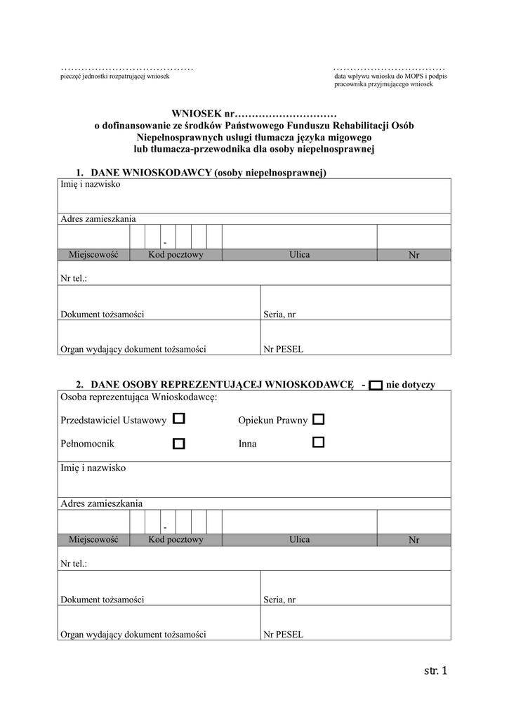 ………………………………… …………………………… pieczęć jednostki rozpatrującej wniosek data wpływu wniosku do MOPS i podpis pracownika przyjmującego wniosek WNIOSEK nr………………………… o dofinansowanie ze środków Państwowego Funduszu Rehabilitacji Osób Niepełnosprawnych usługi tłumacza języka migowego lub tłumacza-przewodnika dla osoby niepełnosprawnej 1. DANE WNIOSKODAWCY (osoby niepełnosprawnej) Imię i nazwisko Adres zamieszkania Miejscowość Kod pocztowy Ulica Nr Nr tel.: Dokument tożsamości Seria, nr Organ wydający dokument tożsamości Nr PESEL 2. DANE OSOBY REPREZENTUJĄCEJ WNIOSKODAWCĘ - nie nie dotyczy Osoba reprezentująca Wnioskodawcę: Przedstawiciel Ustawowy Opiekun Prawny Pełnomocnik Inna Imię i nazwisko Adres zamieszkania Miejscowość Kod pocztowy Ulica Nr Nr tel.: Dokument tożsamości Seria, nr Organ wydający dokument tożsamości Nr PESEL str. 1 3. INFORMACJE O WNIOSKODAWCY Stopień niepełnosprawności potwierdzony orzeczeniem (wpisać): 1. Niepełnosprawność/stopień lub grupa inwalidzka Rodzaj niepełnosprawności (proszę we właściwej rubryce wpisać „tak”) 1. dysfunkcja narządu słuchu 2. dysfunkcja narządu mowy 3. dysfunkcja narządu wzroku 3. inny (jaki?) Oświadczenie Wnioskodawcy o wysokości dochodów i liczbie osób pozostających we wspólnym gospodarstwie domowym Ja niżej podpisana(y) oświadczam, że razem ze mną we wspólnym gospodarstwie domowym pozostają następujące osoby: Imię Nazwisko Stopień Dochód pokrewieństwa z miesięczny1 Wnioskodawcą Dane dotyczące Wnioskodawcy: 1. --------------------- Pozostali członkowie wspólnego gospodarstwa: 2. 3. 4. 5. RAZEM W przypadku osób samotnych do oświadczenia należy wpisać tylko Wnioskodawcę i jego dochód. Oświadczam, że w kwartale poprzedzającym miesiąc złożenia wniosku przeciętny dochód2 przypadający na jedną osobę w moim gospodarstwie domowym wyniósł .................................. POUCZENIE 1 Jest to średni miesięczny dochód z kwartału poprzedzającego miesiąc złożenia wniosku w rozumieniu przepisów o świadczeniach rodzinnych pomniejszony o obciążenie zaliczką na podatek dochodowy od osób fizycznych, składką z tytułu ubezpieczenia emerytalnego, rentowego i chorobowego, określoną w przepisach o systemie ubezpieczeń społecznych oraz o kwotę alimentów świadczonych przez osoby pozostające we wspólnym gospodarstwie domowym na rzecz innych osób. 2 Dochód ustalony w pkt. 1 należy podzielić przez liczbę osób pozostających we wspólnym gospodarstwie domowym. str. 2 Informacja o korzystaniu ze środków PFRON w okresie 3 lat poprzedzających dzień złożenia wniosku: Czy wnioskodawca korzystał ze środków PFRON Nr i data zawarcia Kwota umowy Cel dofinansowania Termin rozliczenia Tak: Nie: Stan rozliczenia Źródło (PFRON) 4. PRZEDMIOT DOFINANSOWANIA - WNIOSKUJĘ O DOFINANSOWANIE DO*: a) Tłumacza języka migowego b) Tłumacza – przewodnika *właściwe zaznaczyć Miejsce realizacji zadania: ………………………………………………………………………………………………… ………………………………………………………………………………………………… Cel dofinansowania: ………………………………………………………………………………………………… ………………………………………………………………………………………………… Uzasadnienie wniosku (jakie sprawy, miejsce, adres): ………………………………………………………………………………………………… ………………………………………………………………………………………………… ………………………………………………………………………………………………… ………………………………………………………………………………………………… ………………………………………………………………………………………………… ………………………………………………………………………………………………… ………………………………………………………………………….................................... Przewidywany koszt realizacji zadania: 1) przewidywany koszt usługi jednej godziny tłumacza języka migowego lub tłumacza przewodnika ……………………. zł (słownie: ……………….……………….......................... …………………………………………………………………..…………………….. ……...), 2) przewidywana łączna liczba godzin usług tłumacza języka migowego lub tłumacza przewodnika ……………………………………………………………………………………. str. 3 Informujemy, że zgodnie z § 13 ust. 6 Rozporządzenia Ministra Pracy i Polityki Społecznej z dnia 25 czerwca 2002 r. z późniejszymi zmianami w sprawie określenia rodzajów zadań powiatu, które mogą być finansowane ze środków Państwowego Funduszu Rehabilitacji Osób Niepełnosprawnych wysokość dofinansowania usługi tłumacza języka migowego lub tłumacza – przewodnika nie może być wyższa niż 2% przeciętnego wynagrodzenia za godzinę jej świadczenia. Wysokość kwoty wnioskowanego dofinansowania ze środków PFRON, tj.: kwota usługi z pkt 4 ust. 1 x liczba godzin z pkt 4 ust. 2: ……..……………………………………...………. zł (słownie: ………………………………………………………………………………………....) Informujemy, że zgodnie z § 9 ust. 4 Rozporządzenia Ministra Pracy i Polityki Społecznej z dnia 25 czerwca 2002 r. z późniejszymi zmianami w sprawie określenia rodzajów zadań powiatu, które mogą być finansowane ze środków Państwowego Funduszu Rehabilitacji
