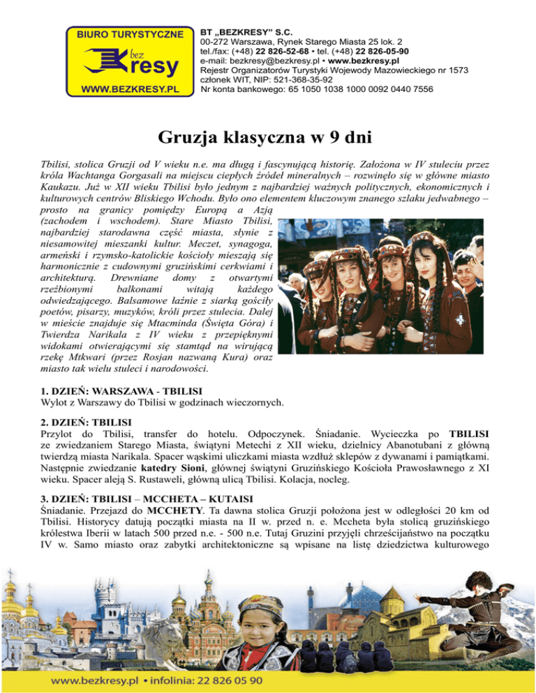 BT „BEZKRESY” S.C. 00-272 Warszawa, Rynek Starego Miasta 25 lok. 2 tel./fax: (+48) 22 826-52-68 • tel. (+48) 22 826-05-90 e-mail: [email protected] • www.bezkresy.pl Rejestr Organizatorów Turystyki Wojewody Mazowieckiego nr 1573 członek WIT, NIP: 521-368-35-92 Nr konta bankowego: 65 1050 1038 1000 0092 0440 7556 Gruzja klasyczna w 9 dni Tbilisi, stolica Gruzji od V wieku n.e. ma długą i fascynującą historię. Założona w IV stuleciu przez króla Wachtanga Gorgasali na miejscu ciepłych źródeł mineralnych – rozwinęło się w główne miasto Kaukazu. Już w XII wieku Tbilisi było jednym z najbardziej ważnych politycznych, ekonomicznych i kulturowych centrów Bliskiego Wchodu. Było ono elementem kluczowym znanego szlaku jedwabnego – prosto na granicy pomiędzy Europą a Azją (zachodem i wschodem). Stare Miasto Tbilisi, najbardziej starodawna część miasta, słynie z niesamowitej mieszanki kultur. Meczet, synagoga, armeński i rzymsko-katolickie kościoły mieszają się harmonicznie z cudownymi gruzińskimi cerkwiami i architekturą. Drewniane domy z otwartymi rzeźbionymi balkonami witają każdego odwiedzającego. Balsamowe łaźnie z siarką gościły poetów, pisarzy, muzyków, króli przez stulecia. Dalej w mieście znajduje się Mtacminda (Święta Góra) i Twierdza Narikala z IV wieku z przepięknymi widokami otwierającymi się stamtąd na wirującą rzekę Mtkwari (przez Rosjan nazwaną Kura) oraz miasto tak wielu stuleci i narodowości. 1. DZIEŃ: WARSZAWA - TBILISI Wylot z Warszawy do Tbilisi w godzinach wieczornych. 2. DZIEŃ: TBILISI Przylot do Tbilisi, transfer do hotelu. Odpoczynek. Śniadanie. Wycieczka po TBILISI ze zwiedzaniem Starego Miasta, świątyni Metechi z XII wieku, dzielnicy Abanotubani z główną twierdzą miasta Narikala. Spacer wąskimi uliczkami miasta wzdłuż sklepów z dywanami i pamiątkami. Następnie zwiedzanie katedry Sioni, głównej świątyni Gruzińskiego Kościoła Prawosławnego z XI wieku. Spacer aleją S. Rustaweli, główną ulicą Tbilisi. Kolacja, nocleg. 3. DZIEŃ: TBILISI – MCCHETA – KUTAISI Śniadanie. Przejazd do MCCHETY. Ta dawna stolica Gruzji położona jest w odległości 20 km od Tbilisi. Historycy datują początki miasta na II w. przed n. e. Mccheta była stolicą gruzińskiego królestwa Iberii w latach 500 przed n.e. - 500 n.e. Tutaj Gruzini przyjęli chrześcijaństwo na początku IV w. Samo miasto oraz zabytki architektoniczne są wpisane na listę dziedzictwa kulturowego BT „BEZKRESY” S.C. 00-272 Warszawa, Rynek Starego Miasta 25 lok. 2 tel./fax: (+48) 22 826-52-68 • tel. (+48) 22 826-05-90 e-mail: [email protected] • www.bezkresy.pl Rejestr Organizatorów Turystyki Wojewody Mazowieckiego nr 1573 członek WIT, NIP: 521-368-35-92 Nr konta bankowego: 65 1050 1038 1000 0092 0440 7556 UNESCO. Zwiedzanie klasztoru Dżwari z VI w. i katedry Sweticchoweli z XI w. Przejazd do KUTAISI. Kolacja, nocleg. Przejazd ok. 290 km 4. DZIEŃ: KUTAISI - BORŻOMI - BAKURIANI Śniadanie. Zwiedzanie miasta KUTAISI, historia którego jest związana z argonautami (XIII -XII w. przed n.e.) było stolicą starodawnej Kolchidy, a późnej Gruzji Wschodniej. Zwiedzanie katedry BAGRATI z XI w., klasztoru GELATI założonego w XII w. przez najsławniejszego gruzińskiego króla Dawida IV Budowniczego (1073-1125). Tu zbudował akademię i klasztor, które stały się centrum edukacyjnym Gruzji. Unikatowe malowidła ścienne świętych oraz monarchów gruzińskich są w środku głównej katedry Marii Dziewicy. Powyższe zabytki znajdują się na liście UNESCO. Przejazd do uzdrowiska BORŻOMI spacer po parku zdrojowym w pobliżu domu Romanowych (wejście jest niemożliwe), degustacja mineralnej wody Borżomi prosto ze źródła – BAKURIANI, narciarska miejscowość wypoczynkowa otoczona górami Małego Kaukazu, kolacja, nocleg. Przejazd ok. 170 km 5. DZIEŃ: BAKURIANI – GORI - UPLISCICHE - ANANURI - GUDAURI Śniadanie. Wyjazd do rodzinnego miasta Stalina GORI, miejscowości o wielkim znaczeniu historycznym (fakultatywnie Muzeum Stalina). Przejazd do skalnego miasta UPLISCICHE, założonego w VII w. przed n.e. Znajdują się tam ogromna centralna sala, pokoje dzienne, a także cerkiew z IX w. Po Uplisciche jazda Gruzińską Wojenną Drogą, historyczną drogą wiodącą w góry Kaukazu. Droga ta mija imponującą twierdzę ANANURI, XVI -XVII w której zwiedzamy dwie cerkwie i mury obronne. Potem jazda wzdłuż rzeki Aragavi do miejscowości wypoczynkowej GUDAURI. Kolacja, nocleg. Przejazd ok. 260 km 6. DZIEŃ: GUDAURI – KAZBEGI - GUDAURI Śniadanie. Wyjazd do Kazbegi. Po drodze przełęcz Dżwari, przejazd w stronę Kaukazu Środkowego i dojazd do KAZBEGI. Miasto otoczone jest gigantycznymi górami z malowniczym widokiem na jedną z najwyższych gór - Kazbek (5047 m), jedną z sześciu 5000-metrowych szczytów Kaukazu. Zgodnie z legendą Prometeusz był przykuty do góry Kazbek. Spacer do cerkwi Cminda Sameba pięknie położonej na wzgórzu, z której otwiera się cudowny widok na górę Kazbek (ewentualnie wjazd BT „BEZKRESY” S.C. 00-272 Warszawa, Rynek Starego Miasta 25 lok. 2 tel./fax: (+48) 22 826-52-68 • tel. (+48) 22 826-05-90 e-mail: [email protected] • www.bezkresy.pl Rejestr Organizatorów Turystyki Wojewody Mazowieckiego nr 1573 członek WIT, NIP: 521-368-35-92 Nr konta bankowego: 65 1050 1038 1000 0092 0440 7556 dżipami za dodatkową opłatą). Obiad w formie pikniku z ogniskiem wraz z degustacją „czaczy”. Powrót na nizinę i objazd kanionem rzeki Dariali. Przyjazd do GUDAURI. Kolacja, nocleg. Przejazd ok. 90 km 7. DZIEŃ: GUDAURI – SIGHNAGHI – CINANDALI - TELAWI Śniadanie. Podróż do prowincji Kachetia. Zwiedzanie SIGHNAGHI - przepiękne miasteczko górskie, z którego otwiera się panorama na dolinę Alazani oraz Kaukaz Wschodni. Zwiedzanie kościoła Bodbe, - miejsca pochówku św. Nino (patronki Gruzji). Wyjazd do GURDŻAANI, zwiedzanie 300-letniej piwnicy z winami, degustac