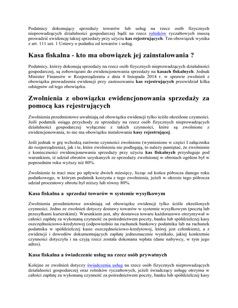 Podatnicy dokonujący sprzedaży towarów lub usług na rzecz osób fizycznych nieprowadzących działalności gospodarczej bądź na rzecz rolników ryczałtowych muszą prowadzić ewidencję takiej sprzedaży przy użyciu kas rejestrujących. Ten obowiązek wynika z art. 111 ust. 1 Ustawy o podatku od towarów i usług. Kasa fiskalna - kto ma obowiązek jej zainstalowania ? Podatnicy, którzy dokonują sprzedaży na rzecz osób fizycznych nieprowadzących działalności gospodarczej, są zobowiązani do ewidencjonowania sprzedaży na kasach fiskalnych. Jednak Minister Finansów w Rozporządzeniu z dnia 4 listopada 2014 r. w sprawie zwolnień z obowiązku prowadzenia ewidencji przy zastosowaniu kas rejestrujących przewidział kilka odstępstw od tego obowiązku. Zwolnienia z obowiązku ewidencjonowania sprzedaży za pomocą kas rejestrujących Zwolnienia przedmiotowe uwalniają od obowiązku ewidencji tylko ściśle określone czynności. Jeśli podatnik osiąga przychody ze sprzedaży na rzecz osób fizycznych nieprowadzących działalności gospodarczej wyłącznie z takich czynności, które są zwolnione z ewidencjonowania, to nie ma obowiązku instalowania kasy rejestrującej. Jeśli jednak w grę wchodzą zarówno czynności zwolnione (wymienione w części I załącznika do rozporządzenia), jak i te, które zwolnieniu nie podlegają, to należy pamiętać, że zwolnienie z konieczności ewidencjonowania sprzedaży przy użyciu kas fiskalnych przysługuje pod warunkiem, iż udział obrotów uzyskanych ze sprzedaży zwolnionej w obrotach ogółem był w poprzednim roku wyższy niż 80%. Zwolnienie to traci moc po upływie dwóch miesięcy, licząc od końca półrocza danego roku podatkowego, w którym podatnik korzysta z tego zwolnienia, jeżeli w okresie tego półrocza udział procentowy obrotu był niższy lub równy 80%. Kasa fiskalna a sprzedaż towarów w systemie wysyłkowym Zwolnienia przedmiotowe uwalniają od obowiązku ewidencji tylko ściśle określonych czynności. Jedno ze zwolnień dotyczy dostawy towarów w systemie wysyłkowym (pocztą lub przesyłkami kurierskimi). Warunkiem jest, aby dostawca towaru każdorazowo otrzymywał w całości zapłatę za wykonaną czynność za pośrednictwem poczty, banku lub spółdzielczej kasy oszczędnościowo-kredytowej (odpowiednio na rachunek bankowy podatnika lub na rachunek podatnika w spółdzielczej kasie oszczędnościowo-kredytowej, której jest członkiem), a z ewidencji i dowodów dokumentujących zapłatę jednoznacznie wynikało, jakiej konkretnie czynności dotyczyła i na czyją rzecz została dokonana wpłata (dane nabywcy, w tym jego adres). Kasa fiskalna a świadczenie usług na rzecz osób prywatnych Kolejne ze zwolnień dotyczy świadczenia usług na rzecz osób fizycznych nieprowadzących działalności gospodarczej oraz rolników ryczałtowych, jeżeli świadczący usługę otrzyma w całości zapłatę za wykonaną czynność za pośrednictwem poczty, banku lub spółdzielczej kasy oszczędnościowo-kredytowej (odpowiednio na rachunek bankowy podatnika lub na rachunek podatnika w spółdzielczej kasie oszczędnościowo-kredytowej, której jest członkiem), a z ewidencji i dowodów dokumentujących zapłatę jednoznacznie wynika, jakiej konkretnie czynności dotyczyła ta wpłata. Zwolnienie ze względu na nieprzekroczenie 20 tys. obrotu Rozporządzenie Ministra Finansów przewiduje również zwolnienie ze względu na wysokość obrotów. Jeśli w danym roku podatkowym obroty ze sprzedaży na rzecz osób fizycznych nieprowadzących działalności gospodarczej oraz rolników ryczałtowych nie przekroczą kwoty 20 000 zł, wówczas podatnik nie ma obowiązku instalowania kasy fiskalnej. Obowiązek taki powstaje po upływie dwóch miesięcy, licząc od pierwszego dnia miesiąca, następującym po miesiącu, w którym podatnik przekroczył limit 20 tys. zł. Podatnicy, którzy korzystają ze zwolnienia z podatku VAT, ponieważ są drobnymi przedsiębiorcami (o których mowa w art. 113 ustawy o VAT) muszą pamiętać, że zwolnienie z VAT nie oznacza, że są również zwolnieni z ewidencjonowania sprzedaży przy użyciu kas rejestrujących! Może się zdarzyć, że przekroczą dopuszczalny limit obrotu 20 tys. zł i będą zobowiązani do stosowania kas fiskalnych. Jakie czynności muszą być bezwzględnie ewidencjonowane na kasie? W § 4 przytoczonego rozporządzenia w sprawie zwolnień z obowiązku ewidencjonowania z zastosowaniem kas rejestrujących zostały określone czynności, przy wykonywaniu których bezwzględnie należy posiadać kasę fiskalną. Wśród nich można wymienić: dostawy: o gazu płynnego, o części do silników (PKWiU 28.11.4), o silników spalinowych wewnętrznego spalania w rodzaju stosowanych do napędu pojazdów (PKWiU 29.10.1), o nadwozi do pojazdów silnikowych (PKWiU 29.20.1), o przyczep i naczep; kontenerów (PKWiU 29.20.2), o części przyczep, naczep i pozostałych pojazdów bez napędu mechanicznego (PKWiU 29.20.30.0), o części i akcesoriów do pojazdów silnikowych (z wyłączeniem motocykli), gdzie indziej niesklasyfikowanych (PKWiU 29.32.30.0), o silników spalinowych tłokowych wewnętrznego spalania w rodzaju stosowanych w motocyklach (PKWiU 30.91.3), o sprzętu radiowego, telewizyjnego i telekomunikacyjnego, z wyłączeniem lamp elektronowych i innych elementów elektronicznych oraz części do aparatów i urządzeń do operowania dźwiękiem i obrazem, anten (PKWiU ex 26 i ex 27.90), o sprzętu fotograficznego, z wyłączeniem części i akcesoriów do sprzętu i wyposażenia fotograficznego (PKWiU ex 26.70.1), o wyrobów z metali szlachetnych lub z udziałem tych metali, których dostawa nie może korzystać ze zwolnienia od podatku, o którym mowa w art. 113 ust. 1 i 9 ustawy z dnia 11 marca 2004 r. o podatku od towarów i usług, o zapisanych i niezapisanych nośników danych cyfrowych i analogowych, wyrobów przeznaczonych do użycia, oferowanych na sprzeda