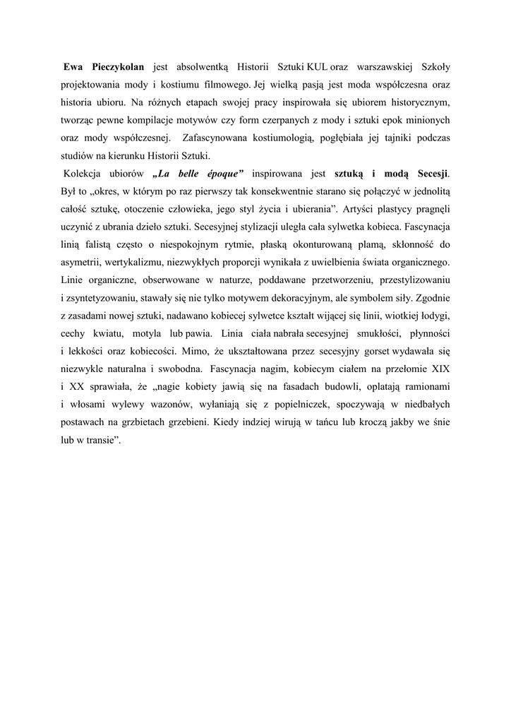 Ewa Pieczykolan jest absolwentką Historii Sztuki KUL oraz warszawskiej Szkoły projektowania mody i kostiumu filmowego. Jej wielką pasją jest moda współczesna oraz historia ubioru. Na róŜnych etapach swojej pracy inspirowała się ubiorem historycznym, tworząc pewne kompilacje motywów czy form czerpanych z mody i sztuki epok minionych oraz mody współczesnej. Zafascynowana kostiumologią, pogłębiała jej tajniki podczas studiów na kierunku Historii Sztuki. Kolekcja ubiorów „La belle époque” inspirowana jest sztuką i modą Secesji. Był to „okres, w którym po raz pierwszy tak konsekwentnie starano się połączyć w jednolitą całość sztukę, otoczenie człowieka, jego styl Ŝycia i ubierania”. Artyści plastycy pragnęli uczynić z ubrania dzieło sztuki. Secesyjnej stylizacji uległa cała sylwetka kobieca. Fascynacja linią falistą często o niespokojnym rytmie, płaską okonturowaną plamą, skłonność do asymetrii, wertykalizmu, niezwykłych proporcji wynikała z uwielbienia świata organicznego. Linie organiczne, obserwowane w naturze, poddawane przetworzeniu, przestylizowaniu i zsyntetyzowaniu, stawały się nie tylko motywem dekoracyjnym, ale symbolem siły. Zgodnie z zasadami nowej sztuki, nadawano kobiecej sylwetce kształt wijącej się linii, wiotkiej łodygi, cechy kwiatu, motyla lub pawia. Linia ciała nabrała secesyjnej smukłości, płynności i lekkości oraz kobiecości. Mimo, Ŝe ukształtowana przez secesyjny gorset wydawała się niezwykle naturalna i swobodna. Fascynacja nagim, kobiecym ciałem na przełomie XIX i XX sprawiała, Ŝe „nagie kobiety jawią się na fasadach budowli, oplatają ramionami i włosami wylewy wazonów, wyłaniają się z popielniczek, spoczywają w niedbałych postawach na grzbietach grzebieni. Kiedy indziej wirują w tańcu lub kroczą jakby we śnie lub w transie”.