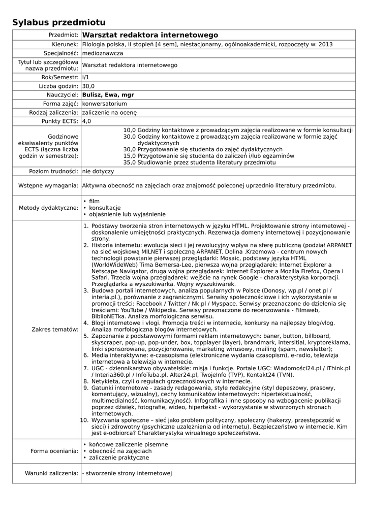 Sylabus przedmiotu Przedmiot: Warsztat redaktora internetowego Kierunek: Filologia polska, II stopień [4 sem], niestacjonarny, ogólnoakademicki, rozpoczęty w: 2013 Specjalność: medioznawcza Tytuł lub szczegółowa Warsztat redaktora internetowego nazwa przedmiotu: Rok/Semestr: I/1 Liczba godzin: 30,0 Nauczyciel: Bulisz, Ewa, mgr Forma zajęć: konwersatorium Rodzaj zaliczenia: zaliczenie na ocenę Punkty ECTS: 4,0 Godzinowe ekwiwalenty punktów ECTS (łączna liczba godzin w semestrze): 10,0 Godziny kontaktowe z prowadzącym zajęcia realizowane w formie konsultacji 30,0 Godziny kontaktowe z prowadzącym zajęcia realizowane w formie zajęć dydaktycznych 30,0 Przygotowanie się studenta do zajęć dydaktycznych 15,0 Przygotowanie się studenta do zaliczeń i/lub egzaminów 35,0 Studiowanie przez studenta literatury przedmiotu Poziom trudności: nie dotyczy Wstępne wymagania: Aktywna obecność na zajęciach oraz znajomość poleconej uprzednio literatury przedmiotu. • film Metody dydaktyczne: • konsultacje • objaśnienie lub wyjaśnienie 1. Podstawy tworzenia stron internetowych w języku HTML. Projektowanie strony internetowej doskonalenie umiejętności praktycznych. Rezerwacja domeny internetowej i pozycjonowanie strony. 2. Historia internetu: ewolucja sieci i jej rewolucyjny wpływ na sferę publiczną (podział ARPANET na sieć wojskową MILNET i społeczną ARPANET. Dolina .Krzemowa - centrum nowych technologii powstanie pierwszej przeglądarki: Mosaic, podstawy języka HTML (WorldWideWeb) Tima Bemersa-Lee, pierwsza wojna przeglądarek: Internet Explorer a Netscape Navigator, druga wojna przeglądarek: Internet Explorer a Mozilla Firefox, Opera i Safari. Trzecia wojna przeglądarek: wejście na rynek Google - charakterystyka korporacji. Przeglądarka a wyszukiwarka. Wojny wyszukiwarek. 3. Budowa portali internetowych, analiza popularnych w Polsce (Donosy, wp.pl / onet.pl / interia.pl.), porównanie z zagranicznymi. Serwisy społecznościowe i ich wykorzystanie w promocji treści: Facebook / Twitter / Nk.pl / Myspace. Serwisy przeznaczone do dzielenia się treściami: YouTube / Wikipedia. Serwisy przeznaczone do recenzowania - Filmweb, BiblioNETka. Analiza morfologiczna serwisu. 4. Blogi internetowe i vlogi. Promocja treści w internecie, konkursy na najlepszy blog/vlog. Analiza morfologiczna blogów internetowych. Zakres tematów: 5. Zapoznanie z podstawowymi formami reklam internetowych: baner, button, billboard, skyscraper, pop-up, pop-under, box, topplayer (layer), brandmark, intersitial, kryptoreklama, linki sponsorowane, pozycjonowanie, marketing wirusowy, mailing (spam, newsletter); 6. Media interaktywne: e-czasopisma (elektroniczne wydania czasopism), e-radio, telewizja internetowa a telewizja w intemecie. 7. UGC - dziennikarstwo obywatelskie: misja i funkcje. Portale UGC: Wiadomości24.pl / iThink.pl / Interia360.pl / InfoTuba.pl, Alter24.pl, TwojeInfo (TVP), Kontakt24 (TVN). 8. Netykieta, czyli o regułach grzecznośiowych w internecie. 9. Gatunki internetowe - zasady redagowania, style redakcyjne (styl depeszowy, prasowy, komentujący, wizualny), cechy komunikatów internetowych: hipertekstualność, multimedialność, komunikacyjność). Infografika i inne sposoby na wzbogacenie publikacji poprzez dźwięk, fotografie, wideo, hipertekst - wykorzystanie w stworzonych stronach internetowych. 10. Wyzwania społeczne – sieć jako problem polityczny, społeczny (hakerzy, przestępczość w sieci) i zdrowotny (psychiczne uzależnienia od internetu). Bezpieczeństwo w internecie. Kim jest e-odbiorca? Charakterystyka wirualnego społeczeństwa. • końcowe zaliczenie pisemne Forma oceniania: • obecność na zajęciach • zaliczenie praktyczne Warunki zaliczenia: - stworzenie strony internetowej 1. L. Olszański, Dziennikarstwo internetowe, Warszawa 2006. 2. L. Olszański, Media i dziennikarstwo internetowe, Warszawa 2012. 3. Internetowe gatunki dziennikarskie, pod red. K. Wolny - Zmorzyński, W. Furman, Warszawa Literatura: 2010. 4. Dziennikarstwo i świat mediów, pod red. Z. Bauer, E. Chudziński, Kraków 2010. 5. Dziennikarstwo internetowe, pod red. G. Hebrajskiej i J. Mikosz, Łódź 2010. Dodatkowe informacje: [email protected]