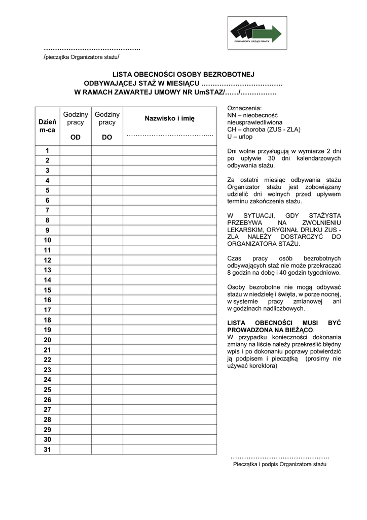 ……………………………………. /pieczątka Organizatora stażu/ LISTA OBECNOŚCI OSOBY BEZROBOTNEJ ODBYWAJĄCEJ STAŻ W MIESIĄCU ……………………………… W RAMACH ZAWARTEJ UMOWY NR UmSTAZ/……/……………. Godziny Godziny Nazwisko i imię Dzień pracy pracy m-ca ………………………………... OD DO 1 2 3 4 5 6 7 8 9 10 11 12 13 14 15 16 17 18 19 20 21 22 23 24 25 26 27 28 29 30 31 Oznaczenia: NN – nieobecność nieusprawiedliwiona CH – choroba (ZUS - ZLA) U – urlop Dni wolne przysługują w wymiarze 2 dni po upływie 30 dni kalendarzowych odbywania stażu. Za ostatni miesiąc odbywania stażu Organizator stażu jest zobowiązany udzielić dni wolnych przed upływem terminu zakończenia stażu. W SYTUACJI, GDY STAŻYSTA PRZEBYWA NA ZWOLNIENIU LEKARSKIM, ORYGINAŁ DRUKU ZUS ZLA NALEŻY DOSTARCZYĆ DO ORGANIZATORA STAŻU. Czas pracy osób bezrobotnych odbywających staż nie może przekraczać 8 godzin na dobę i 40 godzin tygodniowo. Osoby bezrobotne nie mogą odbywać stażu w niedzielę i święta, w porze nocnej, w systemie pracy zmianowej ani w godzinach nadliczbowych. LISTA OBECNOŚCI MUSI BYĆ PROWADZONA NA BIEŻĄCO. W przypadku konieczności dokonania zmiany na liście należy przekreślić błędny wpis i po dokonaniu poprawy potwierdzić ją podpisem i pieczątką (prosimy nie używać korektora) …………………………………….. Pieczątka i podpis Organizatora stażu