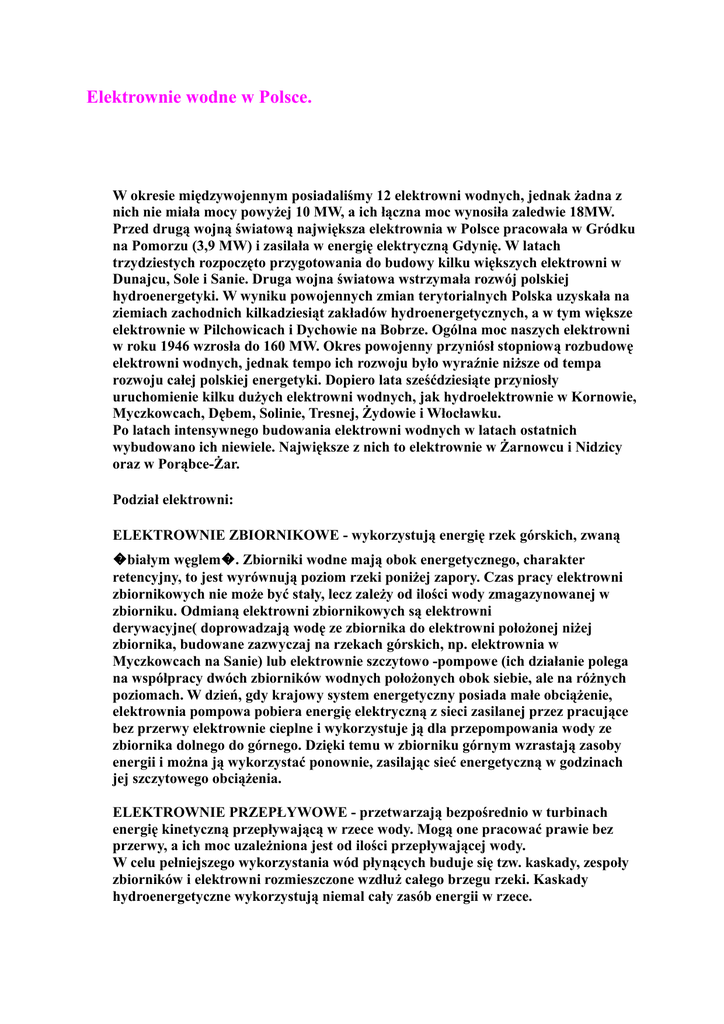 Elektrownie wodne w Polsce. W okresie międzywojennym posiadaliśmy 12 elektrowni wodnych, jednak żadna z nich nie miała mocy powyżej 10 MW, a ich łączna moc wynosiła zaledwie 18MW. Przed drugą wojną światową największa elektrownia w Polsce pracowała w Gródku na Pomorzu (3,9 MW) i zasilała w energię elektryczną Gdynię. W latach trzydziestych rozpoczęto przygotowania do budowy kilku większych elektrowni w Dunajcu, Sole i Sanie. Druga wojna światowa wstrzymała rozwój polskiej hydroenergetyki. W wyniku powojennych zmian terytorialnych Polska uzyskała na ziemiach zachodnich kilkadziesiąt zakładów hydroenergetycznych, a w tym większe elektrownie w Pilchowicach i Dychowie na Bobrze. Ogólna moc naszych elektrowni w roku 1946 wzrosła do 160 MW. Okres powojenny przyniósł stopniową rozbudowę elektrowni wodnych, jednak tempo ich rozwoju było wyraźnie niższe od tempa rozwoju całej polskiej energetyki. Dopiero lata sześćdziesiąte przyniosły uruchomienie kilku dużych elektrowni wodnych, jak hydroelektrownie w Kornowie, Myczkowcach, Dębem, Solinie, Tresnej, Żydowie i Włocławku. Po latach intensywnego budowania elektrowni wodnych w latach ostatnich wybudowano ich niewiele. Największe z nich to elektrownie w Żarnowcu i Nidzicy oraz w Porąbce-Żar. Podział elektrowni: ELEKTROWNIE ZBIORNIKOWE - wykorzystują energię rzek górskich, zwaną �białym węglem�. Zbiorniki wodne mają obok energetycznego, charakter retencyjny, to jest wyrównują poziom rzeki poniżej zapory. Czas pracy elektrowni zbiornikowych nie może być stały, lecz zależy od ilości wody zmagazynowanej w zbiorniku. Odmianą elektrowni zbiornikowych są elektrowni derywacyjne( doprowadzają wodę ze zbiornika do elektrowni położonej niżej zbiornika, budowane zazwyczaj na rzekach górskich, np. elektrownia w Myczkowcach na Sanie) lub elektrownie szczytowo -pompowe (ich działanie polega na współpracy dwóch zbiorników wodnych położonych obok siebie, ale na różnych poziomach. W dzień, gdy krajowy system energetyczny posiada małe obciążenie, elektrownia pompowa pobiera energię elektryczną z sieci zasilanej przez pracujące bez przerwy elektrownie cieplne i wykorzystuje ją dla przepompowania wody ze zbiornika dolnego do górnego. Dzięki temu w zbiorniku górnym wzrastają zasoby energii i można ją wykorzystać ponownie, zasilając sieć energetyczną w godzinach jej szczytowego obciążenia. ELEKTROWNIE PRZEPŁYWOWE - przetwarzają bezpośrednio w turbinach energię kinetyczną przepływającą w rzece wody. Mogą one pracować prawie bez przerwy, a ich moc uzależniona jest od ilości przepływającej wody. W celu pełniejszego wykorzystania wód płynących buduje się tzw. kaskady, zespoły zbiorników i elektrowni rozmieszczone wzdłuż całego brzegu rzeki. Kaskady hydroenergetyczne wykorzystują niemal cały zasób energii w rzece. Przykłady elektrowni: SOLINA Zaporę i elektrownię wodną w Solinie wzniesiono w latach 1961-1968. Zaporę początkowo budowano w bardzo trudnych warunkach, ponieważ tereny te były w tym czasie bardzo wyludniane, co było wynikiem przeprowadzonej w roku 1947 akcji WISŁA. Była to drastyczna decyzja wysiedlenia z tych terenów ludności pochodzenia ukraińskiego. Po trzech latach uporano się z tym problemem. Zapora jest betonowa typu ciężkiego. Koszt jej budowy wyniósł 1,5 miliarda złotych. Jej maksymalna wysokość to 82 metry, rozpiętość od brzegu do brzegu 622 metry, a szerokość w koronie 12 metrów. Zapora kryje w sobie 760 000 m sześciennych. W środku zapory kapie woda. Zapora bez przerwy pracuje mechanicznie. Część nadwodna podlega w ciągu roku wahaniom od minus 30 do plus 30 stopni. Beton kurczy się i rozszerza, a woda przeciska się przez drobne szczeliny. W podziemiach widać zawieszone na strunach wahadła zaczepione u szczytu zapory, których dolne końcówki umieszczone są w pojemnikach z olejem. Czujniki w różnych punktach sygnalizują ewentualne odchyłki od pionu. Gdyby doszło do katastrofy i przewrócenia się betonowej tamy, to ułożyła by się ona jak sześcienny klocek. Ponieważ zapora ma u podstawy 65 metrów, tyle samo ile wystaje ponad powierzchnię wody, dalej hamowałaby przepływ Sanu. Solina to elektrownia interwencyjno - regulacyjna. Gdy jest nagła zapaść w systemie elektrycznym kraju, to wówczas odpala się Solinę. Wystarczy 1 minuta od wciśnięcia guzika aby uruchomić urządzenia z pełnym obciążeniem. Jest to zaleta elektrowni wodnych. Solina pracuje jak pogotowie ratunkowe, uzupełnia nagłe niedobory w systemie elektrycznym, a potem wyłącza się, jej funkcję pełnią elektrownie cieplne. CZORSZTYN - NIEDZICA Historia budowy tej zapory sięga 1905 roku z którego pochodzą pierwsze materiały dotyczące utworzenia w rejonie Czorsztyna sztucznego zbiornika. Uściślenie tych zamysłów stanowiły plany budowy czterech zbiorników na najgroźniejszych dopływach karpackich górnej Wisły - w Rożnowie i Czorsztynie na Dunajcu, Porąbce na Sole i Mucharzu na Skawie. Jest mało znanym faktem, że plany przedstawione zostały do zaopiniowania w 1919 roku - wybitnemu specjaliście, twórcy szeregu podobnych obiektów w Szwajcarii, późniejszemu ministrowi robót publicznych, a następnie pierwszemu Prezydentowi Rzeczypospolitej - Gabrielowi Narutowiczowi. Katastrofalna powódź w 1934 roku doprowadziła do podjęcia natychmiastowej decyzji o budowie, jako pierwszego na Dunajcu zbiornika w Rożnowie. Następny miał być zbiornik z zaporą usytuowaną w Niedzicy, dla którego dokumentację przygotowano w latach 1938-1939.W powojennej historii miała miejsce ewolucja poglądów na kształt inwestycji związana z rosnącą wagą problemów gospodarki wodnej i wymogów ochrony środowiska, jakie musiały być zachowane przy realizacji tak dużej inwestycji w regionie o szczególnych walorach przyrodniczych i kulturowych. Ponadto budowie zapory przeciwstawiali się mieszkań