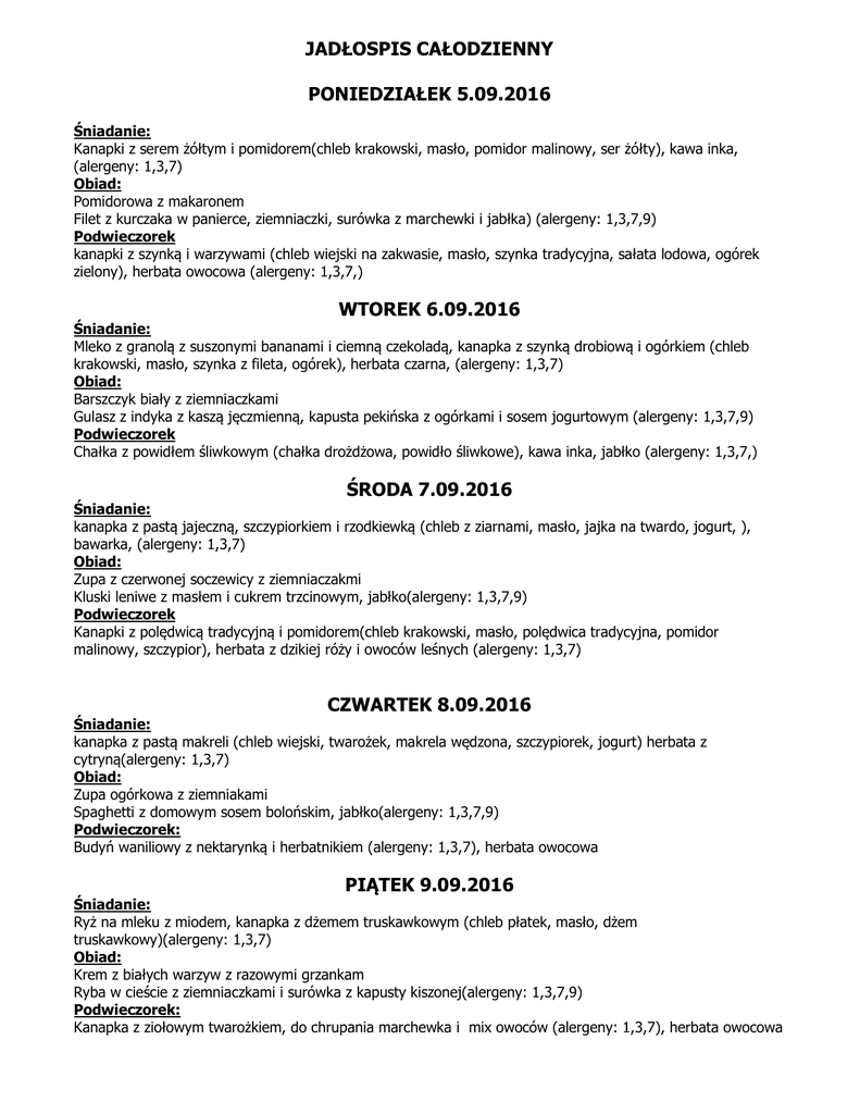JADŁOSPIS CAŁODZIENNY PONIEDZIAŁEK 5.09.2016 Śniadanie: Kanapki z serem żółtym i pomidorem(chleb krakowski, masło, pomidor malinowy, ser żółty), kawa inka, (alergeny: 1,3,7) Obiad: Pomidorowa z makaronem Filet z kurczaka w panierce, ziemniaczki, surówka z marchewki i jabłka) (alergeny: 1,3,7,9) Podwieczorek kanapki z szynką i warzywami (chleb wiejski na zakwasie, masło, szynka tradycyjna, sałata lodowa, ogórek zielony), herbata owocowa (alergeny: 1,3,7,) WTOREK 6.09.2016 Śniadanie: Mleko z granolą z suszonymi bananami i ciemną czekoladą, kanapka z szynką drobiową i ogórkiem (chleb krakowski, masło, szynka z fileta, ogórek), herbata czarna, (alergeny: 1,3,7) Obiad: Barszczyk biały z ziemniaczkami Gulasz z indyka z kaszą jęczmienną, kapusta pekińska z ogórkami i sosem jogurtowym (alergeny: 1,3,7,9) Podwieczorek Chałka z powidłem śliwkowym (chałka drożdżowa, powidło śliwkowe), kawa inka, jabłko (alergeny: 1,3,7,) ŚRODA 7.09.2016 Śniadanie: kanapka z pastą jajeczną, szczypiorkiem i rzodkiewką (chleb z ziarnami, masło, jajka na twardo, jogurt, ), bawarka, (alergeny: 1,3,7) Obiad: Zupa z czerwonej soczewicy z ziemniaczakmi Kluski leniwe z masłem i cukrem trzcinowym, jabłko(alergeny: 1,3,7,9) Podwieczorek Kanapki z polędwicą tradycyjną i pomidorem(chleb krakowski, masło, polędwica tradycyjna, pomidor malinowy, szczypior), herbata z dzikiej róży i owoców leśnych (alergeny: 1,3,7) CZWARTEK 8.09.2016 Śniadanie: kanapka z pastą makreli (chleb wiejski, twarożek, makrela wędzona, szczypiorek, jogurt) herbata z cytryną(alergeny: 1,3,7) Obiad: Zupa ogórkowa z ziemniakami Spaghetti z domowym sosem bolońskim, jabłko(alergeny: 1,3,7,9) Podwieczorek: Budyń waniliowy z nektarynką i herbatnikiem (alergeny: 1,3,7), herbata owocowa PIĄTEK 9.09.2016 Śniadanie: Ryż na mleku z miodem, kanapka z dżemem truskawkowym (chleb płatek, masło, dżem truskawkowy)(alergeny: 1,3,7) Obiad: Krem z białych warzyw z razowymi grzankam Ryba w cieście z ziemniaczkami i surówka z kapusty kiszonej(alergeny: 1,3,7,9) Podwieczorek: Kanapka z ziołowym twarożkiem, do chrupania marchewka i mix owoców (alergeny: 1,3,7), herbata owocowa Oznaczenia alergenów występujących w posiłkach: 1- Zboża zawierające gluten; 2 - Skorupiaki i produkty pochodne; 3 - Jaja i produkty pochodne; 4 - Ryby i produkty pochodne; 5 - Orzeszki ziemne (arachidowe); 6 - Soja i produkty pochodne;7 - Mleko i produkty pochodne; 8 – Orzechy; 9 - Seler i produkty pochodne; 10 -Gorczyca i produkty pochodne; 11 - Nasiona sezamu i produkty pochodne; 12 - Dwutlenek siarki; 13 – Łubin; 14 – Mięczaki