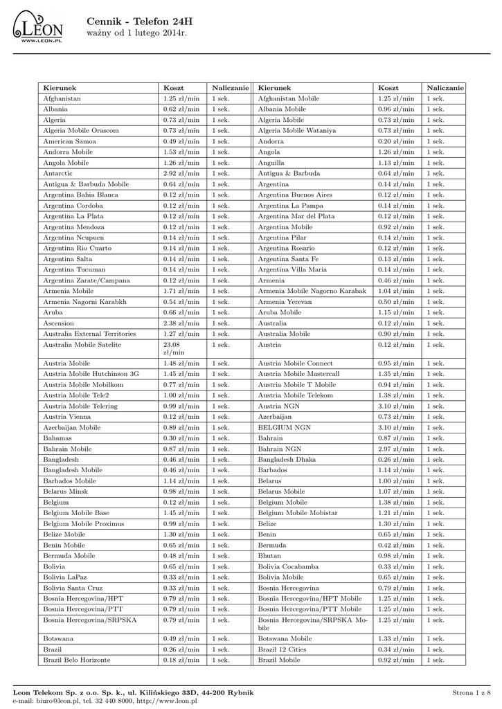Cennik - Telefon 24H ważny od 1 lutego 2014r. Kierunek Koszt Naliczanie Kierunek Koszt Naliczanie Afghanistan 1.25 zł/min 1 sek. Afghanistan Mobile 1.25 zł/min 1 sek. Albania 0.62 zł/min 1 sek. Albania Mobile 0.96 zł/min 1 sek. Algeria 0.73 zł/min 1 sek. Algeria Mobile 0.73 zł/min 1 sek. Algeria Mobile Orascom 0.73 zł/min 1 sek. Algeria Mobile Wataniya 0.73 zł/min 1 sek. American Samoa 0.49 zł/min 1 sek. Andorra 0.20 zł/min 1 sek. Andorra Mobile 1.53 zł/min 1 sek. Angola 1.26 zł/min 1 sek. Angola Mobile 1.26 zł/min 1 sek. Anguilla 1.13 zł/min 1 sek. Antarctic 2.92 zł/min 1 sek. Antigua & Barbuda 0.64 zł/min 1 sek. Antigua & Barbuda Mobile 0.64 zł/min 1 sek. Argentina 0.14 zł/min 1 sek. Argentina Bahia Blanca 0.12 zł/min 1 sek. Argentina Buenos Aires 0.12 zł/min 1 sek. Argentina Cordoba 0.12 zł/min 1 sek. Argentina La Pampa 0.14 zł/min 1 sek. Argentina La Plata 0.12 zł/min 1 sek. Argentina Mar del Plata 0.12 zł/min 1 sek. Argentina Mendoza 0.12 zł/min 1 sek. Argentina Mobile 0.92 zł/min 1 sek. Argentina Neupuen 0.14 zł/min 1 sek. Argentina Pilar 0.14 zł/min 1 sek. Argentina Rio Cuarto 0.14 zł/min 1 sek. Argentina Rosario 0.12 zł/min 1 sek. Argentina Salta 0.14 zł/min 1 sek. Argentina Santa Fe 0.13 zł/min 1 sek. Argentina Tucuman 0.14 zł/min 1 sek. Argentina Villa Maria 0.14 zł/min 1 sek. Argentina Zarate/Campana 0.12 zł/min 1 sek. Armenia 0.46 zł/min 1 sek. Armenia Mobile 1.71 zł/min 1 sek. Armenia Mobile Nagorno Karabak 1.04 zł/min 1 sek. Armenia Nagorni Karabkh 0.54 zł/min 1 sek. Armenia Yerevan 0.50 zł/min 1 sek. Aruba 0.66 zł/min 1 sek. Aruba Mobile 1.15 zł/min 1 sek. Ascension 2.38 zł/min 1 sek. Australia 0.12 zł/min 1 sek. Australia External Territories 1.27 zł/min 1 sek. Australia Mobile 0.90 zł/min 1 sek. Australia Mobile Satelite 23.08 zł/min 1 sek. Austria 0.12 zł/min 1 sek. Austria Mobile 1.48 zł/min 1 sek. Austria Mobile Connect 0.95 zł/min 1 sek. Austria Mobile Hutchinson 3G 1.45 zł/min 1 sek. Austria Mobile Mastercall 1.35 zł/min 1 sek. Austria Mobile Mobilkom 0.77 zł/min 1 sek. Austria Mobile T Mobile 0.94 zł/min 1 sek. Austria Mobile Tele2 1.00 zł/min 1 sek. Austria Mobile Telekom 1.38 zł/min 1 sek. Austria Mobile Telering 0.99 zł/min 1 sek. Austria NGN 3.10 zł/min 1 sek. Austria Vienna 0.12 zł/min 1 sek. Azerbaijan 0.73 zł/min 1 sek. Azerbaijan Mobile 0.89 zł/min 1 sek. BELGIUM NGN 3.10 zł/min 1 sek. Bahamas 0.30 zł/min 1 sek. Bahrain 0.87 zł/min 1 sek. Bahrain Mobile 0.87 zł/min 1 sek. Bahrain NGN 2.97 zł/min 1 sek. Bangladesh 0.46 zł/min 1 sek. Bangladesh Dhaka 0.26 zł/min 1 sek. Bangladesh Mobile 0.46 zł/min 1 sek. Barbados 1.14 zł/min 1 sek. Barbados Mobile 1.14 zł/min 1 sek. Belarus 1.00 zł/min 1 sek. Belarus Minsk 0.98 zł/min 1 sek. Belarus Mobile 1.07 zł/min 1 sek. Belgium 0.12 zł/min 1 sek. Belgium Mobile 1.38 zł/min 1 sek. Belgium Mobile Base 1.45 zł/min 1 sek. Belgium Mobile Mobistar 1.21 zł/min 1 sek. Belgium Mobile Proximus 0.99 zł/min 1 sek. Belize 1.30 zł/min 1 sek. Belize Mobile 1.30 zł/min 1 sek. Benin 0.65 zł/min 1 sek. Benin Mobile 0.65 zł/min 1 sek. Bermuda 0.42 zł/min 1 sek. Bermuda Mobile 0.48 zł/min 1 sek. Bhutan 0.98 zł/min 1 sek. Bolivia 0.65 zł/min 1 sek. Bolivia Cocabamba 0.33 zł/min 1 sek. Bolivia LaPaz 0.33 zł/min 1 sek. Bolivia Mobile 0.65 zł/min 1 sek. Bolivia Santa Cruz 0.33 zł/min 1 sek. Bosnia Hercegovina 0.79 zł/min 1 sek. Bosnia Hercegovina/HPT 0.79 zł/min 1 sek. Bosnia Hercegovina/HPT Mobile 1.25 zł/min 1 sek. Bosnia Hercegovina/PTT 0.79 zł/min 1 sek. Bosnia Hercegovina/PTT Mobile 1.25 zł/min 1 sek. Bosnia Hercegovina/SRPSKA 0.79 zł/min 1 sek. Bosnia Hercegovina/SRPSKA Mobile 1.25 zł/min 1 sek. Botswana 0.49 zł/min 1 sek. Botswana Mobile 1.33 zł/min 1 sek. Brazil 0.26 zł/min 1 sek. Brazil 12 Cities 0.34 zł/min 1 sek. Brazil Belo Horizonte 0.18 zł/min 1 sek. Brazil Mobile 0.92 zł/min 1 sek. Leon Telekom Sp. z o.o. Sp. k., ul. Kilińskiego 33D, 44-200 Rybnik e-mail: [email protected], tel. 32 440 8000, http://www.leon.pl Strona 1 z 8 Brazil Rio 0.14 zł/min 1 sek. Brazil Sao Paulo 0.12 zł/min 1 sek. British Virgin Islands 0.66 zł/min 1 sek. Brunei 0.27 zł/min 1 sek. Brunei Mobile 0.31 zł/min 1 sek. Bulgaria 0.29 zł/min 1 sek. Bulgaria Mobile Globul 1.21 zł/min 1 sek. Bulgaria Mobile Mobikom 1.02 zł/min 1 sek. Bulgaria Mobile Mobitel 1.23 zł/min 1 sek. Bulgaria Mobile Others 1.71 zł/min 1 sek. Bulgaria Sofia 0.16 zł/min 1 sek. Burkina Faso 0.82 zł/min 1 sek. Burkina Faso Mobile 1.38 zł/min 1 sek. Burundi 0.54 zł/min 1 sek. CROATIA NGN 3.10 zł/min 1 sek. Cambodia 1.06 zł/min 1 sek. Cambodia Mobile 1.06 zł/min 1 sek. Cameroon 0.86 zł/min 1 sek. Cameroon Douala 0.86 zł/min 1 sek. Cameroon Mobile 0.86 zł/min 1 sek. Cameroon Mobile MTN 0.86 zł/min 1 sek. Cameroon Mobile Orange 0.86 zł/min 1 sek. Canada 0.12 zł/min 1 sek. Canada Alberta 0.12 zł/min 1 sek. Canada BR Columbia 0.12 zł/min 1 sek. Canada Manitoba 0.12 zł/min 1 sek. Canada North West Territory 0.12 zł/min 1 sek. Canada Ontario 0.12 zł/min 1 sek. Canada Quebec 0.12 zł/min 1 sek. Cape Verde 1.25 zł/min 1 sek. Cape Verde Mobile 1.25 zł/min 1 sek. Cayman Islands 0.65 zł/min 1 sek. Central African Republic 0.79 zł/min 1 sek. Chad 1.34 zł/min 1 sek. Chile 0.12 zł/min 1 sek. Chile Easter Island 0.13 zł/min 1 sek. Chile Mobile 0.98 zł/min 1 sek. Chile Santiago 0.12 zł/min 1 sek. China 0.12 zł/min 1 sek. China Beijing 0.12 zł/min 1 sek. China Guangzhou 0.12 zł/min 1 sek. China Mobile 0.12 zł/min 1 sek. China Shanghai 0.12 zł/min 1 sek. China Shenzhen 0.12 zł/min 1 sek. Colombia 0.38 zł/min 1 sek. Colombia Bogota 0.22 zł/min 1 sek. Colombia Cali 0.22 zł/min 1 sek. Colombia Mobile 0.50 zł/min 1 sek. Comores 1.58 zł/min 1 sek. Comores Global 2698 1.58 zł/min 1 sek. Comores Mayotte 1.58 zł/min 1 sek. Comores Mayotte Mobile 1.58 zł/min 1 sek. Comores Mobile 1.58 zł/min 1 sek. Congo 0.69 zł/min 1 sek. Congo Dem. Rep. 1.81 zł/min 1 sek. Congo D