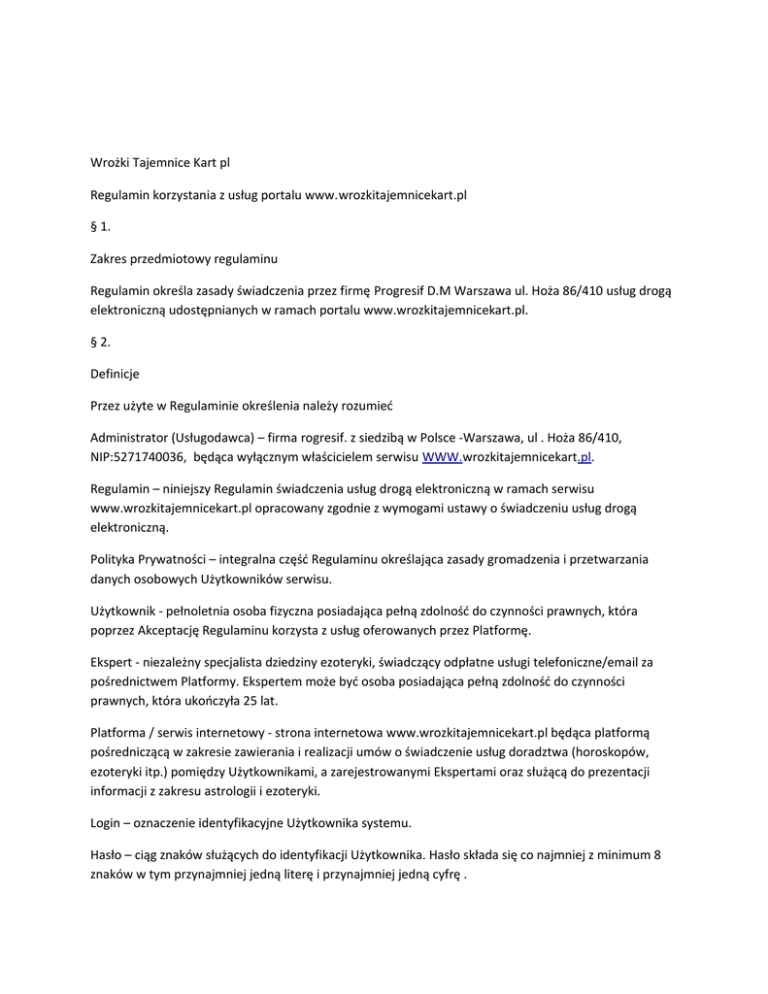 Wrożki Tajemnice Kart pl Regulamin korzystania z usług portalu www.wrozkitajemnicekart.pl § 1. Zakres przedmiotowy regulaminu Regulamin określa zasady świadczenia przez firmę Progresif D.M Warszawa ul. Hoża 86/410 usług drogą elektroniczną udostępnianych w ramach portalu www.wrozkitajemnicekart.pl. § 2. Definicje Przez użyte w Regulaminie określenia należy rozumieć Administrator (Usługodawca) – firma rogresif. z siedzibą w Polsce -Warszawa, ul . Hoża 86/410, NIP:5271740036, będąca wyłącznym właścicielem serwisu WWW.wrozkitajemnicekart.pl. Regulamin – niniejszy Regulamin świadczenia usług drogą elektroniczną w ramach serwisu www.wrozkitajemnicekart.pl opracowany zgodnie z wymogami ustawy o świadczeniu usług drogą elektroniczną. Polityka Prywatności – integralna część Regulaminu określająca zasady gromadzenia i przetwarzania danych osobowych Użytkowników serwisu. Użytkownik - pełnoletnia osoba fizyczna posiadająca pełną zdolność do czynności prawnych, która poprzez Akceptację Regulaminu korzysta z usług oferowanych przez Platformę. Ekspert - niezależny specjalista dziedziny ezoteryki, świadczący odpłatne usługi telefoniczne/email za pośrednictwem Platformy. Ekspertem może być osoba posiadająca pełną zdolność do czynności prawnych, która ukończyła 25 lat. Platforma / serwis internetowy - strona internetowa www.wrozkitajemnicekart.pl będąca platformą pośredniczącą w zakresie zawierania i realizacji umów o świadczenie usług doradztwa (horoskopów, ezoteryki itp.) pomiędzy Użytkownikami, a zarejestrowanymi Ekspertami oraz służącą do prezentacji informacji z zakresu astrologii i ezoteryki. Login – oznaczenie identyfikacyjne Użytkownika systemu. Hasło – ciąg znaków służących do identyfikacji Użytkownika. Hasło składa się co najmniej z minimum 8 znaków w tym przynajmniej jedną literę i przynajmniej jedną cyfrę . Świadczenie usług drogą elektroniczną – wykonanie usługi, które następuje przez wysyłanie i odbieranie danych za pomocą systemów teleinformatycznych, na indywidualne żądanie użytkownika systemu, bez jednoczesnej obecności stron, przy czym dane te są transmitowane za pośrednictwem sieci publicznej. § 3. Postanowienia ogólne Każdy Użytkownik jest zobowiązany do zapoznania się z treścią niniejszego Regulaminu przed rozpoczęciem korzystania z Platformy. Do korzystania z usług drogą elektroniczną dochodzi poprzez rozpoczęcie korzystania z Platformy. Prawem właściwym do stosowania niniejszego Regulaminu oraz zawarcia i wykonania umowy o świadczenie usług drogą elektroniczną jest prawo polskie. § 4. Rejestracja Użytkowników Przeglądanie informacji na Platformie, połączenia głosowe o podwyższonej płatności nie wymagają rejestracji Użytkownika. Pozostałe usługi, poniżej wskazane w Regulaminie, wymagają bezpłatnej rejestracji Użytkownika. Korzystanie z usług przedpłaconych PREPAID wymaga rejestracji Użytkownika. Formularz rejestracyjny jest dostępny jest pod adresem http://www.wrozkitajemnicekart.pl/rejestracja_klientow,wrozby-tarothoroskop. W wyniku prawidłowej rejestracji osoba fizyczna staje się użytkownikiem Platformy, a Administrator tworzy dla niej konto przypisane do nazwy (loginu) podanej w formularzu rejestracyjnym. Użytkownik uzyskuje dostęp do swojego konta po podaniu nazwy (loginu) i prawidłowego hasła. Konto użytkownika zawiera dane podane przez niego w trakcie rejestracji. Użytkownik może w każdej chwili usunąć swoje konto z serwisu. Konto użytkownika jest niezbywalne. Użytkownik nie może udostępniać swojego konta innym osobom ani korzystać z kont innych użytkowników. § 5. Usługi Na podstawie niniejszego regulaminu Platforma świadczy usługi drogą elektroniczną polegające na udzieleniu Użytkownikowi Platformy dostępu do materiałów informacyjnych zgromadzonych na serwerze oraz pośredniczeniu w zakresie zawierania i realizacji umów o świadczenie usług doradztwa (horoskopów, ezoteryki itp.) pomiędzy Użytkownikami, a zarejestrowanymi Ekspertami. Usługi te są udostępniane Użytkownikowi i polegają w szczególności na: nieodpłatnej możliwości przeglądania informacji dotyczących astrologii i ezoteryki, przy czym Użytkownik jest zobowiązany do zapłaty wynagrodzenia na rzecz podmiotów świadczących usługi telekomunikacyjne w zakresie dostępu do Internetu i transmisji danych (operatorzy telekomunikacyjni) z tytułu korzystania z dostępu do Internetu lub/i transmisji danych, zgodnie z cennikami i regulaminami świadczenia tych usług obowiązującymi u tych podmiotów, przy czym wynagrodzenie to nie jest pobierane przez Administratora; możliwości kontaktu z Ekspertami poprzez połączenia głosowe,, e-mail, połączenia przedpłacone zamówione mailowo. Przeglądanie informacji na Platformie, połączenia głosowe o podwyższonej płatności oraz SMS Premium nie wymagają rejestracji Użytkownika. Pozostałe usługi, poniżej wskazane w Regulaminie, wymagają bezpłatnej rejestracji Użytkownika. Administrator nie jest inicjatorem transmisji, nie dokonuje wyboru odbiorcy danych oraz nie ingeruje i nie wpływa na treść przekazu będącego przedmiotem transmisji. § 6. Przeglądanie informacji na Platformie Przeglądanie informacji na Platformie nie wymaga rejestracji Użytkownika. Do przeglądania informacji zamieszczonych na Platformie dochodzi poprzez rozpoczęcie korzystania z serwisu WWW.wrozkitajemnicekart.pl. Przeglądanie informacji na Platformie jest nieodpłatne. § 7. Połączenia głosowe i usługa mail. Korzystanie z połączeń głosowych z Ekspertami na numer 708 oraz wysyłanie zapytan mail nie wymaga rejestracji Użytkownika. § 8. Odpowiedzialność Użytkownika Użytkownik ponosi pełną odpowiedzialność za treść przekazywanych danych podczas rejestracji oraz oświadcza, że podane dane są prawdziwe, nie naruszają praw osób trzecich, praw znaków