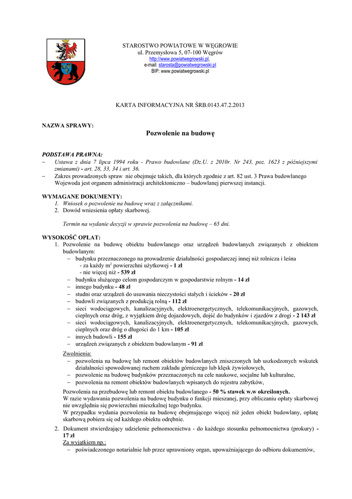 STAROSTWO POWIATOWE W WĘGROWIE ul. Przemysłowa 5, 07-100 Węgrów http://www.powiatwegrowski.pl, e-mail: [email protected] BIP: www.powiatwegrowski.pl KARTA INFORMACYJNA NR ŚRB.0143.47.2.2013 NAZWA SPRAWY: Pozwolenie na budowę PODSTAWA PRAWNA: − Ustawa z dnia 7 lipca 1994 roku - Prawo budowlane (Dz.U. z 2010r. Nr 243, poz. 1623 z późniejszymi zmianami) - art. 28, 33, 34 i art. 36. − Zakres prowadzonych spraw nie obejmuje takich, dla których zgodnie z art. 82 ust. 3 Prawa budowlanego Wojewoda jest organem administracji architektoniczno – budowlanej pierwszej instancji. WYMAGANE DOKUMENTY: 1. Wniosek o pozwolenie na budowę wraz z załącznikami. 2. Dowód wniesienia opłaty skarbowej. Termin na wydanie decyzji w sprawie pozwolenia na budowę – 65 dni. WYSOKOŚĆ OPŁAT: 1. Pozwolenie na budowę obiektu budowlanego oraz urządzeń budowlanych związanych z obiektem budowlanym: − budynku przeznaczonego na prowadzenie działalności gospodarczej innej niż rolnicza i leśna - za każdy m2 powierzchni użytkowej - 1 zł - nie więcej niż - 539 zł − budynku służącego celom gospodarczym w gospodarstwie rolnym - 14 zł − innego budynku - 48 zł − studni oraz urządzeń do usuwania nieczystości stałych i ścieków - 20 zł − budowli związanych z produkcją rolną - 112 zł − sieci wodociągowych, kanalizacyjnych, elektroenergetycznych, telekomunikacyjnych, gazowych, cieplnych oraz dróg, z wyjątkiem dróg dojazdowych, dojść do budynków i zjazdów z drogi - 2 143 zł − sieci wodociągowych, kanalizacyjnych, elektroenergetycznych, telekomunikacyjnych, gazowych, cieplnych oraz dróg o długości do 1 km - 105 zł − innych budowli - 155 zł − urządzeń związanych z obiektem budowlanym - 91 zł Zwolnienia: − pozwolenia na budowę lub remont obiektów budowlanych zniszczonych lub uszkodzonych wskutek działalności spowodowanej ruchem zakładu górniczego lub klęsk żywiołowych, − pozwolenie na budowę budynków przeznaczonych na cele naukowe, socjalne lub kulturalne, − pozwolenia na remont obiektów budowlanych wpisanych do rejestru zabytków, Pozwolenia na przebudowę lub remont obiektu budowlanego - 50 % stawek w.w określonych. W razie wydawania pozwolenia na budowę budynku o funkcji mieszanej, przy obliczaniu opłaty skarbowej nie uwzględnia się powierzchni mieszkalnej tego budynku. W przypadku wydania pozwolenia na budowę obejmującego więcej niż jeden obiekt budowlany, opłatę skarbową pobiera się od każdego obiektu odrębnie. 2. Dokument stwierdzający udzielenie pełnomocnictwa - do każdego stosunku pełnomocnictwa (prokury) 17 zł Za wyjątkiem np.: − poświadczonego notarialnie lub przez uprawniony organ, upoważniającego do odbioru dokumentów, Opłacie skarbowej nie podlega: − dokonanie czynności urzędowej oraz zezwolenia w sprawach budownictwa mieszkaniowego, Zwalnia się z opłaty skarbowej np: − jednostki budżetowe, − jednostki samorządu terytorialnego, − organizacje pożytku publicznego, jeżeli dokonują zgłoszenia lub składają wniosek o dokonanie czynności urzędowej albo wniosek o wydanie zaświadczenia lub zezwolenia – wyłącznie w związku z nieodpłatną działalnością pożytku publicznego w rozumieniu przepisów o działalności pożytku publicznego i o wolontariacie, − osoby, które dokonując zgłoszenia lub składając wniosek o dokonanie czynności urzędowej albo wniosek o wydanie zaświadczenia lub zezwolenia (pozwolenia, koncesji) albo składając dokument stwierdzający udzielenie pełnomocnictwa lub prokury albo odpis, wypis lub kopię przedstawią zaświadczenie o korzystaniu ze świadczeń pomocy społecznej z powodu ubóstwa, Opłatę skarbową można wnieść: • gotówką - w kasie Starostwa Powiatowego w Węgrowie (budynek główny, piętro1) • w formie bezgotówkowej - na niżej podane konto Urzędu Miasta w Węgrowie Bank PKO BP SA o/Węgrów Nr konta 75 1020 4476 00008902 0094 6004 ze stosownym zapiskiem o celu wniesionej wpłaty JEDNOSTKA ODPOWIEDZIALNA: Wydział Środowiska Rolnictwa i Budownictwa – mający swoją lokalizację w budynku przy ul. Piłsudskiego 23, na I piętrze, tel. (025) 792-20-31. TRYB ODWOŁAWCZY: Odwołanie od decyzji wnosi się do Wojewody Mazowieckiego, za pośrednictwem Starosty Węgrowskiego, w terminie do 14 dni od dnia jej doręczenia. Przed upływem terminu do wniesienia odwołania decyzja nie ulega wykonaniu. Wniesienie odwołania w terminie, wstrzymuje wykonanie decyzji. Powyższe zastrzeżenia nie dotyczą decyzji którym został nadany rygor natychmiastowej wykonalności lub które podlegają natychmiastowemu wykonaniu z mocy ustawy. Odwołanie składa się w sekretariacie tut. Urzędu, bezpośrednio w wydziale lub można wysłać je pocztą. Termin do wniesienia odwołania będzie zachowany także wtedy, gdy przed jego upływem pismo zawierające odwołanie zostanie nadane w polskim urzędzie pocztowym. UWAGI: 1. Projekt budowlany musi być wykonany przez osobę posiadającą wymagane uprawnienia budowlane oraz wpisaną na listę członków właściwej izby samorządu zawodowego (do projektu powinna być dołączona kopia uprawnień projektanta i kopia aktualnego zaświadczenia o jego przynależności do właściwej izby samorządu zawodowego). 2. Projektant do sporządzonego projektu powinien dołączyć oświadczenie w trybie art. 20 ust. 4 Prawa budowlanego oraz informację dotyczącą bezpieczeństwa i ochrony zdrowia ze względu na specyfikę projektowanego obiektu (jest ona uwzględniana w planie bezpieczeństwa i ochrony zdrowia opracowywanym później przez kierownika budowy). 3. Projekt budowlany powinien spełniać wymagania określone w decyzji o warunkach zabudowy i zagospodarowania terenu (jeżeli jest ona wymagana zgodnie z przepisami o planowaniu i zagospodarowaniu przestrzennym) oraz planu zagospodarowania przestrzennego gminy (jeżeli jest uchwalony). 4. Projekt budowlany powinien zawierać: a) projekt zagospodarow