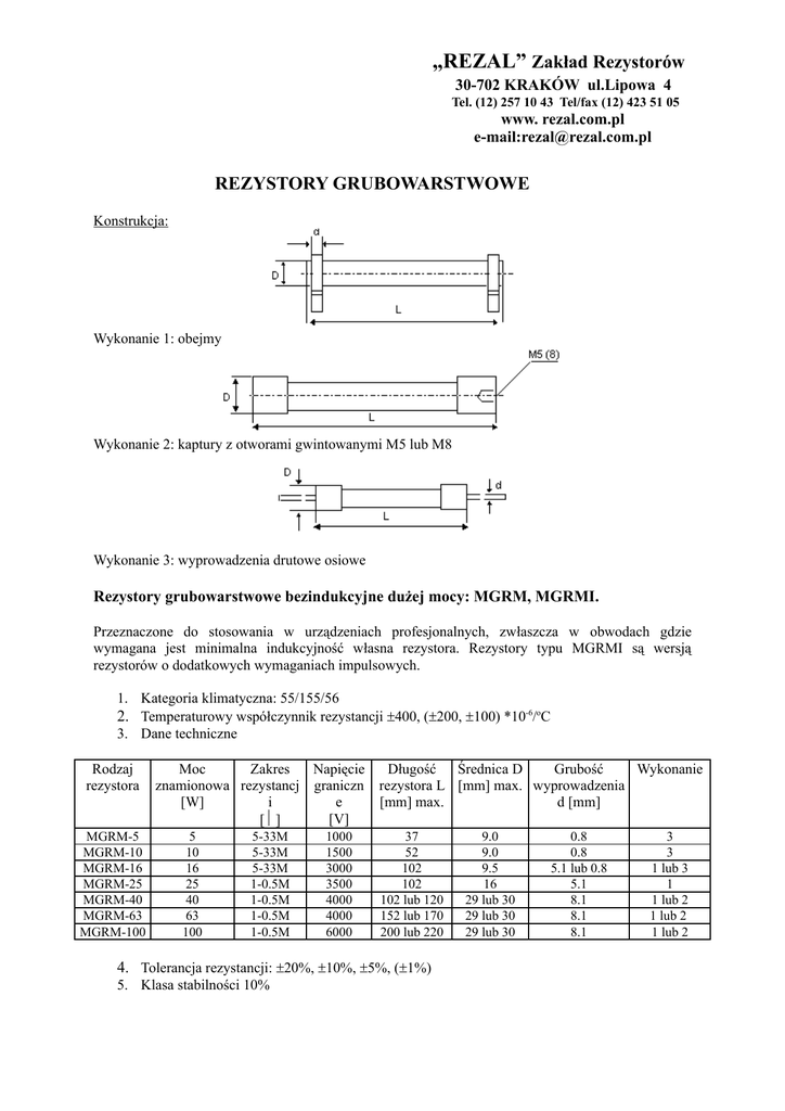 „REZAL” Zakład Rezystorów 30-702 KRAKÓW ul.Lipowa 4 Tel. (12) 257 10 43 Tel/fax (12) 423 51 05 www. rezal.com.pl e-mail:[email protected] REZYSTORY GRUBOWARSTWOWE Konstrukcja: Wykonanie 1: obejmy Wykonanie 2: kaptury z otworami gwintowanymi M5 lub M8 Wykonanie 3: wyprowadzenia drutowe osiowe Rezystory grubowarstwowe bezindukcyjne dużej mocy: MGRM, MGRMI. Przeznaczone do stosowania w urządzeniach profesjonalnych, zwłaszcza w obwodach gdzie wymagana jest minimalna indukcyjność własna rezystora. Rezystory typu MGRMI są wersją rezystorów o dodatkowych wymaganiach impulsowych. 1. Kategoria klimatyczna: 55/155/56 2. Temperaturowy współczynnik rezystancji ±400, (±200, ±100) *10-6/oC 3. Dane techniczne Rodzaj rezystora MGRM-5 MGRM-10 MGRM-16 MGRM-25 MGRM-40 MGRM-63 MGRM-100 Moc Zakres Napięcie znamionowa rezystancj graniczn [W] i e [V] [Ω] 5 10 16 25 40 63 100 5-33M 5-33M 5-33M 1-0.5M 1-0.5M 1-0.5M 1-0.5M 1000 1500 3000 3500 4000 4000 6000 Długość Średnica D Grubość Wykonanie rezystora L [mm] max. wyprowadzenia [mm] max. d [mm] 37 52 102 102 102 lub 120 152 lub 170 200 lub 220 4. Tolerancja rezystancji: ±20%, ±10%, ±5%, (±1%) 5. Klasa stabilności 10% 9.0 9.0 9.5 16 29 lub 30 29 lub 30 29 lub 30 0.8 0.8 5.1 lub 0.8 5.1 8.1 8.1 8.1 3 3 1 lub 3 1 1 lub 2 1 lub 2 1 lub 2 Rezystory grubowarstwowe stałe MGR. Przeznaczone do pracy w obwodach napięcia stałego, zmiennego i impulsowego. 1. Kategoria klimatyczna: 55/155/56 2. Temperaturowy współczynnik rezystancji ±400, ±200, ±150 (±50, ±25) *10-6/oC 3. Dane techniczne Rodzaj Moc Zakres rezystora znamionowa rezystancj [W] i [Ω] MGRL-2 MGRC-2.5 MGRL-3 MGRC-5 2 2.5 3 5 10-100M 10-10M 5-10G 5-10M Napięcie graniczne [V] Długość rezystora L [mm] max. 1500-A,2000-B 1500-A,2000-B 2000-A,3000-B 2000-A,3000-B 17 17 27 27 Średnica Grubość Wykonanie D [mm] wyprowadzenia max. d [mm] 6.8 6.8 8.8 8.8 0.8 0.8 0.8 0.8 3 3 3 3 Wykonanie B o podwyższonej wytrzymałości napięciowej. 4. Tolerancja rezystancji: ±20%, ±10%, ±5%, (±1%, ±0.5%, ±0.2%) 5. Klasa stabilności 5% 6. Obciążenie w funkcji temperatury otoczenia. Rezystory grubowarstwowe wysokonapięciowe MGRW. Przeznaczone do pracy w obwodach wysokiego napięcia. 1. Kategoria klimatyczna: 55/125/21 2. Temperaturowy współczynnik rezystancji ±200, ±150 (±50, ±25) *10-6/oC 3. Dane techniczne Rodzaj rezystora MGRW-1 MGRW-1.6 MGRW-63 MGRW-100 Moc Zakres Napięcie znamionowa rezystancj graniczn [W] i e [V] [Ω] 1 1.6 63 100 1-500M 500k-1G 1M-1G 1M-1G Długość Średnica D Grubość Wykonanie rezystora L [mm] max. wyprowadzenia [mm] max. d [mm] 5000 10000 25000 33000 27 37 170 220 8.8 8.8 30 30 4. Tolerancja rezystancji: ±20%, ±10%, ±5%, (±1%, ±0.5%, ±0.2%) 5. Klasa stabilności 5% 6. Obciążenie w funkcji temperatury otoczenia. 0.8 0.8 --- 3 3 2 2