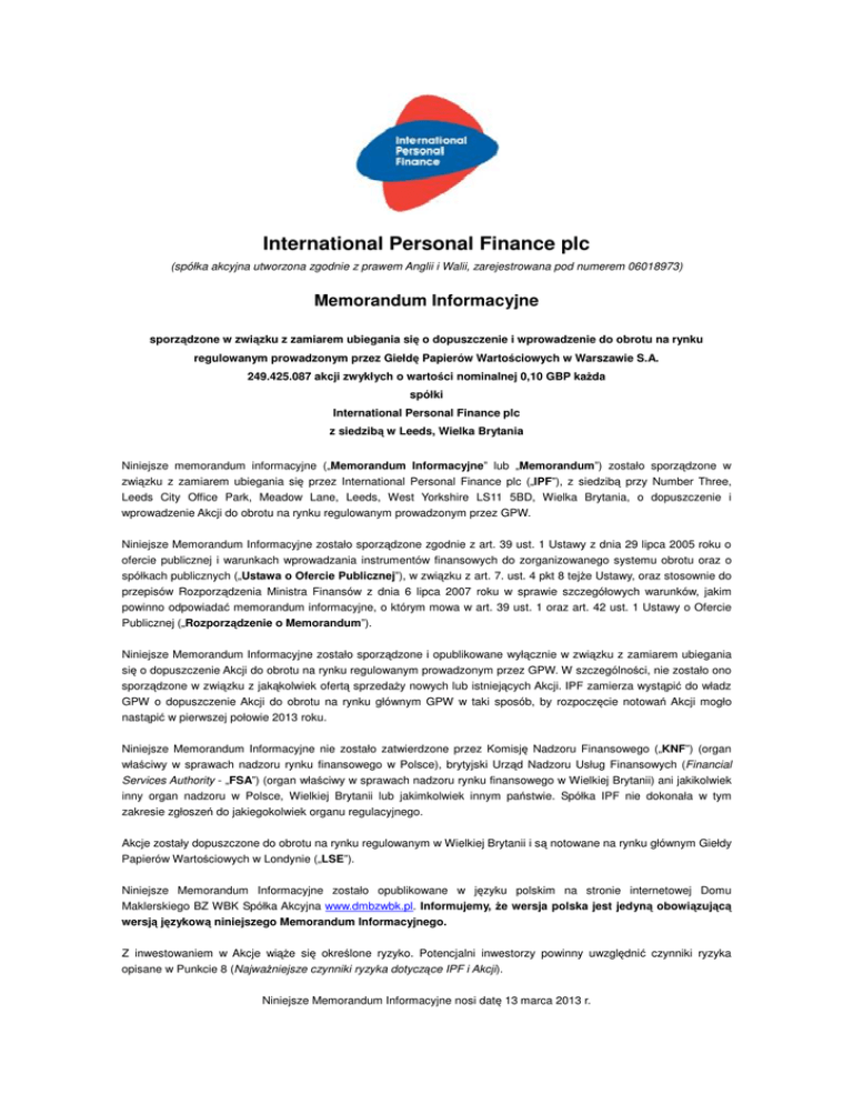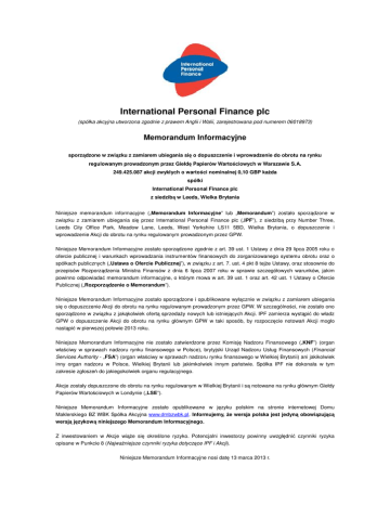 International Personal Finance plc (spółka akcyjna utworzona zgodnie z prawem Anglii i Walii, zarejestrowana pod numerem 06018973) Memorandum Informacyjne sporządzone w związku z zamiarem ubiegania się o dopuszczenie i wprowadzenie do obrotu na rynku regulowanym prowadzonym przez Giełdę Papierów Wartościowych w Warszawie S.A. 249.425.087 akcji zwykłych o wartości nominalnej 0,10 GBP kaŜda spółki International Personal Finance plc z siedzibą w Leeds, Wielka Brytania Niniejsze memorandum informacyjne („Memorandum Informacyjne” lub „Memorandum”) zostało sporządzone w związku z zamiarem ubiegania się przez International Personal Finance plc („IPF”), z siedzibą przy Number Three, Leeds City Office Park, Meadow Lane, Leeds, West Yorkshire LS11 5BD, Wielka Brytania, o dopuszczenie i wprowadzenie Akcji do obrotu na rynku regulowanym prowadzonym przez GPW. Niniejsze Memorandum Informacyjne zostało sporządzone zgodnie z art. 39 ust. 1 Ustawy z dnia 29 lipca 2005 roku o ofercie publicznej i warunkach wprowadzania instrumentów finansowych do zorganizowanego systemu obrotu oraz o spółkach publicznych („Ustawa o Ofercie Publicznej”), w związku z art. 7. ust. 4 pkt 8 tejŜe Ustawy, oraz stosownie do przepisów Rozporządzenia Ministra Finansów z dnia 6 lipca 2007 roku w sprawie szczegółowych warunków, jakim powinno odpowiadać memorandum informacyjne, o którym mowa w art. 39 ust. 1 oraz art. 42 ust. 1 Ustawy o Ofercie Publicznej („Rozporządzenie o Memorandum”). Niniejsze Memorandum Informacyjne zostało sporządzone i opublikowane wyłącznie w związku z zamiarem ubiegania się o dopuszczenie Akcji do obrotu na rynku regulowanym prowadzonym przez GPW. W szczególności, nie zostało ono sporządzone w związku z jakąkolwiek ofertą sprzedaŜy nowych lub istniejących Akcji. IPF zamierza wystąpić do władz GPW o dopuszczenie Akcji do obrotu na rynku głównym GPW w taki sposób, by rozpoczęcie notowań Akcji mogło nastąpić w pierwszej połowie 2013 roku. Niniejsze Memorandum Informacyjne nie zostało zatwierdzone przez Komisję Nadzoru Finansowego („KNF”) (organ właściwy w sprawach nadzoru rynku finansowego w Polsce), brytyjski Urząd Nadzoru Usług Finansowych (Financial Services Authority - „FSA”) (organ właściwy w sprawach nadzoru rynku finansowego w Wielkiej Brytanii) ani jakikolwiek inny organ nadzoru w Polsce, Wielkiej Brytanii lub jakimkolwiek innym państwie. Spółka IPF nie dokonała w tym zakresie zgłoszeń do jakiegokolwiek organu regulacyjnego. Akcje zostały dopuszczone do obrotu na rynku regulowanym w Wielkiej Brytanii i są notowane na rynku głównym Giełdy Papierów Wartościowych w Londynie („LSE”). Niniejsze Memorandum Informacyjne zostało opublikowane w języku polskim na stronie internetowej Domu Maklerskiego BZ WBK Spółka Akcyjna www.dmbzwbk.pl. Informujemy, Ŝe wersja polska jest jedyną obowiązującą wersją językową niniejszego Memorandum Informacyjnego. Z inwestowaniem w Akcje wiąŜe się określone ryzyko. Potencjalni inwestorzy powinny uwzględnić czynniki ryzyka opisane w Punkcie 8 (NajwaŜniejsze czynniki ryzyka dotyczące IPF i Akcji). Niniejsze Memorandum Informacyjne nosi datę 13 marca 2013 r. Istotne informacje O ile w niniejszym Memorandum Informacyjnym w wyraźny sposób nie wskazano inaczej, wszelkie zawarte w nim odniesienia do „Punktu” oznaczają odpowiedni punkt niniejszego Memorandum Informacyjnego. Terminy pisane wielką literą oraz określone terminy branŜowe i inne terminy uŜyte w niniejszym Memorandum Informacyjnym, które nie zostały w nim zdefiniowane, mają znaczenie przypisane im w Punkcie 15 (Definicje). IPF jest zdania, Ŝe czynniki ryzyka opisane w Punkcie 8 (NajwaŜniejsze czynniki ryzyka dotyczące IPF i Akcji) stanowią główne czynniki ryzyka związane z inwestowaniem w Akcje, przy czym IPF nie składa jakiegokolwiek oświadczenia, Ŝe zawarte w Punkcie 8 (NajwaŜniejsze czynniki ryzyka dotyczące IPF i Akcji) stwierdzenia dotyczące ryzyka związanego z posiadaniem Akcji mają charakter wyczerpujący. Potencjalni inwestorzy powinni ponadto zapoznać się ze szczegółowymi informacjami zawartymi w pozostałych częściach niniejszego Memorandum Informacyjnego (w tym we wszystkich dokumentach włączonych do niego przez odniesienie) oraz wyrobić sobie własny pogląd przed podjęciem decyzji o zainwestowaniu w Akcje. Potencjalni nabywcy powinni samodzielnie ocenić istotność informacji zawartych w niniejszym Memorandum Informacyjnym, z uwzględnieniem jego późniejszych uzupełnień, a wyraŜenie zainteresowania nabyciem jakichkolwiek Akcji powinno być poprzedzone przeprowadzeniem badania w takim zakresie, jaki kaŜdy z nabywców uzna za konieczny. Niniejsze Memorandum Informacyjne nie powinno być interpretowane jako rekomendacja ze strony IPF zalecająca któremukolwiek z odbiorców niniejszego Memorandum Informacyjnego nabycie jakichkolwiek Akcji. Niniejsze Memorandum Informacyjne nie stanowi ani nie zawiera jakiejkolwiek rekomendacji inwestycyjnej ze strony IPF ani nie powinno być w ten sposób interpretowane, a kaŜdy potencjalny nabywca Akcji powinien dokonać niezaleŜnej oceny zawartych w nim informacji, w tym w szczególności ryzyka inwestycyjnego związanego z nabyciem Akcji. KaŜda decyzja inwestycyjna powinna być poprzedzona wszelkimi badaniami, jakie podejmująca ją osoba uzna za konieczne. Niniejsze Memorandum Informacyjne zostało sporządzone na podstawie przepisów art. 39 ust.1 Ustawy o Ofercie Publicznej, w związku z art. 7 ust. 4 pkt 8 tejŜe Ustawy. Wskazane wyŜej przepisy zezwalają emitentowi papierów wartościowych dopuszczonych do obrotu na zagranicznym rynku regulowanym na ubieganie się o dopuszczenie swoich papierów wartościowych do obrotu na rynku regulowanym prowadzonym przez GPW, o ile spełnione są warunki określone w art. 7 ust. 4 pkt 8 Ustawy o Ofercie Publicznej, bez konieczności sporządzenia prospek