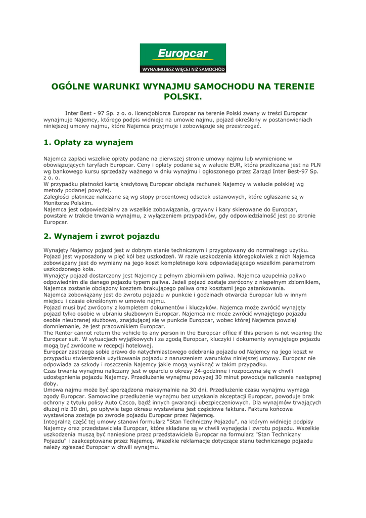 OGÓLNE WARUNKI WYNAJMU SAMOCHODU NA TERENIE POLSKI. Inter Best - 97 Sp. z o. o. licencjobiorca Europcar na terenie Polski zwany w treści Europcar wynajmuje Najemcy, którego podpis widnieje na umowie najmu, pojazd określony w postanowieniach niniejszej umowy najmu, które Najemca przyjmuje i zobowiązuje się przestrzegać. 1. Opłaty za wynajem Najemca zapłaci wszelkie opłaty podane na pierwszej stronie umowy najmu lub wymienione w obowiązujących taryfach Europcar. Ceny i opłaty podane są w walucie EUR, która przeliczana jest na PLN wg bankowego kursu sprzedaŜy waŜnego w dniu wynajmu i ogłoszonego przez Zarząd Inter Best-97 Sp. z o. o. W przypadku płatności kartą kredytową Europcar obciąŜa rachunek Najemcy w walucie polskiej wg metody podanej powyŜej. Zaległości płatnicze naliczane są wg stopy procentowej odsetek ustawowych, które ogłaszane są w Monitorze Polskim. Najemca jest odpowiedzialny za wszelkie zobowiązania, grzywny i kary skierowane do Europcar, powstałe w trakcie trwania wynajmu, z wyłączeniem przypadków, gdy odpowiedzialność jest po stronie Europcar. 2. Wynajem i zwrot pojazdu Wynajęty Najemcy pojazd jest w dobrym stanie technicznym i przygotowany do normalnego uŜytku. Pojazd jest wyposaŜony w pięć kół bez uszkodzeń. W razie uszkodzenia któregokolwiek z nich Najemca zobowiązany jest do wymiany na jego koszt kompletnego koła odpowiadającego wszelkim parametrom uszkodzonego koła. Wynajęty pojazd dostarczony jest Najemcy z pełnym zbiornikiem paliwa. Najemca uzupełnia paliwo odpowiednim dla danego pojazdu typem paliwa. JeŜeli pojazd zostaje zwrócony z niepełnym zbiornikiem, Najemca zostanie obciąŜony kosztem brakującego paliwa oraz kosztami jego zatankowania. Najemca zobowiązany jest do zwrotu pojazdu w punkcie i godzinach otwarcia Europcar lub w innym miejscu i czasie określonym w umowie najmu. Pojazd musi być zwrócony z kompletem dokumentów i kluczyków. Najemca moŜe zwrócić wynajęty pojazd tylko osobie w ubraniu słuŜbowym Europcar. Najemca nie moŜe zwrócić wynajętego pojazdu osobie nieubranej słuŜbowo, znajdującej się w punkcie Europcar, wobec której Najemca powziął domniemanie, Ŝe jest pracownikiem Europcar. The Renter cannot return the vehicle to any person in the Europcar office if this person is not wearing the Europcar suit. W sytuacjach wyjątkowych i za zgodą Europcar, kluczyki i dokumenty wynajętego pojazdu mogą być zwrócone w recepcji hotelowej. Europcar zastrzega sobie prawo do natychmiastowego odebrania pojazdu od Najemcy na jego koszt w przypadku stwierdzenia uŜytkowania pojazdu z naruszeniem warunków niniejszej umowy. Europcar nie odpowiada za szkody i roszczenia Najemcy jakie mogą wyniknąć w takim przypadku. Czas trwania wynajmu naliczany jest w oparciu o okresy 24-godzinne i rozpoczyna się w chwili udostępnienia pojazdu Najemcy. PrzedłuŜenie wynajmu powyŜej 30 minut powoduje naliczenie następnej doby. Umowa najmu moŜe być sporządzona maksymalnie na 30 dni. PrzedłuŜenie czasu wynajmu wymaga zgody Europcar. Samowolne przedłuŜenie wynajmu bez uzyskania akceptacji Europcar, powoduje brak ochrony z tytułu polisy Auto Casco, bądź innych gwarancji ubezpieczeniowych. Dla wynajmów trwających dłuŜej niŜ 30 dni, po upływie tego okresu wystawiana jest częściowa faktura. Faktura końcowa wystawiona zostaje po zwrocie pojazdu Europcar przez Najemcę. Integralną część tej umowy stanowi formularz "Stan Techniczny Pojazdu", na którym widnieje podpisy Najemcy oraz przedstawiciela Europcar, które składane są w chwili wynajęcia i zwrotu pojazdu. Wszelkie uszkodzenia muszą być naniesione przez przedstawiciela Europcar na formularz "Stan Techniczny Pojazdu" i zaakceptowane przez Najemcę. Wszelkie reklamacje dotyczące stanu technicznego pojazdu naleŜy zgłaszać Europcar w chwili wynajmu. 2.1. Zwrot pojazdu poza godzinami pracy biura Zwrot pojazdu poza godzinami pracy Europcar nie zwalnia Najemcy z odpowiedzialności za wynajęty pojazd. Odpowiedzialność taka wygasa w chwili sprawdzenia pojazdu przez przedstawiciela Europcar. W przypadku braku potwierdzenia odbioru pojazdu przez przedstawiciela Europcar na formularzu "Stan Techniczny Pojazdu" oraz stwierdzenia uszkodzenia pojazdu, innego niŜ te, które zostały zaakceptowane przez Najemcę w chwili wynajmu, stroną odpowiedzialną za uszkodzenia zostaje Najemca. Najemca musi pozostawić wynajęty pojazd na parkingu wskazanym przez Europcar. JeŜeli punkt wynajmu wyposaŜony jest w tzw. "skrzynkę zwrotu pojazdu" wówczas Najemca musi w niej pozostawić kluczyki i dokumenty pojazdu, umowę najmu oraz bilet wjazdu na parking (jeŜeli posiada). Pozostawienie kluczyków i dokumentów w "skrzynce zwrotu pojazdu", poza godzinami pracy biura, nie powoduje zakończenia umowy najmu. Odpowiedzialność Najemcy za wynajęty pojazd wygasa w momencie pobrania dokumentów i kluczyków pojazdu ze "skrzynki zwrotu pojazdu" oraz sprawdzenia pojazdu przez pracownika Europcar po otwarciu biura. Zakończenie umowy najmu odbywa się po odzyskaniu kluczyków i dokumentów pojazdu, sprawdzeniu pojazdu oraz wpisaniu daty i godziny zwrotu. Jako datę i godzinę zwrotu przyjmuję się datę i godzinę otwarcia punktu Europcar następnego dnia po zwrocie lub datę i godzinę znajdującą się na parkingowym bilecie wjazdu. 2.2 Zwrot pojazdu poza punktem Europcar Zwrot pojazdu poza punktem Europcar moŜe odbyć się po wcześniejszej akceptacji Europcar. Jako datę i godzinę zwrotu pojazdu poza punktem Europcar uwaŜa się datę i godzinę podaną przez Najemcę pracownikowi Europcar. Europcar jest zobowiązany do odbioru pojazdu w ciągu 24 godzin od momentu przyjęcia informacji od Najemcy. Najemca jest odpowiedzialny za wszelkie uszkodzenia pojazdu, mandaty itp. do 4 godzin od chwili zgłoszenia zwrotu pojazdu pracownikowi Europcar. JeŜeli Europcar nie odbierze pojazdu w podanym czasie, wówczas wszelka odpowiedzialność przec