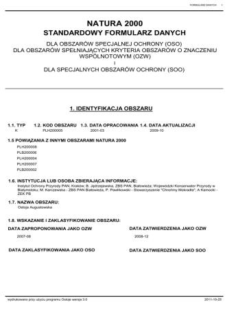 FORMULARZ DANYCH 1 NATURA 2000 STANDARDOWY FORMULARZ DANYCH DLA OBSZARÓW SPECJALNEJ OCHRONY (OSO) DLA OBSZARÓW SPEŁNIAJĄCYCH KRYTERIA OBSZARÓW O ZNACZENIU WSPÓLNOTOWYM (OZW) I DLA SPECJALNYCH OBSZARÓW OCHRONY (SOO) 1. IDENTYFIKACJA OBSZARU 1.1. TYP 1.2. KOD OBSZARU 1.3. DATA OPRACOWANIA 1.4. DATA AKTUALIZACJI K PLH200005 2001-03 2009-10 1.5 POWIĄZANIA Z INNYMI OBSZARAMI NATURA 2000 PLH200008 PLB200006 PLH200004 PLH200007 PLB200002 1.6. INSTYTUCJA LUB OSOBA ZBIERAJĄCA INFORMACJE: Instytut Ochrony Przyrody PAN, Kraków; B. Jędrzejewska, ZBS PAN, Białowieża; Wojewódzki Konserwator Przyrody w Białymstoku; M. Karczewska - ZBS PAN Białowieża, P. Pawlikowski - Stowarzyszenie "Chrońmy Mokradła"; A Kamocki ZEK PB 1.7. NAZWA OBSZARU: Ostoja Augustowska 1.8. WSKAZANIE I ZAKLASYFIKOWANIE OBSZARU: DATA ZAPROPONOWANIA JAKO OZW 2007-08 DATA ZAKLASYFIKOWANIA JAKO OSO wydrukowano przy użyciu programu Ostoje wersja 3.0 DATA ZATWIERDZENIA JAKO OZW 2008-12 DATA ZATWIERDZENIA JAKO SOO 2011-10-25 OBSZAR: PLH200005 Ostoja Augustowska NATURA 2000 FORMULARZ DANYCH 2. POŁOŻENIE OBSZARU 2.1. POŁOŻENIE CENTRALNEGO PUNKTU OBSZARU DŁUGOŚĆ GEOGRAFICZNA E 23 9 SZEROKOŚĆ GEOGRAFICZNA 57 2.2. POWIERZCHNIA (ha): N 53 45 58 2.3. DŁUGOŚĆ OBSZARU (km): 107 068,7 2.4. WYSOKOŚĆ (m n.p.m.): MINIMALNA 102 MAKSYMALNA ŚREDNIA 152 120 2.5. REGION ADMINISTRACYJNY (NUTS) Kod PL345 Nazwa regionu Suwalski % 100 2.6. REGION BIOGEOGRAFICZNY Nazwa regionu biogeograficznego Kontynentalny 2/ 1 2 OBSZAR: PLH200005 Ostoja Augustowska NATURA 2000 FORMULARZ DANYCH 3. INFORMACJA PRZYRODNICZA 3.1. Typy SIEDLISK znajdujące się na terenie obszaru Natura 2000 oraz ocena znaczenia obszaru dla tych siedlisk 3.1.a. Typy SIEDLISK wymienione w Załączniku I Dyrektywy Rady 92/43/EWG Kod 2330 3140 3150 3160 3260 3270 4030 6120 6410 6430 6510 7110 7140 7150 7210 7230 9170 91D0 91E0 91I0 91T0 Nazwa siedliska Wydmy śródlądowe z murawami napiaskowymi Twardowodne oligo- i mezotroficzne zbiorniki wodne z podwodnymi łąkami ramienic Charetea Starorzecza i naturalne eutroficzne zbiorniki wodne ze zbiorowiskami z Nympheion, Potamion Naturalne, dystroficzne zbiorniki wodne Stopień Względna Stan % pokrycia Reprezen. powierzch zachow. 0,01 0,20 2,50 0,15 Nizinne i podgórskie rzeki ze zbiorowiskami włosieniczników Ranunculion fluitantis Zalewane muliste brzegi rzek 0,01 Suche wrzosowiska (Calluno-Genistion, Pohlio-Callunion, Calluno-Arctostaphylion) Ciepłolubne, śródlądowe murawy napiaskowe (Koelerion glaucae) Zmiennowilgotne łąki trzęślicowe (Molinion) Ziołorośla górskie (Adenostylion alliariae) i ziołorośla nadrzeczne (Convolvuletalia sepium) 0,01 Niżowe i górskie świeże łąki użytkowane ekstensywnie (Arrhenatherion elatioris) Torfowiska wysokie z roślinnością torfotwórczą (żywe) Torfowiska przejściowe i trzęsawiska (przeważnie z roślinnością z Scheuchzerio-Caricetea) 0,20 0,10 Obniżenia na podłożu torfowym z roślinnością ze związku Rhynchosporion Torfowiska nakredowe (Cladietum marisci, Caricetum buxbaumii, Schoenetum nigricantis) Górskie i nizinne torfowiska zasadowe o charakterze młak, turzycowisk i mechowisk Grąd środkowoeuropejski i subkontynentalny (Galio-Carpinetum, Tilio-Carpinetum) Bory i lasy bagienne (Vaccinio uliginosi-Betuletum pubescentis, Vaccinio uliginosi-Pinetum, Pino Łęgi wierzbowe, topolowe, olszowe i jesionowe (Salicetum albo-fragilis, Populetum albae, Alnenion Ciepłolubne dąbrowy (Quercetalia pubescenti-petraeae) Sosnowy bór chrobotkowy (Cladonio-Pinetum i chrobotkowa postać Peucedano-Pinetum) 0,03 0,50 2,00 8,00 2,00 0,90 B A A A B B B C B B B A A A A A A A B C B C C B B C C C C C C C C C C C C C B C B C B B A A A B A C A B A B A A B A A B A B B Ocena ogólna B B A A B B B C B C B B A A A A A A B C B 3.1 / 1 3 OBSZAR: PLH200005 Ostoja Augustowska NATURA 2000 FORMULARZ DANYCH 3.2. GATUNKI, których dotyczy Artykuł 4 Dyrektywy Rady 79/409/EWG i gatunki wymienione w Załączniku II Dyrektywy Rady 92/43/EWG oraz ocena znaczenia obszaru dla tych gatunków 3.2.a. PTAKI wymienione w Załączniku I Dyrektywy Rady 79/409/EWG KOD NAZWA POPULACJA OSIADŁA Rozrodcza A007 A021 A030 A031 A060 A072 A073 A075 A080 A081 A084 A089 A090 A091 A104 A108 A119 A122 A127 A154 A193 A197 A215 A223 A224 A231 A234 A238 A239 A241 A246 A272 A307 A320 A338 A379 A409 Podiceps auritus Botaurus stellaris Ciconia nigra Ciconia ciconia Aythya nyroca Pernis apivorus Milvus migrans Haliaeetus albicilla Circaetus gallicus Circus aeruginosus Circus pygargus Aquila pomarina Aquila clanga Aquila chrysaetos Bonasa bonasia Tetrao urogallus Porzana porzana Crex crex Grus grus Gallinago media Sterna hirundo Chlidonias niger Bubo bubo Aegolius funereus Caprimulgus europaeus Coracias garrulus Picus canus Dendrocopos medius Dendrocopos leucotos Picoides tridactylus Lullula arborea Luscinia svecica Sylvia nisoria Ficedula parva Lanius collurio Emberiza hortulana Tetrao tetrix tetrix OCENA ZNACZENIA OBSZARU MIGRUJĄCA Zimująca Populacja Stan zach. Izolacja Ogólnie Przelotna P >20p 27-39p P P 50-75p P 1-2p 1p P 4p 40-51p P P P 25i P P 90-110p P P P 3p 10p P <2p 25-30p P 35-45p 25-30p P P P P P P P D D D D D D D D D D D D D D D D D D D D D D D D D D D D D D D D D D D D D 3.2.b. Regularnie występujące Ptaki Migrujące nie wymienione w Załączniku I Dyrektywy Rady 79/409/EWG KOD NAZWA POPULACJA OSIADŁA Rozrodcza A005 Podiceps cristatus OCENA ZNACZENIA OBSZARU MIGRUJĄCA P Zimująca Populacja Stan zach. Izolacja Ogólnie Przelotna D 3.2 / 1 3 OBSZAR: PLH200005 A052 A053 A055 A067 A123 A125 A153 A155 A162 A165 A207 A344 Ostoja Augustowska NATURA 2000 FORMULARZ DANYCH Anas crecca Anas platyrhynchos Anas querquedula Bucephala clangula Gallinula chloropus Fulica atra Gallinago gallinago Scolopax rusticola Tringa totanus Tringa ochropus Columba oenas Nucifraga caryocatactes P P P P P P P P P 60-80p 60-70p P D D D D D D D D D D D D 3.2.c. SSAKI wymienione w Załączniku II Dyrektywy Rady 92/43/EWG KOD NAZW