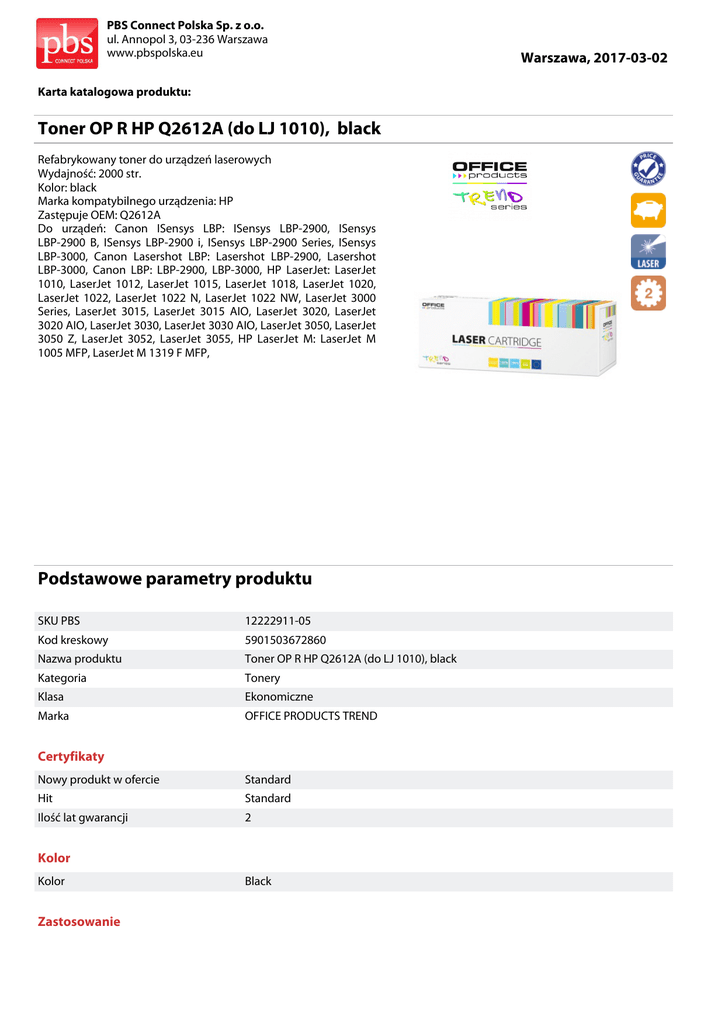 PBS Connect Polska Sp. z o.o. ul. Annopol 3, 03-236 Warszawa www.pbspolska.eu Karta katalogowa produktu: Toner OP R HP Q2612A (do LJ 1010), black Refabrykowany toner do urządzeń laserowych Wydajność: 2000 str. Kolor: black Marka kompatybilnego urządzenia: HP Zastępuje OEM: Q2612A Do urządeń: Canon ISensys LBP: ISensys LBP-2900, ISensys LBP-2900 B, ISensys LBP-2900 i, ISensys LBP-2900 Series, ISensys LBP-3000, Canon Lasershot LBP: Lasershot LBP-2900, Lasershot LBP-3000, Canon LBP: LBP-2900, LBP-3000, HP LaserJet: LaserJet 1010, LaserJet 1012, LaserJet 1015, LaserJet 1018, LaserJet 1020, LaserJet 1022, LaserJet 1022 N, LaserJet 1022 NW, LaserJet 3000 Series, LaserJet 3015, LaserJet 3015 AIO, LaserJet 3020, LaserJet 3020 AIO, LaserJet 3030, LaserJet 3030 AIO, LaserJet 3050, LaserJet 3050 Z, LaserJet 3052, LaserJet 3055, HP LaserJet M: LaserJet M 1005 MFP, LaserJet M 1319 F MFP, Podstawowe parametry produktu SKU PBS 12222911-05 Kod kreskowy 5901503672860 Nazwa produktu Toner OP R HP Q2612A (do LJ 1010), black Kategoria Tonery Klasa Ekonomiczne Marka OFFICE PRODUCTS TREND Certyfikaty Nowy produkt w ofercie Standard Hit Standard Ilość lat gwarancji 2 Kolor Kolor Zastosowanie Black Warszawa, 2017-03-02 PBS Connect Polska Sp. z o.o. ul. Annopol 3, 03-236 Warszawa www.pbspolska.eu Karta katalogowa produktu cd. Toner OP R HP Q2612A (do LJ 1010), black Podstawowe parametry produktu Zastosowanie Do urządzeń laserowych Cecha Produkt HP Typ Refabrykowany W ofercie od 2015-07 Wspólny słownik zamówień CPV 30125110-5 Toner do drukarek laserowych/faksów Jednostki logistyczne Opakowanie 1 34 szt Opakowanie 2 350 szt Warszawa, 2017-03-02