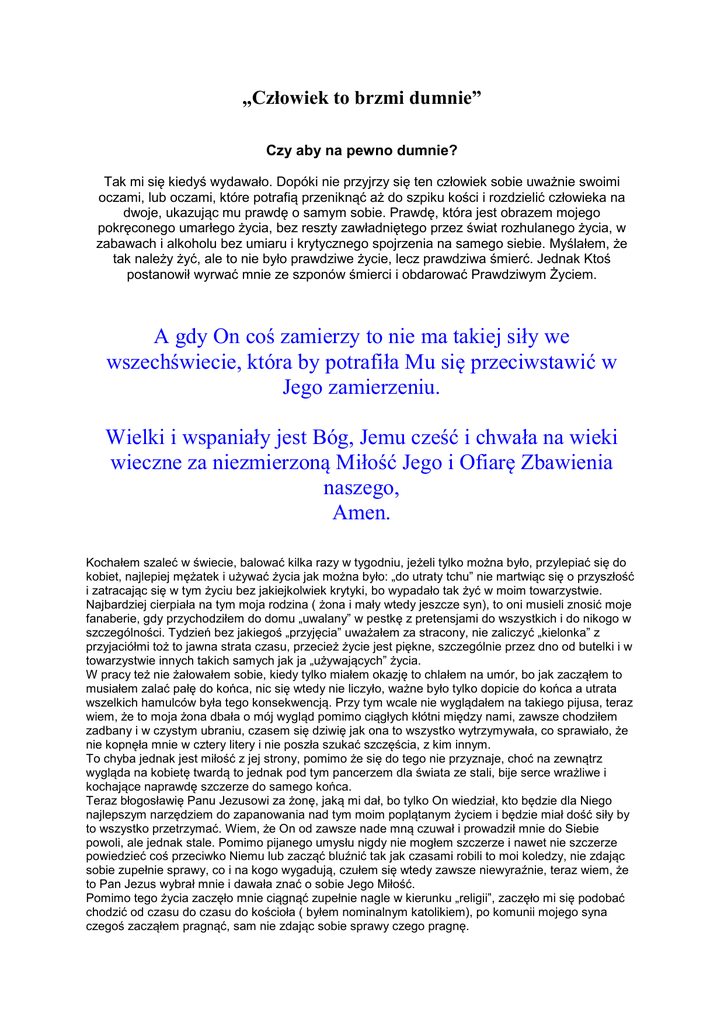 „Człowiek to brzmi dumnie” Czy aby na pewno dumnie? Tak mi się kiedyś wydawało. Dopóki nie przyjrzy się ten człowiek sobie uważnie swoimi oczami, lub oczami, które potrafią przeniknąć aż do szpiku kości i rozdzielić człowieka na dwoje, ukazując mu prawdę o samym sobie. Prawdę, która jest obrazem mojego pokręconego umarłego życia, bez reszty zawładniętego przez świat rozhulanego życia, w zabawach i alkoholu bez umiaru i krytycznego spojrzenia na samego siebie. Myślałem, że tak należy żyć, ale to nie było prawdziwe życie, lecz prawdziwa śmierć. Jednak Ktoś postanowił wyrwać mnie ze szponów śmierci i obdarować Prawdziwym Życiem. A gdy On coś zamierzy to nie ma takiej siły we wszechświecie, która by potrafiła Mu się przeciwstawić w Jego zamierzeniu. Wielki i wspaniały jest Bóg, Jemu cześć i chwała na wieki wieczne za niezmierzoną Miłość Jego i Ofiarę Zbawienia naszego, Amen. Kochałem szaleć w świecie, balować kilka razy w tygodniu, jeżeli tylko można było, przylepiać się do kobiet, najlepiej mężatek i używać życia jak można było: „do utraty tchu” nie martwiąc się o przyszłość i zatracając się w tym życiu bez jakiejkolwiek krytyki, bo wypadało tak żyć w moim towarzystwie. Najbardziej cierpiała na tym moja rodzina ( żona i mały wtedy jeszcze syn), to oni musieli znosić moje fanaberie, gdy przychodziłem do domu „uwalany” w pestkę z pretensjami do wszystkich i do nikogo w szczególności. Tydzień bez jakiegoś „przyjęcia” uważałem za stracony, nie zaliczyć „kielonka” z przyjaciółmi toż to jawna strata czasu, przecież życie jest piękne, szczególnie przez dno od butelki i w towarzystwie innych takich samych jak ja „używających” życia. W pracy też nie żałowałem sobie, kiedy tylko miałem okazję to chlałem na umór, bo jak zacząłem to musiałem zalać pałę do końca, nic się wtedy nie liczyło, ważne było tylko dopicie do końca a utrata wszelkich hamulców była tego konsekwencją. Przy tym wcale nie wyglądałem na takiego pijusa, teraz wiem, że to moja żona dbała o mój wygląd pomimo ciągłych kłótni między nami, zawsze chodziłem zadbany i w czystym ubraniu, czasem się dziwię jak ona to wszystko wytrzymywała, co sprawiało, że nie kopnęła mnie w cztery litery i nie poszła szukać szczęścia, z kim innym. To chyba jednak jest miłość z jej strony, pomimo że się do tego nie przyznaje, choć na zewnątrz wygląda na kobietę twardą to jednak pod tym pancerzem dla świata ze stali, bije serce wrażliwe i kochające naprawdę szczerze do samego końca. Teraz błogosławię Panu Jezusowi za żonę, jaką mi dał, bo tylko On wiedział, kto będzie dla Niego najlepszym narzędziem do zapanowania nad tym moim poplątanym życiem i będzie miał dość siły by to wszystko przetrzymać. Wiem, że On od zawsze nade mną czuwał i prowadził mnie do Siebie powoli, ale jednak stale. Pomimo pijanego umysłu nigdy nie mogłem szczerze i nawet nie szczerze powiedzieć coś przeciwko Niemu lub zacząć bluźnić tak jak czasami robili to moi koledzy, nie zdając sobie zupełnie sprawy, co i na kogo wygadują, czułem się wtedy zawsze niewyraźnie, teraz wiem, że to Pan Jezus wybrał mnie i dawała znać o sobie Jego Miłość. Pomimo tego życia zaczęło mnie ciągnąć zupełnie nagle w kierunku „religii”, zaczęło mi się podobać chodzić od czasu do czasu do kościoła ( byłem nominalnym katolikiem), po komunii mojego syna czegoś zacząłem pragnąć, sam nie zdając sobie sprawy czego pragnę. Pomimo całej otoczki w kościele katolickim i uczestniczenia we mszy nie znalazłem spokoju i czułem, że z Bogiem nie da się „załatwić” niczego, bo widziałem coraz lepiej samego siebie i powiem szczerze, nie był to widok zachwycający. Spowiedź pomimo chwilowego uczucia spokoju nie załatwiała niczego i wydawała mi się nie na miejscu. Gadać komuś do ucha moje najskrytsze sekrety i wierzyć, że to wystarczy Bogu?, nie tu coś nie „grało”. Pewnego dnia będąc w pracy zacząłem rozmawiać z kolegą po fachu Jackiem ( oboje pracujemy jako kierowcy, choć już niestety nie razem), którego nie bardzo lubiłem, ( dziś jest to mój najukochańszy brat w Chrystusie) na temat Apokalipsy i końca świata, co czeka ludzkość i czy jest jakaś nadzieja dla nas jako ludzi, czy stoczymy się w otchłań jakiegoś kataklizmu jak mówi o tym Biblia. Nigdy nie czytałem Biblii, bo mnie to nie interesowało; nie jednak kiedyś sięgnąłem po Biblię, chciałem sprawdzić teorię jakiegoś pisarza na temat odwiedzin naszej planety przez „paleo astronautów”, na potwierdzenie, czego miał być Stary Testament i wędrówka Żydów po pustyni. Wiecie, czego dowodził autor?, ni mniej ni więcej tylko, że ci „astronauci” testowali wpływ jednostajnego pokarmu ( czterdzieści lat manny z nieba, produkowanej przez specjalną maszynę) na ludzki organizm, czy może wystąpią jakieś zwyrodnienia, itp. bzdety, wiecie, że ja w to wierzyłem?. Ale wracając do rozmowy z Jackiem, oboje nie wiedzieliśmy za bardzo jak odnieść się do Biblii, on trochę ją czytał, ja jeszcze w tedy nie. Pomyślałem wtedy o moim kuzynie Romanie, który zna Biblię, bo kilka razy starał się mi mówić o Bogu i Zbawicielu, a ja uważałem to za jakieś „głupoty” jak zresztą cała moja rodzina, jednak przy naszej dyskusji z Jackiem, jak raz nadawał się do wyjaśnienia nam „palącego” problemu i objaśnienia nam Apokalipsy. Wiele przez telefon to myśmy się nie dowiedzieli, bo i jak?. Muszę powiedzieć, że nie rozmawiałem z Romanem z osiem lat, kiedy to pożyczyłem od niego Biblię do sprawdzenia teorii Denikena czy innego autora owej teorii, ( wiecie, wpływ jednostajnego żywienia...) Biblia przeleżała na półce ładnych kilka lat i w życiu bym nie przypuszczał, że Pan będzie kiedyś do mnie przemawiał poprzez nią właśni