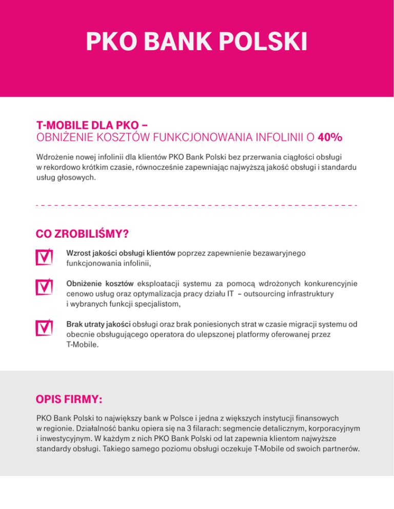 pko bank polski t-mobile dla pko – obniżenie kosztÓw funkcjonowania infolinii o 40% Wdrożenie nowej infolinii dla klientów PKO Bank Polski bez przerwania ciągłości obsługi w rekordowo krótkim czasie, równocześnie zapewniając najwyższą jakość obsługi i standardu usług głosowych. co zrobiliśmy? Wzrost jakości obsługi klientów poprzez zapewnienie bezawaryjnego funkcjonowania infolinii, Obniżenie kosztów eksploatacji systemu za pomocą wdrożonych konkurencyjnie cenowo usług oraz optymalizacja pracy działu IT – outsourcing infrastruktury i wybranych funkcji specjalistom, Brak utraty jakości obsługi oraz brak poniesionych strat w czasie migracji systemu od obecnie obsługującego operatora do ulepszonej platformy oferowanej przez T-Mobile. opis firmy: PKO Bank Polski to największy bank w Polsce i jedna z większych instytucji finansowych w regionie. Działalność banku opiera się na 3 filarach: segmencie detalicznym, korporacyjnym i inwestycyjnym. W każdym z nich PKO Bank Polski od lat zapewnia klientom najwyższe standardy obsługi. Takiego samego poziomu obsługi oczekuje T-Mobile od swoich partnerów. wyzwanie dla t-mobile i pko bp: zmiana operatora infolinii bez przerwania ciągłości obsługi obiżenie kosztÓw obsługi infolinii. zapewnienie najwyższej jakości obsługi. Bankowi PKO zależało na zmianie operatora infolinii, ponieważ dotychczasowy nie spełniał standardów współpracy na odpowiednim poziomie oraz nie był konkurencyjny pod względem cenowym. Osobom odpowiedzialnym za migrację po stronie banku zależało na tym, żeby proces przebiegł bez zakłóceń, zgodnie z zakładanym harmonogramem. sytuacja zastana Skala przedsięwzięcia: Prowadzenie 1,5 miliona minut rozmów miesięcznie, Działanie infolinii 24/7, Obsługiwanie przez „osiemsetki” tj. infolinie 0-800 całego systemu - system reklamacyjny oraz sprzedażowy, uwzględniając również klientów pracujących poza granicami kraju. rozwiązanie wprowadzone przez t-mobile oraz korzyści dla klienta Co zrobiliśmy? Opracowaliśmy kompleksowy system obsługi infolinii, Zagwarantowaliśmy ciągłości działalności biznesowej Banku – (opracowanie procesu migracji do sieci T-Mobile bez konieczności przerywania działania infolinii), Dobraliśmy parametry usług tak, aby obniżyć koszty ponoszone przez Bank. Co zyskał nasz Klient PKO Bank Polski? Obniżenie kosztów funkcjonowania infolinii o 40% (ok. 30 000 zł oszczędności miesięcznie), Rozbudowa callcenter o 300 stanowisk oraz rozpoczęcie sprzedaży usług przez callcenter (dzięki rozbudowaniu dostępów ISDN), Rozwój biznesu (rozbudowa infolinii pozwoliła przejąć inny bank). opis procesu Jak T-Mobile przeprowadził proces migracji? Projektem z ramienia T-Mobile zarządzała i koordynowała Urszula Kruczek - Top Account Manager T-Mobile, której w jego realizacji pomagał nasz Główny Specjalista ds. Produktu oraz Główny Specjalista ds. Wdrożeń. Wiodącym zadaniem było terminowe dostarczenie sług ISDN. Realizacji wspomnianego przedsięwzięcia dokonano w oparciu o infrastrukturę własną, dzierżawę światłowodów od innych dostawców, a także poprzez użycie radiolinii – takie rozwiązanie pozwoliło uniknąć długiego procesu budowy całej infrastruktury światłowodowej, koniecznej do uruchomienia usługi. Prawidłowo uruchomienie tejże usługi w okresie zimowym, w przeciągu 1,5 miesiąca (wliczając w to okres świąteczno-noworoczny) wydawało się być praktycznie niemożliwe do wykonania. W realizację zadania mocno zaangażowali się również: Dorota Mazowiecka - Telecommunications Retail Implementation Team Leader oraz Marcin Zalewski, który zajmuje się projektowaniem usług od strony technicznej. Dużym wyzwaniem była sama część organizacyjna, pozwalająca sprawnie przeprowadzić proces migracji – realizacja procesu została wyznaczona na moment najmniejszego obciążenia infolinii czyli na 21 stycznia 2015 o godzinie 01:00 . Migracja nie obyła się bez przeszkód - w samym środku prac wyłączona została portacja usług do T-Mobile. Problem został natychmiast rozwiązany przez Chief Operations Officera T-Mobile. Dzięki pracy zespołowej projekt przebiegł sprawnie i bezpiecznie, zgodnie z zakładanym harmonogramem, spełniając wszystkie ustalone cele - a wszystko bez zakłócania krytycznych procesów biznesowych i płynnej obsługi klienta. testimoniale/referencje/wypowiedzi „Największym wyzwaniem w mojej pracy, z tak wymagającym Partnerem, jakim jest PKO było przejęcie, od wiodącego na rynku Operatora, obsługi Infolinii Banku.” – mówi Urszula Kruczek – Top Account Manager T-Mobile, „Poprzeczka została postawiona wysoko, przedsięwzięcie wymagało zbudowania 30 dostępów ISDN w oparciu o światłowody oraz zapewnienia praktycznie nieprzerwanej pracy Infolinii” – mówi Urszula Kruczek – Top Account Manager T-Mobile. korzyści Co Firma PKO Bank Polski zyskała wybierając T-Mobile? Podwyższony standard obsługi (m.in. pełne wsparcie techniczne inżynierów Centrum Zarządzania Siecią 24/7), Sprawną, bezawaryjną i przeprowadzoną w krótkim czasie migrację do nowego usługodawcy, Obniżenie kosztów o 40%, Podniesienie jakości usług głosowych. produkty wykorzsytane Jakie rozwiązania T-Mobile wykorzystaliśmy? INFOLINIA KRAJOWA Bezpieczny i niezawodny VPN od T-Mobile dla 390 placówek PKO Bank Polski. Rekordowo szybka i bezawaryjna migracja 600 bankomatów PKO Bank Polski do T-Mobile. Case na infolinię. potrzeba Bezawaryjna i korzystna cenowo obsługa infolinii krajowej na najwyższym poziomie.