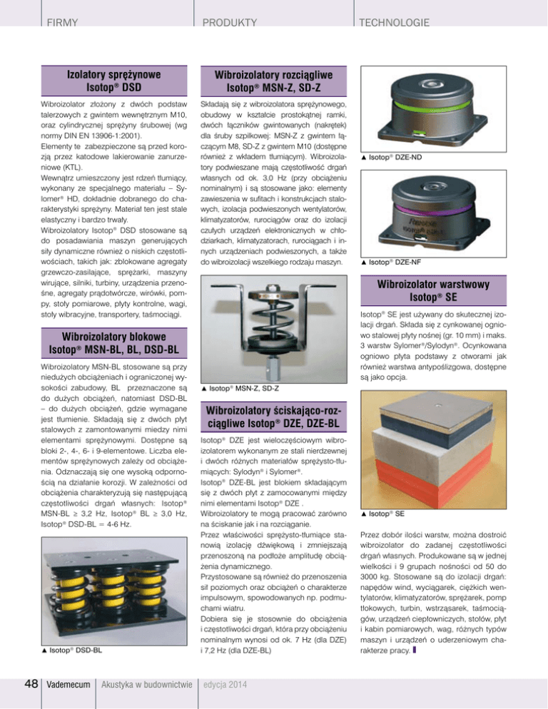 firmy produkty Izolatory sprężynowe Isotop® DSD Wibroizolatory rozciągliwe Isotop® MSN-Z, SD-Z Wibroizolator złożony z dwóch podstaw Składają się z wibroizolatora sprężynowego, talerzowych z gwintem wewnętrznym M10, obudowy w kształcie prostokątnej ramki, oraz cylindrycznej sprężyny śrubowej (wg dwóch łączników gwintowanych (nakrętek) normy DIN EN 13906-1:2001). dla śruby szpilkowej: MSN-Z z gwintem łą- Elementy te zabezpieczone są przed koro- czącym M8, SD-Z z gwintem M10 (dostępne zją przez katodowe lakierowanie zanurze- również z wkładem tłumiącym). Wibroizola- niowe (KTL). tory podwieszane mają częstotliwość drgań Wewnątrz umieszczony jest rdzeń tłumiący, własnych od ok. 3,0 Hz (przy obciążeniu wykonany ze specjalnego materiału – Sy- nominalnym) i są stosowane jako: elementy lomer® HD, dokładnie dobranego do cha- zawieszenia w sufitach i konstrukcjach stalo- rakterystyki sprężyny. Materiał ten jest stale wych, izolacja podwieszonych wentylatorów, elastyczny i bardzo trwały. klimatyzatorów, rurociągów oraz do izolacji Wibroizolatory Isotop® DSD stosowane są czułych urządzeń elektronicznych w chło- do posadawiania maszyn generujących dziarkach, klimatyzatorach, rurociągach i in- siły dynamiczne również o niskich częstotli- nych urządzeniach podwieszonych, a także wościach, takich jak: zblokowane agregaty do wibroizolacji wszelkiego rodzaju maszyn. technologie ▲ Isotop® DZE-ND ▲ Isotop® DZE-NF grzewczo-zasilające, sprężarki, maszyny Wibroizolator warstwowy Isotop® SE wirujące, silniki, turbiny, urządzenia przenośne, agregaty prądotwórcze, wirówki, pompy, stoły pomiarowe, płyty kontrolne, wagi, Isotop® SE jest używany do skutecznej izo- stoły wibracyjne, transportery, taśmociągi. lacji drgań. Składa się z cynkowanej ognio- Wibroizolatory blokowe Isotop® MSN-BL, BL, DSD-BL wo stalowej płyty nośnej (gr. 10 mm) i maks. Wibroizolatory MSN-BL stosowane są przy również warstwa antypoślizgowa, dostępne 3 warstw Sylomer®/Sylodyn®. Ocynkowana ogniowo płyta podstawy z otworami jak niedużych obciążeniach i ograniczonej wysokości zabudowy, BL przeznaczone są są jako opcja. ▲ Isotop® MSN-Z, SD-Z do dużych obciążeń, natomiast DSD-BL – do dużych obciążeń, gdzie wymagane jest tłumienie. Składają się z dwóch płyt stalowych z zamontowanymi miedzy nimi elementami sprężynowymi. Dostępne są Isotop® DZE jest wieloczęściowym wibro- bloki 2-, 4-, 6- i 9-elementowe. Liczba ele- izolatorem wykonanym ze stali nierdzewnej mentów sprężynowych zależy od obciąże- i dwóch różnych materiałów sprężysto-tłu- nia. Odznaczają się one wysoką odporno- miących: Sylodyn® i Sylomer®. ścią na działanie korozji. W zależności od Isotop® DZE-BL jest blokiem składającym obciążenia charakteryzują się następującą się z dwóch płyt z zamocowanymi między częstotliwości drgań własnych: Isotop® nimi elementami Isotop® DZE . MSN-BL ≥ 3,2 Hz, Isotop ® BL ≥ 3,0 Hz, Isotop DSD-BL = 4-6 Hz. ® ▲ Isotop® DSD-BL 48 Wibroizolatory ściskająco-rozciągliwe Isotop® DZE, DZE-BL Vademecum Akustyka w budownictwie Wibroizolatory te mogą pracować zarówno ▲ Isotop® SE na ściskanie jak i na rozciąganie. Przez właściwości sprężysto-tłumiące sta- Przez dobór ilości warstw, można dostroić nowią izolację dźwiękową i zmniejszają wibroizolator do zadanej częstotliwości przenoszoną na podłoże amplitudę obcią- drgań własnych. Produkowane są w jednej żenia dynamicznego. wielkości i 9 grupach nośności od 50 do Przystosowane są również do przenoszenia 3000 kg. Stosowane są do izolacji drgań: sił poziomych oraz obciążeń o charakterze napędów wind, wyciągarek, ciężkich wen- impulsowym, spowodowanych np. podmu- tylatorów, klimatyzatorów, sprężarek, pomp chami wiatru. tłokowych, turbin, wstrząsarek, taśmocią- Dobiera się je stosownie do obciążenia gów, urządzeń ciepłowniczych, stołów, płyt i częstotliwości drgań, która przy obciążeniu i kabin pomiarowych, wag, różnych typów nominalnym wynosi od ok. 7 Hz (dla DZE) maszyn i urządzeń o uderzeniowym cha- i 7,2 Hz (dla DZE-BL) rakterze pracy. edycja 2014