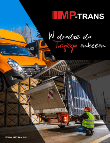 WWW.MPTRANS.PL WWW.MPTRANS.PL KIM JESTESMY? „MP-Trans” działa na rynku transportowym od października 2004r. Siedziba firmy mieści się w centralnej Polsce w miejscowości Poddębice, położonej 40 km od Łodzi. Naszą ideą było i jest tworzenie firmy przyjaznej klientom, która zapewnia profesjonalną obsługę w zakresie świadczonych usług transportowych i spedycyjnych. Celem naszej firmy jest dbanie o dobro klienta, dlatego zatrudniamy wysoko wykwalifikowany personel, który służy radą i pomocą w każdej sytuacji. Solidność i terminowość świadczonych usług pozwoliły nam zdobyć zaufanie wśród kontrahentów. Wszystkie przewożone towary dostarczamy bezpiecznie i zawsze na czas. Stawiając przed sobą coraz wyższe wyzwania, szukamy wciąż nowych partnerów, którzy chcieliby z nami współpracować. Gwarantujemy pełen profesjonalizm usług transportowych. Dostrzegając i rozumiejąc potrzeby naszych klientów, nieustannie dążymy do doskonalenia i wzbogacania oferty transportowej. Nasza firma wyspecjalizowała się w realizacji: terminowych, ekspresowych, bezpośrednich dostaw towarów na linie produkcyjne, linie montażowe, dla branży motoryzacyjnej, do portów lotniczych i morskich. Pozostajemy do dyspozycji przez całą dobę, znajdując optymalne rozwiązania dla naszych klientów i dostarczając na bieżąco informacji o przebiegu realizacji zlecenia. dostaw sprzętu muzycznego, nagłaśniającego, sprzętu oświetleniowego, wszelkiego rodzaju elementów wyposażenia scen koncertowych, planów filmowych, stanowisk firmowych organizowanych na potrzeby targów czy wystaw. Nasze auta wyposażone są w windy samozaładowcze oraz wózki paletowe, dzięki czemu jesteśmy w stanie dostarczyć towar bezpośrednio we wskazane miejsce. szybkich, terminowych dostaw towarów wymagających temperatury kontrolowanej w czasie przewozu, w zakresie od -25 do +25° C. Bezpośrednio po rozładunku sporządzamy i okazujemy odbiorcy wydruk z termografu transportów całopojazdowych, realizowanych z użyciem nadwozi typu mega, zestaw i chłodnia przewozu towarów niebezpiecznych (ADR) w sztukach przesyłki na potrzeby przemysłu farmaceutycznego, chemicznego, energetycznego, budowalnego Świadczymy również usługi spedycyjne, opierając się na współpracy ze sprawdzonymi i zaufanymi podwykonawcami. W porozumieniu ze zleceniodawcą powierzamy przewóz ładunków doświadczonym partnerom, łącząc siły w celu sprostania oczekiwaniom naszych klientów. TABOR SAMOCHODOWY MP-Trans Transport-Spedycja dysponuje nowoczesną flotą samochodową. Ciągły rozwój firmy wiąże się z poszerzaniem jej taboru. Obecnie świadczymy usługi w oparciu o następujące rodzaje pojazdów dostawczych: MARKA POJAZDU: RENAULT MASTER 8 PALET + WINDA ILOŚĆ SZTUK: 56 2,30 RODZAJ: PLANDEKA DO PRZEWOZU 8 EUROPALET + WINDA WYMIARY PRZEDZIAŁU ŁADUNKOWEGO (M) DŁUGOŚĆ X SZEROKOŚĆ X WYSOKOŚĆ 4,24 X 2,10 X 2,30 MARKA POJAZDU: 4,24 2,10 RENAULT MASTER 9 PALET + WINDA ILOŚĆ SZTUK: 25 2,27 RODZAJ: PLANDEKA DO PRZEWOZU 9 EUROPALET + WINDA WYMIARY PRZEDZIAŁU ŁADUNKOWEGO (M) DŁUGOŚĆ X SZEROKOŚĆ X WYSOKOŚĆ 4,50 X 2,10 X 2,27 MARKA POJAZDU: 2,10 4,50 RENAULT MASTER 10 PALET 2,10 ILOŚĆ SZTUK: 20 RODZAJ: PLANDEKA DO PRZEWOZU 10 EUROPALET 2,27 WYMIARY PRZEDZIAŁU ŁADUNKOWEGO (M) DŁUGOŚĆ X SZEROKOŚĆ X WYSOKOŚĆ 4,85 X 2,10 X 2,27 MARKA POJAZDU: 4,85 RENAULT MASTER 8 PALET - CHŁODNIA ILOŚĆ SZTUK: 15 2,19 RODZAJ: KONTENER DO PRZEWOZU 8 EUROPALET ZAKRES TEMPERATUR: -25°C /+25°C WYMIARY PRZEDZIAŁU ŁADUNKOWEGO (M) DŁUGOŚĆ X SZEROKOŚĆ X WYSOKOŚĆ 4,17 X 2,05 X 2,19 MARKA POJAZDU: 2,05 4,17 SCANIA R450 - CHŁODNIA, PODWÓJNA PODŁOGA 2,47 ILOŚĆ SZTUK: 15 RODZAJ: CIĄGNIK SIODŁOWY + NACZEPA TYPU CHŁODNIA, 33 EUROPALETY ZAKRES TEMPERATUR: -25°C /+25°C WYMIARY PRZEDZIAŁU ŁADUNKOWEGO (M) DŁUGOŚĆ X SZEROKOŚĆ X WYSOKOŚĆ 13,3 X 2,47 X 2,65 MARKA POJAZDU: 2,65 13,3 2,48 SCANIA R450 - NACZEPA MEGA ILOŚĆ SZTUK: 30 RODZAJ: MEGA 3,00 WYMIARY PRZEDZIAŁU ŁADUNKOWEGO (M) DŁUGOŚĆ X SZEROKOŚĆ X WYSOKOŚĆ 13,6 X 2,48 X 3,00 MARKA POJAZDU: 13,6 SCANIA R450 - TANDEM 2,48 ILOŚĆ SZTUK: 40 RODZAJ: TANDEM NA 38 EUROPALET LUB 30 PALET PRZEMYSŁOWYCH WYMIARY PRZEDZIAŁU ŁADUNKOWEGO (M) DŁUGOŚĆ X SZEROKOŚĆ X WYSOKOŚĆ 7,20 + 8,40 X 2,48 X 2,95 2,95 7,20 + 8,40 Poddębice N 51.886023, E 18.957220 TRANSPORT - SPEDYCJA MACIEJ PEŁKA UL. TARGOWA 7B, 99-200 PODDĘBICE NIP: PL828-132-34-65 REGON: 731654000 TEL: +48 501314113 FAX: +48 436787608 E-MAIL: [email protected] INFOLINIA 24/7: +48 501 314 113 MACIEJ PEŁKA ANETA PEŁKA DAMIAN KUBIACZYK [email protected] +48 501 314 113 [email protected] +48 723 190 028 język angielski, niemiecki [email protected] [email protected] +48 723 190 015 +48 723 190 002 WŁAŚCICIEL KONTAKT W NOCY: +48728520778 [email protected] WWW.MPTRANS.PL DYREKTOR SPEDYCJI AUT DOSTAWCZYCH DYREKTOR ADMINISTRACJI ADR