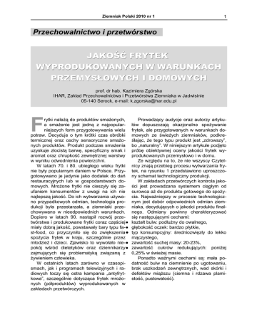 Ziemniak Polski 2010 nr 1 1 Przechowalnictwo i przetwórstwo JAKOŚĆ FRYTEK WYPRODUKOWANYCH W WARUNKACH PRZEMYSŁOWYCH I DOMOWYCH prof. dr hab. Kazimiera Zgórska IHAR, Zakład Przechowalnictwa i Przetwórstwa Ziemniaka w Jadwisinie 05-140 Serock, e-mail: [email protected] F rytki należą do produktów smażonych, a smażenie jest jedną z najpopularniejszych form przygotowywania wielu potraw. Decyduje o tym krótki czas obróbki termicznej oraz cechy sensoryczne smażonych produktów. Produkt podczas smażenia uzyskuje złocistą barwę, specyficzny smak i aromat oraz chrupkość zewnętrznej warstwy w wyniku odwodnienia powierzchni. W latach 70. i 80. ubiegłego wieku frytki nie były popularnym daniem w Polsce. Przygotowywano je jedynie jako dodatek do dań restauracyjnych lub w gospodarstwach domowych. Mrożone frytki nie cieszyły się zaufaniem konsumentów z uwagi na ich nie najlepszą jakość. Do ich wytwarzania używano przypadkowych odmian, technologia produkcji była przestarzała, a ziemniaki przechowywano w nieodpowiednich warunkach. Dopiero w latach 90. nastąpił rozwój przetwórstwa i produkowane frytki coraz częściej● miały dobrą jakość, powstawały bary typu fa-● st-food, co przyczyniło się do zwiększenia ● spożycia frytek w kraju, szczególnie przez młodzież i dzieci. Zjawisko to wywołało nie-● pokój wśród dietetyków oraz dziennikarzy● zajmujących się problematyką związaną z żywieniem człowieka. W ostatnich latach zarówno w czasopismach, jak i programach telewizyjnych i radiowych toczy się ostra kampania „antyfrytkowa”, szczególnie dotycząca frytek mrożonych (półproduktów) wyprodukowanych w zakładach przetwórczych. Prowadzący audycje oraz autorzy artykułów dopuszczają okazjonalne spożywanie frytek, ale przygotowanych w warunkach domowych ze świeżych ziemniaków, podkreślając, że tego typu produkt jest „zdrowszy”, bo „naturalny”. W niniejszym artykule podjęto próbę obiektywnej oceny jakości frytek wyprodukowanych przemysłowo i w domu. Ze względu na to, że nie wszyscy Czytelnicy znają przebieg procesu wytwarzania frytek, na rysunku 1 przedstawiono uproszczony schemat technologiczny produkcji. W zakładach przetwórczych kontrola jakości jest prowadzana systemem ciągłym od surowca aż do produktu gotowego do spożycia. Najważniejszy w procesie technologicznym jest dobór odpowiednich odmian ziemniaka, decydujących o jakości produktu finalnego. Odmiany powinny charakteryzować się następującymi cechami: kształt bulw: podłużny do owalnego, głębokość oczek: bardzo płytkie, typ konsumpcyjny: średniozwięzły do lekko mączystego, zawartość suchej masy: 20-23%, zawartość cukrów redukujących: poniżej 0,25% w świeżej masie. Ponadto ważnymi cechami są: mała podatność bulw na ciemnienie po ugotowaniu, brak uszkodzeń zewnętrznych, wad skórki i defektów miąższu (ciemna i rdzawa plamistość, pustowatość). 2 Ziemniak Polski 2010 nr 1 Rys. 1. Schemat technologiczny produkcji frytek Do czynników surowcowych kształtujących jakość frytek należą przede wszystkim zawartość suchej masy i skrobi oraz cukrów redukujących (Zgórska 2005). Poziom zawartości suchej masy i skrobi decyduje o teksturze i konsystencji frytek (chrupkość i struktura miąższu) oraz pochłanianiu tłuszczu przez produkt. Niektórzy autorzy zwracają ponadto uwagę na rolę błonnika w kształtowaniu struktury frytek (Rytel i in. 2006). Do zabiegów technologicznych wpływających na te cechy należy blanszowanie (przetrzymywanie krajanki w wodzie o określonej temperaturze – rys. 1) oraz podsuszanie, czyli usuwanie nadmiaru wody i zwiększanie suchej substancji w krajance. Zawartość cukrów redukujących w bulwach wpływa na barwę frytek gotowych do spożycia. Zbyt wysoka ich zawartość w surowcu powoduje brunatnienie produktu, zmianę jego smaku i zapachu oraz ogranicza trwałość przechowalniczą frytek mrożo- nych. Zmiany te są spowodowane reakcją Maillarda. W wyniku tej reakcji oprócz zmian wymienionych powyżej powstają również niebezpieczne dla zdrowia akrylamidy. Ostatnio w jednej z audycji radiowej dotyczącej zdrowego odżywiania autorka sugerowała, że frytki smażone są w oleju mineralnym. Otóż nieprawda. Zakłady używają jedynie tłuszczów roślinnych, których jakość jest ciągle kontrolowana zarówno w smażalniku, jak i w produkcie. Ponadto przeprowadzane są badania zawartości akrylamidów we frytkach gotowych do spożycia, a partie nie odpowiadające wymaganiom są wycofywane z obrotu. Przedstawiony na rysunku 1 schemat otrzymywania frytek jest uproszczony, ponieważ zakłady wprowadzają różne parametry blanszowania i suszenia w zależności od jakości surowca i technologii produkcji. W warunkach domowych frytki przygotowuje się metodą uproszczoną i najczęściej jednofazową. Spośród odmian popularnych 3 Ziemniak Polski 2010 nr 1 w danym rejonie kraju konsument wybiera najczęściej te o większych bulwach. Po wstępnej obróbce (mycie, obieranie) i pokrojeniu w słupki smaży je w oleju roślinnym. Są dwa sposoby smażenia: w gospodarstwach domowych wyposażonych we frytkownice nastawia się temperaturę wskazaną jako odpowiednia do smażenia frytek, a w gospodarstwach, w których brak takich urządzeń, smaży się je po prostu w garnku lub głębokiej patelni. Najczęściej wkłada się zbyt dużo frytek w stosunku do objętości oleju, co powoduje zmniejszenie temperatury. Początkowa faza jest więc gotowaniem w tłuszczu, a dopiero po pewnym czasie następuje smażenie. I właśnie w tej pierwszej fazie frytki wchłaniają najwięcej tłuszczu. Dodatkowo zawartość tłuszczu we frytkach może się zwiększyć, jeżeli używamy ziemniaków o małej zawartości suchej masy. Często w okresie zimowym i wiosennym ziemniaki oferowane w handlu zawierają ok. 0,5-0,6% cukrów redukujących. Jest to zrozumiałe, gdyż ziemniaki jadalne p