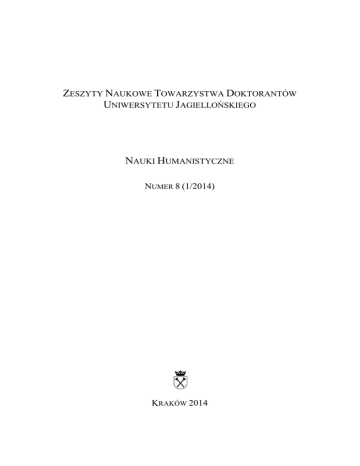 ZESZYTY NAUKOWE TOWARZYSTWA DOKTORANTÓW UNIWERSYTETU JAGIELLOŃSKIEGO NAUKI HUMANISTYCZNE NUMER 8 (1/2014) KRAKÓW 2014 SPIS TREŚCI Olga S z m i d t . . . . . . . . . . . . . . . . . . . . . . . . . . . . . . . . . . 9 Inne możliwości, inne zapomnienia. Polska krytyka literacka i czesanie historii pod włos Paweł K o z ł o w s k i . . . . . . . . . . . . . . . . . . . . . . . . . . . . . . 21 Poetyka epifanii Jamesa Joyce’a na przykładzie Modlitwy Anna S t e c - J a s i k . . . . . . . . . . . . . . . . . . . . . . . . . . . . . . 37 Kramarski kosmos. Kilka uwag o przedmiotach w twórczości Zbigniewa Herberta i Jana Vermeera Anna K u c h t a . . . . . . . . . . . . . . . . . . . . . . . . . . . . . . . . . 51 W poszukiwaniu straconego miasta. Lwów, Gliwice, Kraków w esejach Adama Zagajewskiego Ewa C h u d o b a . . . . . . . . . . . . . . . . . . . . . . . . . . . . . . . . 69 Ewolucjonizmy w estetyce i ich konsekwencje Judith Ester C o h n L e v i . . . . . . . . . . . . . . . . . . . . . . . . . . 89 Kidusz HaSzem i Kidusz HaChaim w żydowskiej myśli syjonistycznej i religijnej na przykładzie Elie Wiesela oraz rabina Efraima Oshry’ego Krzysztof S i e l s k i . . . . . . . . . . . . . . . . . . . . . . . . . . . . . . . 103 Porównanie poglądów Karla Poppera, Zygmunta Baumana i Leszka Kołakowskiego w kwestii społeczeństwa otwartego Aleksandra M r ó w k a . . . . . . . . . . . . . . . . . . . . . . . . . . . . . The Anglo-Saxon Transformations of the Biblical Themes in the Old English Poem The Dream of the Rood 125 Fryderyk K w i a t k o w s k i . . . . . . . . . . . . . . . . . . . . . . . . . . 137 „Stupid Fucking White Man”? Antropologiczne ujęcie przemiany wewnętrznej głównego bohatera Truposza (1995) Jima Jarmuscha Magdalena H o ł y - Ł u c z a j . . . . . . . . . . . . . . . . . . . . . . . . . 155 Recenzja książki: Nancy J. Holland, Ontological Humility. Lord Voldemort and the Philosophers Magdalena T e n d e r a . . . . . . . . . . . . . . . . . . . . . . . . . . . . 161 Recenzja książki: Samuel Nowak, Seksualny kapitał. Wyobrażone wspólnoty smaku i medialne tożsamości polskich gejów Noty o autorach . . . . . . . . . . . . . . . . . . . . . . . . . . . . . . . . . 165 CONTENTS Olga S z m i d t . . . . . . . . . . . . . . . . . . . . . . . . . . . . . . . . . . 9 Other Possibilities, Other Oblivions. Polish Literary Criticism and History Against the Grain Paweł K o z ł o w s k i . . . . . . . . . . . . . . . . . . . . . . . . . . . . . . 21 Poetics of Epiphany in James Joyce’s Poem A Prayer Anna S t e c - J a s i k . . . . . . . . . . . . . . . . . . . . . . . . . . . . . . 37 Diverse Universe. A Few Thoughts on Objects in Herbert’s and Vermeer’s Works Anna K u c h t a . . . . . . . . . . . . . . . . . . . . . . . . . . . . . . . . . 51 In Search of a Lost City. Lviv, Gliwice And Cracow in Adam Zagajewski’s Essays Ewa C h u d o b a . . . . . . . . . . . . . . . . . . . . . . . . . . . . . . . . 69 Evolutionary Inspirations in Aesthetics and Their Consequences Judith Ester C o h n L e v i . . . . . . . . . . . . . . . . . . . . . . . . . . 89 Kidush HaShem and Kidusz HaHayyim During the Holocaust in the Jewish Zionist and Religious Thought (Elie Wiesel, Ephraim Oshry) Krzysztof S i e l s k i . . . . . . . . . . . . . . . . . . . . . . . . . . . . . . . 103 Comparison of the Views of Karl Popper, Zygmunt Bauman and Leszek Kołakowski on the Open Society Aleksandra M r ó w k a . . . . . . . . . . . . . . . . . . . . . . . . . . . . . The Anglo-Saxon Transformations of the Biblical Themes in the Old English Poem The Dream of the Rood 125 Fryderyk K w i a t k o w s k i . . . . . . . . . . . . . . . . . . . . . . . . . . 137 „Stupid Fucking White Man?” Anthropological Approach to Main Character’s Transformation in Jim Jarmusch’s Dead Man (1995) Magdalena H o ł y - Ł u c z a j . . . . . . . . . . . . . . . . . . . . . . . . . 155 Book Review: Nancy J. Holland, Ontological Humility. Lord Voldemort and the Philosophers Magdalena T e n d e r a . . . . . . . . . . . . . . . . . . . . . . . . . . . . 161 Book Review: Samuel Nowak, Seksualny kapitał. Wyobrażone wspólnoty smaku i medialne tożsamości polskich gejów Notes on Authors . . . . . . . . . . . . . . . . . . . . . . . . . . . . . . . . 165