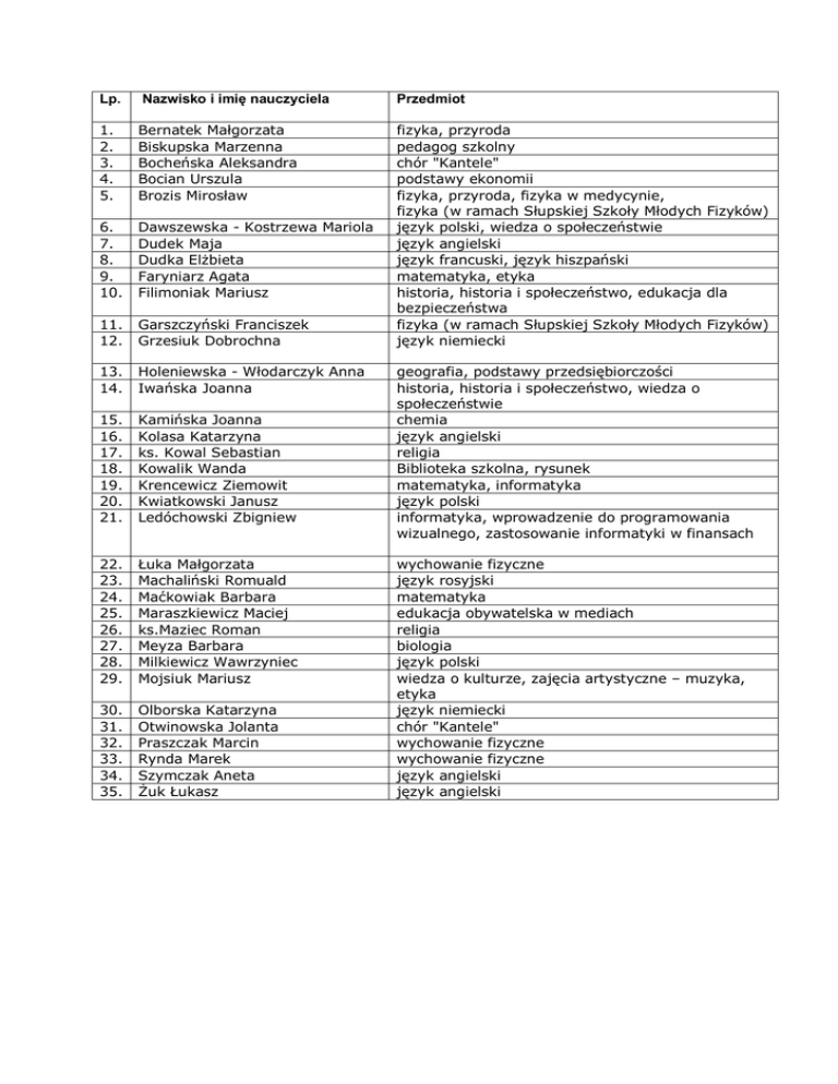 Lp. Nazwisko i imię nauczyciela Przedmiot 1. 2. 3. 4. 5. Bernatek Małgorzata Biskupska Marzenna Bocheńska Aleksandra Bocian Urszula Brozis Mirosław 6. 7. 8. 9. 10. Dawszewska - Kostrzewa Mariola Dudek Maja Dudka Elżbieta Faryniarz Agata Filimoniak Mariusz 11. 12. Garszczyński Franciszek Grzesiuk Dobrochna fizyka, przyroda pedagog szkolny chór "Kantele" podstawy ekonomii fizyka, przyroda, fizyka w medycynie, fizyka (w ramach Słupskiej Szkoły Młodych Fizyków) język polski, wiedza o społeczeństwie język angielski język francuski, język hiszpański matematyka, etyka historia, historia i społeczeństwo, edukacja dla bezpieczeństwa fizyka (w ramach Słupskiej Szkoły Młodych Fizyków) język niemiecki 13. 14. Holeniewska - Włodarczyk Anna Iwańska Joanna 15. 16. 17. 18. 19. 20. 21. Kamińska Joanna Kolasa Katarzyna ks. Kowal Sebastian Kowalik Wanda Krencewicz Ziemowit Kwiatkowski Janusz Ledóchowski Zbigniew 22. 23. 24. 25. 26. 27. 28. 29. Łuka Małgorzata Machaliński Romuald Maćkowiak Barbara Maraszkiewicz Maciej ks.Maziec Roman Meyza Barbara Milkiewicz Wawrzyniec Mojsiuk Mariusz 30. 31. 32. 33. 34. 35. Olborska Katarzyna Otwinowska Jolanta Praszczak Marcin Rynda Marek Szymczak Aneta Żuk Łukasz geografia, podstawy przedsiębiorczości historia, historia i społeczeństwo, wiedza o społeczeństwie chemia język angielski religia Biblioteka szkolna, rysunek matematyka, informatyka język polski informatyka, wprowadzenie do programowania wizualnego, zastosowanie informatyki w finansach wychowanie fizyczne język rosyjski matematyka edukacja obywatelska w mediach religia biologia język polski wiedza o kulturze, zajęcia artystyczne – muzyka, etyka język niemiecki chór "Kantele" wychowanie fizyczne wychowanie fizyczne język angielski język angielski